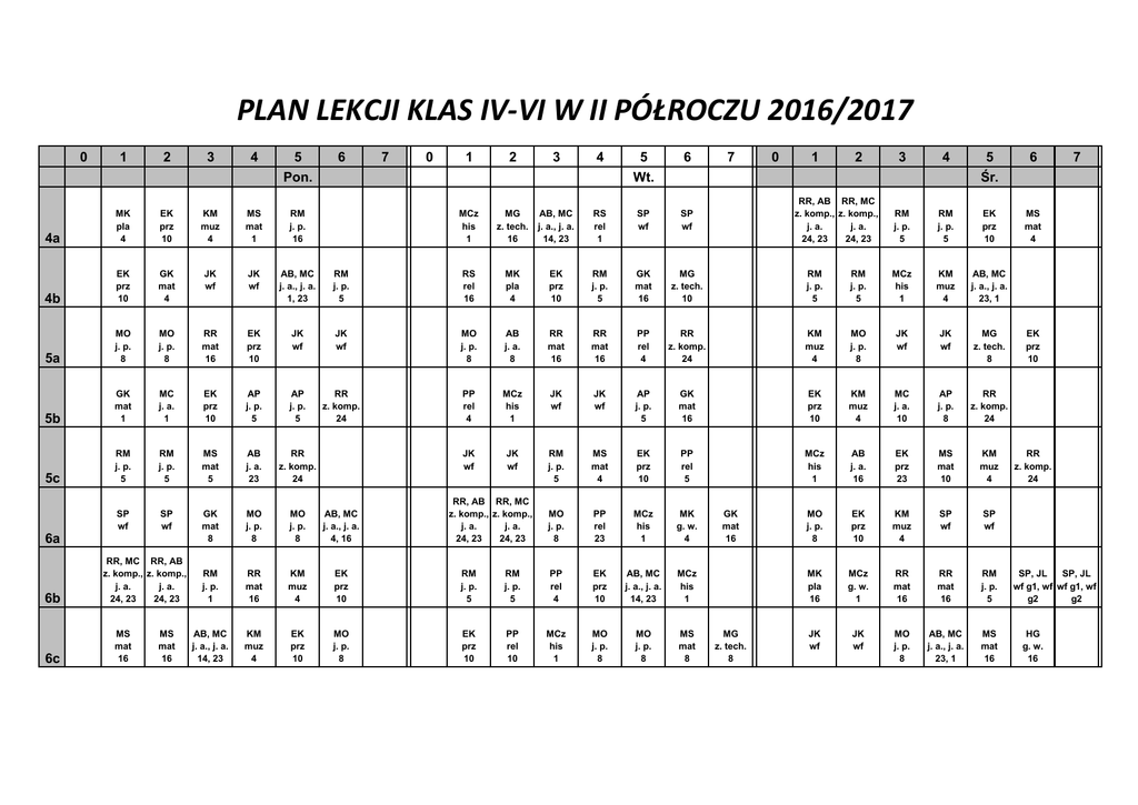 PLAN LEKCJI KLAS IV-VI W II PÓŁROCZU 2016/2017 0 1 2 3 4 5 6 7 0 1 2 3 4 Pon. 4a MK pla 4 EK prz 10 KM muz 4 MS mat 1 RM j. p. 16 GK mat 4 JK wf JK wf 4b EK prz 10 AB, MC j. a., j. a. 1, 23 5a MO j. p. 8 MO j. p. 8 RR mat 16 EK prz 10 5b GK mat 1 MC j. a. 1 EK prz 10 5c RM j. p. 5 RM j. p. 5 SP wf SP wf 6a 6b 6c RR, MC RR, AB z. komp., z. komp., j. a. j. a. 24, 23 24, 23 MS mat 16 MS mat 16 5 6 7 0 1 2 3 4 6 7 Śr. Wt. RR, AB RR, MC z. komp., z. komp., j. a. j. a. 24, 23 24, 23 MCz his 1 MG z. tech. 16 AB, MC j. a., j. a. 14, 23 RS rel 1 SP wf SP wf RM j. p. 5 RS rel 16 MK pla 4 EK prz 10 RM j. p. 5 GK mat 16 MG z. tech. 10 RM j. p. 5 JK wf JK wf MO j. p. 8 AB j. a. 8 RR mat 16 RR mat 16 PP rel 4 RR z. komp. 24 AP j. p. 5 AP j. p. 5 RR z. komp. 24 PP rel 4 MCz his 1 JK wf JK wf AP j. p. 5 MS mat 5 AB j. a. 23 RR z. komp. 24 JK wf JK wf RM j. p. 5 MS mat 4 GK mat 8 MO j. p. 8 MO j. p. 8 AB, MC j. a., j. a. 4, 16 MO j. p. 8 RM j. p. 1 RR mat 16 KM muz 4 EK prz 10 RM j. p. 5 RM j. p. 5 AB, MC j. a., j. a. 14, 23 KM muz 4 EK prz 10 MO j. p. 8 EK prz 10 PP rel 10 RR, AB RR, MC z. komp., z. komp., j. a. j. a. 24, 23 24, 23 5 RM j. p. 5 RM j. p. 5 EK prz 10 RM j. p. 5 MCz his 1 KM muz 4 AB, MC j. a., j. a. 23, 1 KM muz 4 MO j. p. 8 JK wf JK wf MG z. tech. 8 GK mat 16 EK prz 10 KM muz 4 MC j. a. 10 AP j. p. 8 RR z. komp. 24 EK prz 10 PP rel 5 MCz his 1 AB j. a. 16 EK prz 23 MS mat 10 KM muz 4 PP rel 23 MCz his 1 MK g. w. 4 MO j. p. 8 EK prz 10 KM muz 4 SP wf SP wf PP rel 4 EK prz 10 AB, MC j. a., j. a. 14, 23 MCz his 1 MK pla 16 MCz g. w. 1 RR mat 16 RR mat 16 RM j. p. 5 MCz his 1 MO j. p. 8 MO j. p. 8 MS mat 8 JK wf JK wf MO j. p. 8 AB, MC j. a., j. a. 23, 1 MS mat 16 GK mat 16 MG z. tech. 8 MS mat 4 EK prz 10 RR z. komp. 24 SP, JL SP, JL wf g1, wf wf g1, wf g2 g2 HG g. w. 16 0 1 2 3 4 5 6 7 0 1 2 3 Czw. SP wf SP wf RM j. p. 5 SP g. w. 10 MS mat 16 EK prz 10 GK mat 10 RS rel 5 JK wf 4b EK g. w. 10 5a PP rel 4 MCz his 1 RR mat 8 AB j. a. 23 MC j. a. 4 JK wf 5b GK mat 16 5c MG z. tech. 8 RM j. p. 5 6a MCz his 1 6b RM j. p. 5 5 6 EK prz 10 AB, MC j. a., j. a. 14, 23 MS mat 8 AB, RR j. a., z. komp. 23, 24 MC, RR j. a., z. komp. 23, 24 GK mat 16 RM j. p. 1 RR z. komp. 24 MO j. p. 8 AB j. a. 1 RR mat 1 MK pla 23 EK prz 10 MO g. w. 8 JK wf PP rel 5 EK prz 10 MG z. tech. 5 MK pla 4 MC g. w. 5 AP j. p. 8 GK mat 16 MS mat 16 PP rel 8 EK prz 10 AB g. w. 23 MK pla 4 MS mat 16 JK wf JK wf AB j. a. 4 RM j. p. 5 GK mat 16 AB, MC j. a., j. a. 23, 14 EK prz 4 MO j. p. 8 PP rel 5 MG z. tech. 1 MO j. p. 8 EK prz 10 GK mat 16 GK mat 16 MK pla 4 PP rel 8 MCz his 1 RR mat 16 AB, MC j. a., j. a. 23, 1 AI wdż 4 RM j. p. 5 RR mat 4 MG z. tech. 1 EK prz 10 PP rel 4 MCz his 1 AI wdż 4 MO j. p. 8 MO j. p. 8 EK prz 10 JK wf JK wf RR, MC RR, AB z. komp., z. komp., j. a. j. a. 24, 23 24, 23 7 Pt. RS rel 5 4a 6c 4 JK wf AI wdż 4 SP, JL SP, JL wf g1, wf wf g1, wf g2 g2 MS mat 16 MK pla 4 RM j. p. 5 GK mat 16
