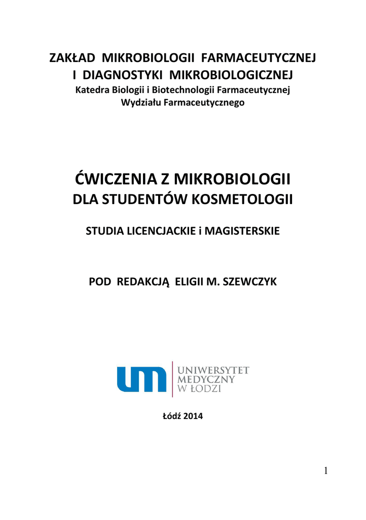 ZAKŁAD MIKROBIOLOGII FARMACEUTYCZNEJ I DIAGNOSTYKI MIKROBIOLOGICZNEJ Katedra Biologii i Biotechnologii Farmaceutycznej Wydziału Farmaceutycznego ĆWICZENIA Z MIKROBIOLOGII DLA STUDENTÓW KOSMETOLOGII STUDIA LICENCJACKIE i MAGISTERSKIE POD REDAKCJĄ ELIGII M. SZEWCZYK Łódź 2014 1 AUTORZY: Bożena Dudkiewicz Wioletta Kmieciak Anna Kwaszewska Paweł Lisiecki Maria Sobiś-Glinkowska Jadwiga Szarapińska-Kwaszewska Magdalena Szemraj Eligia M. Szewczyk Piotr Wysocki ISBN: 978-83-64344-05-3 Wydanie drugie zmienione 2 Część I Przedmiot: MIKROBIOLOGIA Studia licencjackie Rozdział 1 Morfologia drobnoustrojów………………………………………………………..…………7 Rozdział 2 Pożywki i hodowla drobnoustrojów…………………………………………….………23 Rozdział 3 Techniki posiewu bakterii na podłoża. Otrzymywanie czystych hodowli...............................................................................................33 Rozdział 4 Wymagania wzrostowe bakterii……………………………………………………..……41 Rozdział 5 Wykorzystanie cech biochemicznych bakterii do ich identyfikacji….……49 Rozdział 6 Dezynfekcja, antyseptyka, konserwacja………………………………………………59 Rozdział 7 Sterylizacja……………………………………………………………………………………….…75 Rozdział 8 Drobnoustroje bytujące na skórze………………………………………………….……83 Rozdział 9 Liczenie bakterii………………………………………………………………………………..…91 Rozdział 10 Czystość mikrobiologiczna gotowego produktu kosmetycznego……..…101 3 Część II Przedmiot: MIKROBIOLOGIA KLINICZNA Studia magisterskie Rozdział 1 Bakterie bytujące na skórze i błonach śluzowych………………..…….……111 Rozdział 2 Bakterie w przewodzie pokarmowym…………………………….…….……..…127 Rozdział 3 Inne bakterie bytujące w środowisku człowieka……………………….…… 147 Rozdział 4 Bakterie wywołujące choroby o swoistym przebiegu, trudne do hodowli lub identyfikacji…………….……………………………………….…….155 Rozdział 5 Mikologia ……………………………………………………………………….…….………..165 Rozdział 6 Podstawy wiedzy o antybiotykach i antybiotykoterapii …………….……177 4 CZĘŚĆ I PRZEDMIOT: MIKROBIOLOGIA STUDIA LICENCJACKIE 5 6 Rozdział 1 Morfologia drobnoustrojów Cześć teoretyczna Organizmy prokariotyczne i eukariotyczne Do mikroorganizmów (drobnoustrojów), którymi zajmuje się mikrobiologia zaliczamy wirusy, bakterie, archeony, grzyby (bez kapeluszowych), niektóre glony i pierwotniaki. Organizmy te różnią się przynależnością taksonomiczną. Bakterie należą do domeny Bacteria, archeony do domeny Archaea, a grzyby, glony i pierwotniaki do domeny Eukarya. W zależności od budowy mikroorganizmy dzielimy na: prokariotyczne i eukariotyczne. Do organizmów prokariotycznych zaliczamy - bakterie i archeony, a do eukariotycznych - grzyby, glony i pierwotniaki. Te dwie grupy organizmów prezentują dwa odmienne typy budowy komórki. Wirusy nie mogą być zaliczone do żadnej z wymienionych grup, gdyż nie mają struktury ani organizacji komórkowej. Bakterie są mikroorganizmami. Jednak nie wszystkie mikroorganizmy są bakteriami. Choroby u ludzi wywołują zarówno drobnoustroje prokariotyczne (bakterie), jak i eukariotyczne (grzyby i pierwotniaki). Organizmy eukariotyczne mogą być zbudowane z jednej lub wielu komórek. Wszystkie drobnoustroje prokariotyczne są organizmami jednokomórkowymi. Cechą charakterystyczną ich komórek jest brak jądra otoczonego błoną jądrową i jąderka. Ich materiał genetyczny w formie nukleoidu, będącego podwójną nicią DNA styka się bezpośrednio z cytoplazmą. Nie mają one również dobrze wykształconych organelli komórkowych i systemu błon wewnętrznych, takich jak retikulum endoplazmatyczne, czy aparat Golgiego. W komórkach prokariotycznych brak mitochondriów i lizosomów. Prawie wszystkie komórki prokariotyczne (poza bakteriami z rodziny Mycoplasmataceae) mają ścianę komórkową, która zawiera peptydoglikan. Rybosomy prokariotów są mniejsze niż eukariotów. Wykazują mniejszą masę cząsteczkową 7 i niższą stałą sedymentacji. Podstawowe różnice w budowie komórki i replikacji materiału genetycznego pomiędzy komórkami prokariotycznymi i eukariotycznymi przedstawiono w tabeli. Tabela 1. Podstawowe różnice w strukturze komórek prokariotycznych i eukariotycznych. Cecha Komórka prokariotyczna Komórka eukariotyczna DNA wolny zawieszony w zawarty w jądrze; cytoplazmie; stanowiący otoczonym błoną jądrową jeden chromosom Rozmnażanie tylko bezpłciowe przez podział komórek przez podział komórki mitozę; rozmnażanie płciowe z wytworzeniem gamet. Wymiana poprzez koniugację; w czasie rozmnażania materiału transdukcję i płciowego genetycznego transformację Rybosomy 70 S 80 S (cytoplazmatyczne), 70 S (mitochondrialne) Mitochondria brak obecne Układ błon brak retikulum wewnętrznych endoplazmatyczne; aparat Golgiego Ściana zawiera peptydoglikan u grzybów zawiera chitynę komórkowa mannany; glukany. Błona brak steroli (poza obecne sterole cytoplazmatyczna mikoplazmami) Wielkość i kształt komórek Bakterie wykazują znaczną rozpiętość wymiarów. Wymiar większości komórek bakteryjnych wynosi od 1 do 10 µm. Rozmiar najmniejszych 8 wynosi od 0,15 do 0,2 µm, co jest na granicy zdolności rozdzielczej mikroskopu świetlnego. Wymiar największych wynosi od 250 do 600 µm. Przeciętna długość komórki bakteryjnej to 1-5µm, a średnica od 1-2 µm. Komórki bakterii mogą przybierać różne kształty. Bakterie kuliste, nazywane także ziarenkowcami, mogą być ułożone pojedynczo lub tworzyć c