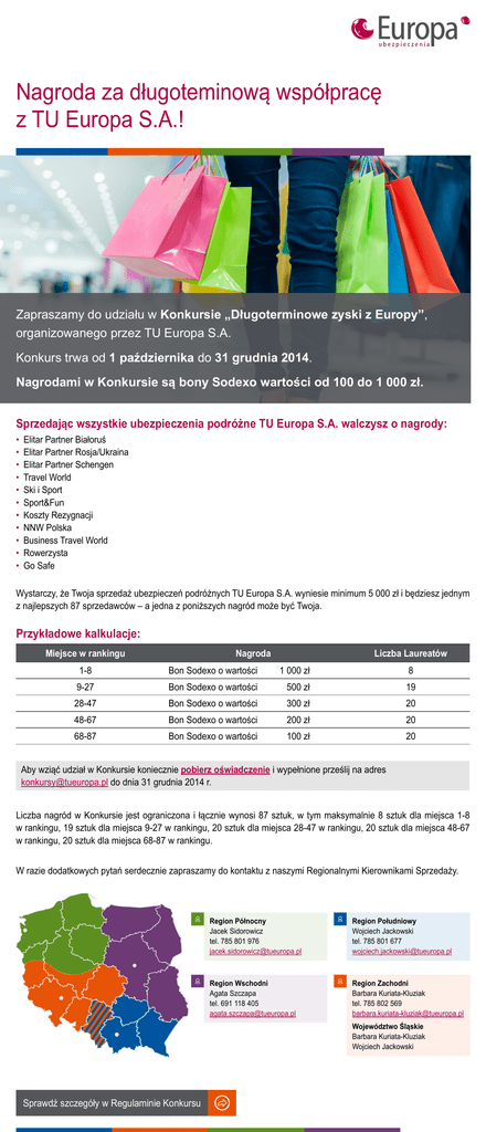 Nagroda za długoteminową współpracę z TU Europa S.A.! Zapraszamy do udziału w Konkursie „Długoterminowe zyski z Europy”, organizowanego przez TU Europa S.A. Konkurs trwa od 1 października do 31 grudnia 2014. Nagrodami w Konkursie są bony Sodexo wartości od 100 do 1 000 zł. Sprzedając wszystkie ubezpieczenia podróżne TU Europa S.A. walczysz o nagrody: • Elitar Partner Białoruś • Elitar Partner Rosja/Ukraina • Elitar Partner Schengen • Travel World • Ski i Sport • Sport&Fun • Koszty Rezygnacji • NNW Polska • Business Travel World • Rowerzysta • Go Safe Wystarczy, że Twoja sprzedaż ubezpieczeń podróżnych TU Europa S.A. wyniesie minimum 5 000 zł i będziesz jednym z najlepszych 87 sprzedawców – a jedna z poniższych nagród może być Twoja. Przykładowe kalkulacje: Miejsce w rankingu Nagroda Liczba Laureatów 1-8 Bon Sodexo o wartości 1 000 zł 8 9-27 Bon Sodexo o wartości 500 zł 19 28-47 Bon Sodexo o wartości 300 zł 20 48-67 Bon Sodexo o wartości 200 zł 20 68-87 Bon Sodexo o wartości 100 zł 20 Aby wziąć udział w Konkursie koniecznie pobierz oświadczenie i wypełnione prześlij na adres [email protected] do dnia 31 grudnia 2014 r. Liczba nagród w Konkursie jest ograniczona i łącznie wynosi 87 sztuk, w tym maksymalnie 8 sztuk dla miejsca 1-8 w rankingu, 19 sztuk dla miejsca 9-27 w rankingu, 20 sztuk dla miejsca 28-47 w rankingu, 20 sztuk dla miejsca 48-67 w rankingu, 20 sztuk dla miejsca 68-87 w rankingu. W razie dodatkowych pytań serdecznie zapraszamy do kontaktu z naszymi Regionalnymi Kierownikami Sprzedaży. Region Północny Jacek Sidorowicz tel. 785 801 976 [email protected] Region Południowy Wojciech Jackowski tel. 785 801 677 [email protected] Region Wschodni Agata Szczapa tel. 691 118 405 [email protected] Region Zachodni Barbara Kuriata-Kluziak tel. 785 802 569 [email protected] Województwo Śląskie Barbara Kuriata-Kluziak Wojciech Jackowski Sprawdź szczegóły w Regulaminie Konkursu