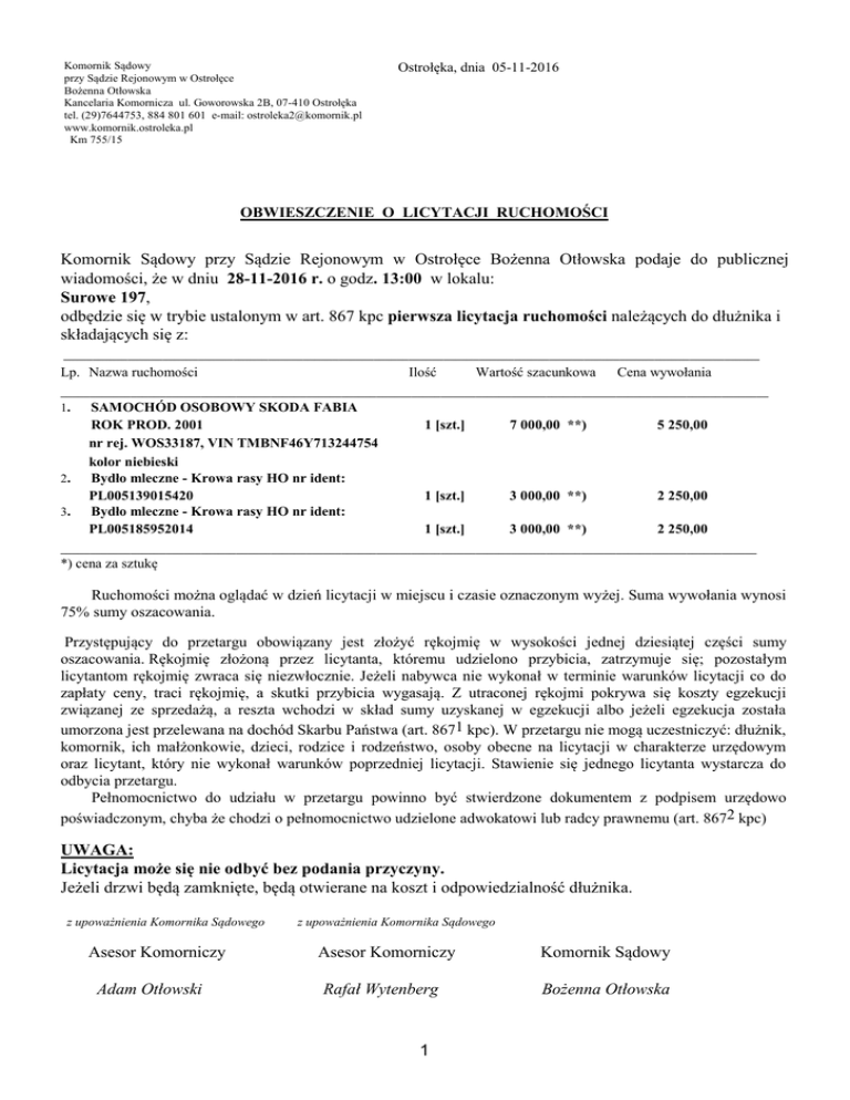 Komornik Sądowy przy Sądzie Rejonowym w Ostrołęce Bożenna Otłowska Kancelaria Komornicza ul. Goworowska 2B, 07-410 Ostrołęka tel. (29)7644753, 884 801 601 e-mail: [email protected] www.komornik.ostroleka.pl Km 755/15 Ostrołęka, dnia 05-11-2016 OBWIESZCZENIE O LICYTACJI RUCHOMOŚCI Komornik Sądowy przy Sądzie Rejonowym w Ostrołęce Bożenna Otłowska podaje do publicznej wiadomości, że w dniu 28-11-2016 r. o godz. 13:00 w lokalu: Surowe 197, odbędzie się w trybie ustalonym w art. 867 kpc pierwsza licytacja ruchomości należących do dłużnika i składających się z: _______________________________________________________________________________________________________________________ Lp. Nazwa ruchomości Ilość Wartość szacunkowa Cena wywołania _________________________________________________________________________________________________________________________ 1. 2. 3. SAMOCHÓD OSOBOWY SKODA FABIA ROK PROD. 2001 nr rej. WOS33187, VIN TMBNF46Y713244754 kolor niebieski Bydło mleczne - Krowa rasy HO nr ident: PL005139015420 Bydło mleczne - Krowa rasy HO nr ident: PL005185952014 1 [szt.] 7 000,00 **) 5 250,00 1 [szt.] 3 000,00 **) 2 250,00 1 [szt.] 3 000,00 **) 2 250,00 _______________________________________________________________________________________________________________________ *) cena za sztukę Ruchomości można oglądać w dzień licytacji w miejscu i czasie oznaczonym wyżej. Suma wywołania wynosi 75% sumy oszacowania. Przystępujący do przetargu obowiązany jest złożyć rękojmię w wysokości jednej dziesiątej części sumy oszacowania. Rękojmię złożoną przez licytanta, któremu udzielono przybicia, zatrzymuje się; pozostałym licytantom rękojmię zwraca się niezwłocznie. Jeżeli nabywca nie wykonał w terminie warunków licytacji co do zapłaty ceny, traci rękojmię, a skutki przybicia wygasają. Z utraconej rękojmi pokrywa się koszty egzekucji związanej ze sprzedażą, a reszta wchodzi w skład sumy uzyskanej w egzekucji albo jeżeli egzekucja została umorzona jest przelewana na dochód Skarbu Państwa (art. 8671 kpc). W przetargu nie mogą uczestniczyć: dłużnik, komornik, ich małżonkowie, dzieci, rodzice i rodzeństwo, osoby obecne na licytacji w charakterze urzędowym oraz licytant, który nie wykonał warunków poprzedniej licytacji. Stawienie się jednego licytanta wystarcza do odbycia przetargu. Pełnomocnictwo do udziału w przetargu powinno być stwierdzone dokumentem z podpisem urzędowo poświadczonym, chyba że chodzi o pełnomocnictwo udzielone adwokatowi lub radcy prawnemu (art. 8672 kpc) UWAGA: Licytacja może się nie odbyć bez podania przyczyny. Jeżeli drzwi będą zamknięte, będą otwierane na koszt i odpowiedzialność dłużnika. z upoważnienia Komornika Sądowego Asesor Komorniczy Adam Otłowski z upoważnienia Komornika Sądowego Asesor Komorniczy Rafał Wytenberg 1 Komornik Sądowy Bożenna Otłowska
