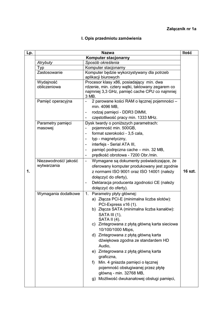 Załącznik nr 1a I. Opis przedmiotu zamówienia Lp. Atrybuty Typ Zastosowanie Wydajność obliczeniowa Pamięć operacyjna Parametry pamięci masowej Niezawodność/ jakość wytwarzania 1. Wymagania dodatkowe Nazwa Komputer stacjonarny Sposób określenia Komputer stacjonarny Komputer będzie wykorzystywany dla potrzeb aplikacji biurowych Procesor klasy x86, posiadający min. dwa rdzenie, min. cztery wątki, taktowany zegarem co najmniej 3,3 GHz, pamięć cache CPU co najmniej 3 MB. - 2 parowane kości RAM o łącznej pojemności – min. 4096 MB, - rodzaj pamięci - DDR3 DIMM, - częstotliwość pracy min. 1333 MHz. Dysk twardy o poniższych parametrach: - pojemność min. 500GB, - format szerokości - 3,5 cala, - typ - magnetyczny, - interfejs - Serial ATA III, - pamięć podręczna cache – min. 32 MB, - prędkość obrotowa - 7200 Obr./min. - Wymagane są dokumenty poświadczające, że oferowany komputer produkowany jest zgodnie z normami ISO 9001 oraz ISO 14001 (należy dołączyć do oferty), - Deklaracja producenta zgodności CE (należy dołączyć do oferty). 1. Parametry płyty głównej: a) Złącza PCI-E (minimalna liczba slotów): PCI-Express x16 (1). b) Złącza SATA (minimalna liczba kanałów): SATA III (1), SATA II (4). c) Zintegrowana z płytą główną karta sieciowa 10/100/1000 Mbps, d) Zintegrowana z płytą główną karta dźwiękowa zgodna ze standardem HD Audio, e) Zintegrowana z płytą główną karta graficzna, f) Min. 4 gniazda pamięci o łącznej pojemność obsługiwanej przez płytę główną - min. 32768 MB, g) Możliwość dwukanałowej obsługi pamięci, Ilość 16 szt. 2. 3. 4. 5. 6. 7. 8. 9. h) Porty zewnętrzne: - min. 1x RJ45, - min. 1x D-Sub, - min. 1x DVI-D, - min. 1x PS2, - min. 8x USB: min. 2x USB 3.0/2.0 (tylni panel), min. 4x USB 2.0/1.1 (tylni panel), 2x USB 2.0 (przedni panel obudowy) - porty audio (1x wejście mikrofonowe, 1x wyjście stereo, zdublowane na panelu przednim obudowy), i) BIOS zgodny ze specyfikacją UEFI. Nagrywarka DVD+/-RW DL (wbudowana do obudowy i dopasowana do niej kolorystycznie). Czytnik kart pamięci o poniższych parametrach: - odsługiwane karty pamięci: SD, miniSD, microSD; - wbudowana do przedniej części obudowy i dopasowany do niej kolorystycznie. Małowymiarowa obudowa komputera w kolorze ciemnym (czarnym lub szarym). Min. 2 porty USB oraz 1 port audio, zlokalizowane na przednim panelu obudowy. Boczna ścianka otwierana beznarzędziowo. Zasilacz do obudowy komputerowej o mocy min. 400W wyposażony w złącza zasilania min. 3x SATA, min. 1x Molex, uniwersalne złącze 20/24 pin do zasilania płyty głównej, uniwersalne złącze do zasilania CPU. Zabezpieczenia przeciwzwarciowe i przeciwprzepięciowe. Mysz optyczna USB, 2 przyciski, 1 rolka przewijania, rozdzielczość pracy min. 800 dpi, kolor czarny. Podkładka pod mysz optyczną. Klawiatura USB typu QWERTY w kolorze czarnym (układ polski programisty, konieczne występowanie dwóch klawiszy ALT). Dodatkowe informacje: a) Zainstalowany system operacyjny Windows 7 Professional PL OEM 32Bit SP1 lub równoważny (opis równoważności znajduje się w rozdz. II), - dołączona licencja systemu operacyjnego, - dołączony nośnik systemu – DVD, Atrybuty Typ Zastosowanie Wydajność obliczeniowa Pamięć operacyjna 2. Parametry pamięci masowej Niezawodność/ jakość wytwarzania b) Każdy komputer powinien posiadać swój niepowtarzalny indywidualny numery SID systemu operacyjnego, c) Zainstalowane oprogramowanie do nagrywarki w języku polskim, - dołączony nośnika – DVD lub CD, d) Zainstalowany na każdym komputerze pakiet biurowy z pozycji nr 7 wraz z przeprowadzeniem pełnej aktywacji produktu, e) Dysk twardy podzielony na dwie partycje w tym systemową o pojemności 100GB, f) Dołączony oraz zainstalowany komplet wszystkich sterowników niezbędnych do poprawnej pracy zainstalowanego systemu operacyjnego, g) Dołączony do komputera kabel zasilający, h) Dostarczona i dołączona do oferty dokumentacja techniczna oferowanego sprzętu. i) Dostarczony komputer powinien być fabrycznie nowy. Komputer przenośny Sposób określenia Komputer przenośny Komputer przenośny będzie wykorzystywany dla potrzeb aplikacji biurowych Procesor klasy x86, posiadający min. dwa rdzenie, min. cztery wątki, zaprojektowany do pracy w komputerach przenośnych, taktowany zegarem co najmniej 2,6 GHz, pamięć cache CPU co najmniej 3 MB. - pamięć RAM o łącznej pojemności – min. 4096 MB, - rodzaj pamięci - DDR3, - częstotliwość pracy min. 1600 MHz. Dysk twardy o poniższych parametrach: - pojemność min. 750GB, - format szerokości - 2,5 cala, - prędkość obrotowa min. - 5400 Obr./min. - Wymagane są dokumenty poświadczające, że sprzęt jest produkowany zgodnie z normami ISO 9001 oraz ISO 14001 (należy dołączyć do oferty), - Deklaracja producenta zgodności CE (należy dołączyć do oferty), - Dokument poświadczający, że oferowany sprzęt jest produkowany zgodnie z normami Energy Star (należy dołączyć do oferty). 1 szt. Ekran Wymagania dodatkowe Ekran komputera przenośnego powinien posiadać: - przekątną min. 17,3 cala, rozdzielczość nominalna min. 1600 x 900 (16:9), 1. Parametry notebooka: a) Konieczność posiadania urządzenia wskazującego zintegrowanego z komputerem typu Touch-Pad z funkcją Multi-Touch, b) Zintegrowana karta sieciowa 10/100/1000 Mbps Ethernet RJ 45, c) Zintegrowana karta sieciowa (Wi-Fi) w postaci wewnętrznego modułu notebooka obsługująca standardy IEEE 802.11b/g/n (do 150 Mb/s), d) Zintegrowana karta dźwiękowa obsługująca format: Stereo 24 bity. Wbudowane głośniki stereofoniczne, e) Zintegrowana karta graficzna, f) Zintegrowana kamera HD wraz z wbudowanym mikrofonem, g) Zintegrowany Bluetooth 4.0, h) Porty zewnętrzne wbudowane w sposób trwały: - min. 1x RJ45 LAN, - min. 1x HDMI, - min. 1x D-Sub, - min. 3x USB (w tym min. 1x USB 3.0), - min. 1x COMBO audio jack. 2. Wbudowany napęd optyczny DVD Sup