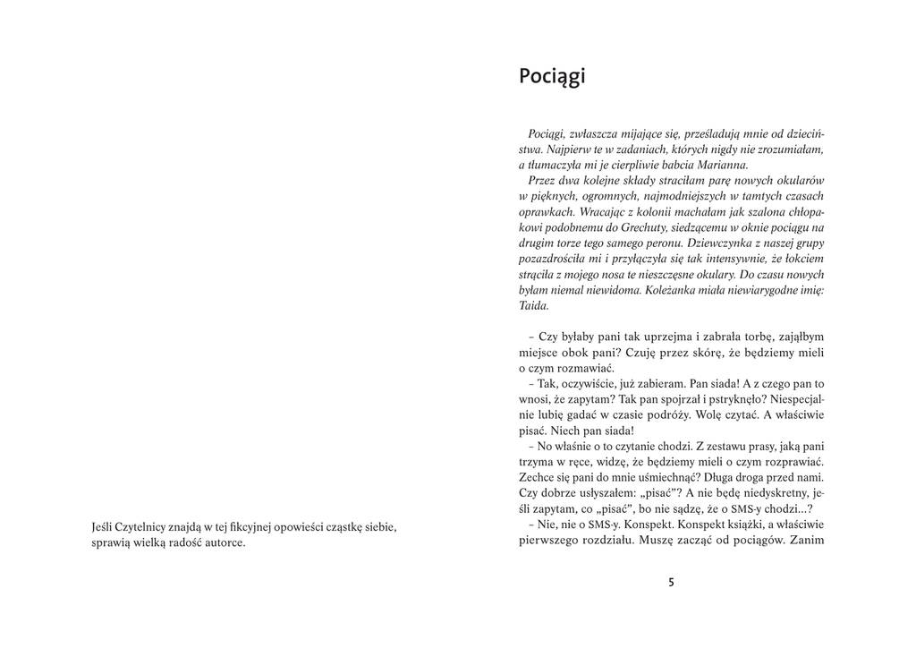 Pociągi Pociągi, zwłaszcza mijające się, prześladują mnie od dzieciń stwa. Najpierw te w zadaniach, których nigdy nie zrozumiałam, a tłumaczyła mi je cierpliwie babcia Marianna. Przez dwa kolejne składy straciłam parę nowych okularów w pięknych, ogromnych, najmodniejszych w tamtych czasach oprawkach. Wracając z kolonii machałam jak szalona chłopa kowi podobnemu do Grechuty, siedzącemu w oknie pociągu na drugim torze tego samego peronu. Dziewczynka z naszej grupy pozazdrościła mi i przyłączyła się tak intensywnie, że łokciem strąciła z mojego nosa te nieszczęsne okulary. Do czasu nowych byłam niemal niewidoma. Koleżanka miała niewiarygodne imię: Taida. Jeśli Czytelnicy znajdą w tej fikcyjnej opowieści cząstkę siebie, sprawią wielką radość autorce. – Czy byłaby pani tak uprzejma i zabrała torbę, zająłbym miejsce obok pani? Czuję przez skórę, że będziemy mieli o czym rozmawiać. – Tak, oczywiście, już zabieram. Pan siada! A z czego pan to wnosi, że zapytam? Tak pan spojrzał i pstryknęło? Niespecjalnie lubię gadać w czasie podróży. Wolę czytać. A właściwie pisać. Niech pan siada! – No właśnie o to czytanie chodzi. Z zestawu prasy, jaką pani trzyma w ręce, widzę, że będziemy mieli o czym rozprawiać. Zechce się pani do mnie uśmiechnąć? Długa droga przed nami. Czy dobrze usłyszałem: „pisać”? A nie będę niedyskretny, jeśli zapytam, co „pisać”, bo nie sądzę, że o sms-y chodzi…? – Nie, nie o sms-y. Konspekt. Konspekt książki, a właściwie pierwszego rozdziału. Muszę zacząć od pociągów. Zanim 5 dojadę do Warszawy, mam skończyć ten nieszczęsny rozdział, a dopiero ruszyłam. To, jakby pan tak mógł trochę pomilczeć, byłabym wdzięczna. Potem pogadamy. Pomilczy pan? – Pomilczę, ale nie mogę powstrzymać się przed zadaniem jednego pytania, tylko jednego. Czy pozwoli mi pani? – Pytaj pan, pozwalam! – Co to za perfum? Ten zapach przepiękny przywodzi mi na myśl cudowne wspomnienia. Chciałbym wiedzieć, czy to ten sam bukiet… – To nie perfum, a perfumy. Bukiet? Owoce cytrusowe, a nazwy nie mogę wymienić… bo nie pamiętam. Gada pan jak mój wujek z poznańskiego. Pełno ozdobników, jakby miał pan strasznie dużo czasu. A ja nie mam. Wracam do pisania. Ale miło, że pan zauważył ten, jak to pan nazwał… „bukiet”! – Bo ja, droga pani, jestem z Poznania. Przepraszam, nie przedstawiłem się: Szraube, pisane po polsku. Stefan Szraube. – Miło mi. Michalina Nowicka. – Już nie przeszkadzam, pani Michalino, zaczekam na przerwę w pisaniu, jeśli pani będzie tak uprzejma i pozwoli. – Pozwolę. Pan zamknie to okno, bo strasznie wieje! Dziękuję! – O, uśmiechnęła się pani, jakże mi miło. pokoju. A nad nim jeździło, dzwoniło, dudniło, dawało sygnały jak na prawdziwych stacjach, dworcach i trasach kolejowych. Pociągi Ludwika były punktualne, zawsze czyste, szybkie, zdy scyplinowane i piękne. I fantastycznie gwizdały, puszczając parę. Nigdy ich nie cho wano. Ludwik musiał się dostosować do sytuacji, dlatego spał pod torami na materacu. Kolejny pociąg odjechał. I zabrał mi go, chociaż Orest nigdy nie był tak naprawdę mój. Ale mógł być. Nieprawdopodobnie przystojny, starszy o pięć lat, z klasy mojego brata. Niby nie trak tował mnie poważnie, zresztą jak wszyscy koledzy Marka, ale łapałam jego wzrok wtedy, gdy sądził, że nie patrzę. Miał w koń cu – jak Marek – siedemnaście lat. Odprowadzaliśmy go, gdy wyjeżdżał z matką na placówkę zagraniczną. Machał do mnie jak kiedyś ten grechutkowy z pociągu naprzeciwko. Został na Zachodzie z rodzicami. Ot, tyle z pierwszej miłości. Taida… Cholera, nie wiem, czy dam radę przypomnieć sobie jeszcze jakieś historie z pociągami. Niesamowity ten facet z Po znania. Mówi jak wujek Leon. Człowiek zaczyna czuć się lepiej, jakoś tak bezpiecznie. U nas w Warszawie mało atencji w roz mowie. Dobra, lecimy z tym koksem. Pociągi zabawki to hobby Ludwika, mojego dalekiego kuzy na. Już samo imię determinuje pasję. Ludwik spał pod torami, zajmującymi specjalne stoły – podpory rozmieszczone po całym – Przepraszom wos, znojńdzie sie jake wolne miyjsce? Trza co by moja kobita się sam siadła, jadymy daleko, a łona licho się czuje. – Ależ oczywiście, zapraszamy uprzejmie, są jeszcze dwa wolne miejsca, będzie nam niezmiernie miło gościć państwa w naszym przedziale. – Gita, poć sam! Padajom, co je tu plac, zicnij sie kole dźwiyrzy. Jak ci bydzie gorzij wylezymy do łokna. Mogą pomknońc tyn kofer, wsadza sie sam nasza tasia… – Już przesuwam bagaż naszej pisarki, nie obrazi się pani, jeśli zrobię miejsce na walizkę państwa? Ale pan pięknie mówi gwarą śląską, moja ciotka jest Ślązaczką, nasiąkłem tą mową w dzieciństwie. Jestem z Wielkopolski. 6 7