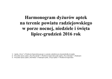 Harmonogram dyżurów aptek na terenie powiatu radziejowskiego w porze nocnej, niedziele i święta lipiec-grudzień 2016 rok 1) Apteka „Nowa” w Piotrkowie Kujawskim pracuje w systemie całodobowym od poniedziałku do piątku 2) Wszystkie dyżury apteki „Przy Przychodni” w Piotrkowie Kujawskim pełni apteka „Przy Eskulapie” w Radziejów 3) Wszystkie dyżury apteki „Pod Orłem” w Radziejów pełni „Twoja Apteka” w Piotrkowie Kujawskim Harmonogram dyżurów aptek na terenie powiatu radziejowskiego w porze nocnej, niedziele i święta LIPIEC 2016 1.07.2016. 2.07.2016. 3.07.2016. 4.07.2016. 5.07.2016. 6.07.2016. 7.07.2016. 8.07.2016. 9.07.2016. 10.07.2016. 11.07.2016. 12.07.2016. 13.07.2016. 14.07.2016. 15.07.2016. 16.07.2016. 17.07.2016. 18.07.2016. 19.07.2016. Dzień tygodnia Piątek Sobota Niedziela Poniedziałek Worek Środa Czwartek Piątek Sobota Niedziela Poniedziałek Wtorek Środa Czwartek Piątek Sobota Niedziela Poniedziałek Wtorek Godziny dyżurów 20oo-8oo 2200-900 19oo-8oo 20oo-8oo 20oo-800 20oo-8oo 20oo-8oo 20oo-8oo 22oo-9oo 19oo-8oo 20oo-8oo 20oo-8oo 20oo-8oo 20oo-8oo 20oo-8oo 22oo-9oo 19oo-8oo 20oo-8oo 20oo-8oo Apteka (nazwa, adres) ,,Nowa,, ul. 1 Maja 14, 88-230 Piotrków Kuj Apteka ,,Malwa,,ul. Lipowa 2, 88-210 Dobre Apteka,, Społeczna,, ul. Brzeska25 , 88-200 Radziejów ,,Nowa,,ul. 1 Maja 14, 88-230 Piotrków Kuj. ,,Nowa,, ul. 1 Maja 14, 88-230 Piotrków kuj. ,,Nowa,, ul. 1 Maja 14, 88-230 Piotrków Kuj. ,,Nowa,, ul. 1 Maja 14, 88-230 Piotrków Kuj ,,Nowa,, ul. 1 Maja 14, 88-230 Piotrków Kuj. Apteka ,,Przy Dworcu,, ul. Brzeska 28 11, 88-200 Radziejów Apteka,,Tara,, ul. Plac Boh. Warszawy 11, 88-220 Osięciny ,,Nowa,, ul. 1 Maja 14, 88-230 Piotrków Kuj. ,,Nowa,, ul. 1 Maja 14, 88-230 Piotrków Kuj. ,,Nowa,, ul. 1 Maja 14, 88-230 Piotrków Kuj. ,,Nowa,, ul. 1 Maja 14, 88-230 Piotrków Kuj ,,Nowa,, ul. 1 Maja 14, 88-230 Piotrków Kuj. Paliwoda Aleksandra, Apteka, 87-875 Topólka ,,Pod Magnolią,, ul. Poznańska 18, 88-230 Piotrków Kuj. ,,Nowa,, ul. 1 Maja 14, 88-230 Piotrków Kuj. ,,Nowa,, ul. 1 Maja 14, 88-230 Piotrków Kuj. (54)265-51-36 503 177 133 (54)234-35-33 (54)265-51-36 (54)265-51-36 (54)265-51-36 (54)265-51-36 (54)265-51-36 (54)285 -33-15 (54)265-13-08 (54)265-51-36 (54)265-51-36 (54)265-51-36 (54)265-51-36 (54)265-51-36 (54)286-90-96 (54)265-40-43 (54)265-51-36 (54)265-51-36 20.07.2016 21.07.2016. 22.07.2016. 23.07.2016. 24.07.2016. 25.07.2016. 26.07.2016. 27.07.2016. 28.07.2016. 29.07.2016. 30.07.2016. 31.07.2016. Środa Czwartek Piątek Sobota Niedziela Poniedziałek Wtorek Środa Czwartek Piątek Sobota Niedziela 20oo-8oo 20oo-8oo 20oo-8oo 22oo-9oo 19oo-8oo 20oo-8oo 20oo-8oo 20oo-8oo 20oo-8oo 20oo-8oo 22oo-9oo 19oo-8oo ,,Nowa,, ul. 1 Maja 14, 88-230 Piotrków Kuj. ,,Nowa,, ul. 1 Maja 14, 88-230 Piotrków Kuj. ,,Nowa,,ul. 1 Maja 14, 88-230 Piotrków Kuj. Apteka,, Kujawska,,ul. Wyszyńskiego 22, 88-220 Osięciny Apteka,,Pharmacon,, Czołowo104, 88-200Radziejów ,,Nowa,,ul. 1 Maja 14, 88-230 Piotrków Kuj. ,,Nowa,, ul. 1 Maja 14, 88-230 Piotrków Kuj. ,,Nowa,, ul. 1 Maja 14, 88-230 Piotrków Kuj. ,,Nowa,, ul. 1 Maja 14, 88-230 Piotrków Kuj. ,,Nowa,, ul. 1 Maja 14, 88-230 Piotrków Kuj. Apteka ,,Salus,,ul. Plac Boh.Warszawy 6/3 88-230 Osięciny Apteka ,,Agawa,, ul. Fabryczna 1, 88-200 Dobre (54)265-51-36 (54)265-51-36 (54)265-51-36 (54)265-00-10 (54)285-44-20 (54)265-51-36 (54)265-51-36 (54)265-51-36 (54)265-51-36 (54)265-51-36 (54)265-01-75 (54)285-04-23 Data telefon Harmonogram dyżurów aptek na terenie powiatu radziejowskiego w porze nocnej, niedziele i święta SIERPIEŃ 2016 1.08.2016. 2.08.2016. 3.08.2016. 4.08.2016. 5.08.2016. 6.08.2016. 7.08.2016. 8.08.2016. 9.08.2016. 10.08.2016. 11.08.2016. 12.08.2016. 13.08.2016. 14.08.2016. 15.08.2016. 16.08.2016. 17.08.2016. 18.08.2016. 19.08.2016. Dzień tygodnia Poniedziałek Wtorek Środa Czwartek Piątek Sobota Niedziela Poniedziałek Wtorek Środa Czwartek Piątek Sobota Niedziela Poniedziałek Wtorek Środa Czwartek Piątek Godziny dyżurów 20oo-8oo 2000-800 20oo-8oo 20oo-8oo 20oo-800 22oo-9oo 19oo-8oo 22oo-8oo 20oo-8oo 20oo-8oo 20oo-8oo 20oo-8oo 22oo-9oo 19oo-8oo 8oo-8oo 20oo-8oo 20oo-8oo 20oo-8oo 20oo-8oo Apteka (nazwa, adres) ,,Nowa,, ul. 1 Maja 14, 88-230 Piotrków Kuj ,,Nowa,, ul. 1 Maja 14, 88-230 Piotrków Kuj. ,,Nowa,, ul. 1 Maja 14, 88-230 Piotrków Kuj. ,,Nowa,,ul. 1 Maja 14, 88-230 Piotrków Kuj. ,,Nowa,, ul. 1 Maja 14, 88-230 Piotrków kuj. Apteka,,M&M,,ul. Odjezdna 44, 88-200 Radziejów ,,Apteka przy Eskulapie,, ul. Dolna 22, 88-200 Radziejów ,,Nowa,, ul. 1 Maja 14, 88-230 Piotrków Kuj. ,,Nowa,, ul. 1 Maja 14, 88-230 Piotrków Kuj. ,,Nowa,, ul. 1 Maja 14, 88-230 Piotrków Kuj ,,Nowa,, ul. 1 Maja 14, 88-230 Piotrków Kuj. ,,Nowa,, ul. 1 Maja 14, 88-230 Piotrków Kuj. ,,Twoja Apteka,,ul. Plac Sienkiewicza 16,88-230 Piotrków Kuj ,,Apteka Przy Eskulapie,, ul. Dolna 22, 88-200 Radziejów ,,Twoja Apteka,,ul. Plac Sienkiewicza 16, 88-230 Piotrków Kuj ,,Nowa,, ul.1 Maja 14, 88-230 Piotrków Kuj. ,,Nowa,, ul. 1 Maja 14, 88-230 Piotrków Kuj. ,,Nowa,, ul. 1 Maja 14, 88-230 Piotrków Kuj. ,,Nowa,, ul. 1 Maja 14, 88-230 Piotrków Kuj. (54)265-51-36 (54)265-51-36 (54)265-51-36 (54)265-51-36 (54)265-51-36 (54)232-38-84 (54)285-25-17 (54)265-51-36 (54)265-51-36 (54)265-51-36 (54)265-51-36 (54)265-51-36 (54)234-36-42 (54)285-25-17 (54)234-36-42 (54)265-51-36 (54)265-51-36 (54)265-51-36 (54)265-51-36 20.08.2016 21.08.2016. 22.08.2016. 23.08.2016. 24.08.2016. 25.08.2016. 26.08.2016. 27.08.2016. 28.08.2016. 29.08.2016. 30.08.2016. 31.08.2016. Sobota Niedziela Poniedziałek Wtorek Środa Czwartek Piątek Sobota Niedziela Poniedziałek Wtorek Środa 22oo-9oo 19oo-8oo 20oo-8oo 20oo-8oo 20oo-8oo 20oo-8oo 20oo-8oo 22oo-9oo 19oo-8oo 20oo-8oo 20oo-8oo 20oo-8oo Apteka ,,Malwa,,ul. Lipowa 2, 88-210 Dobre Apteka,, Społeczna,, ul. Brzeska 25, 88-200 Radziejów ,,Nowa,,ul. 1 Maja 14, 88-230 Piotrków Kuj. ,,Nowa,, ul. 1 Maja 14, 88-230 Piotrków Kuj. ,,Nowa,, ul. 1 Maja 14, 88-230 Piotrków Kuj. ,