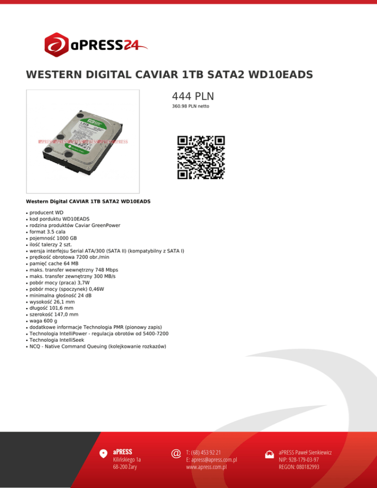 WESTERN DIGITAL CAVIAR 1TB SATA2 WD10EADS 444 PLN