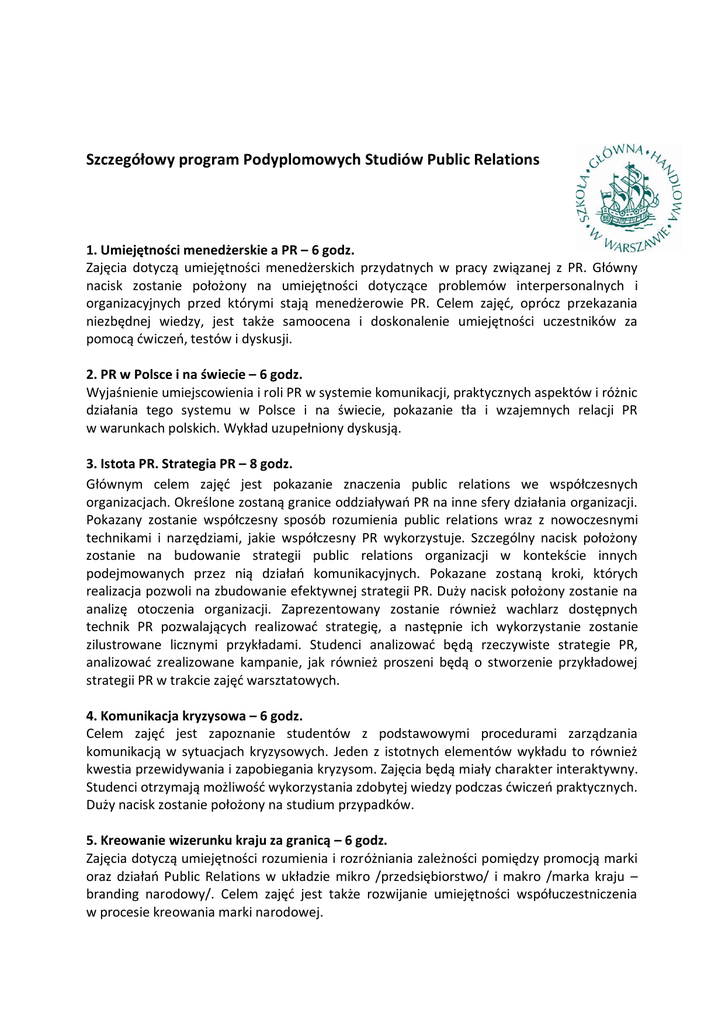 Szczegółowy program Podyplomowych Studiów Public Relations 1. Umiejętności menedżerskie a PR – 6 godz. Zajęcia dotyczą umiejętności menedżerskich przydatnych w pracy związanej z PR. Główny nacisk zostanie położony na umiejętności dotyczące problemów interpersonalnych i organizacyjnych przed którymi stają menedżerowie PR. Celem zajęć, oprócz przekazania niezbędnej wiedzy, jest także samoocena i doskonalenie umiejętności uczestników za pomocą ćwiczeń, testów i dyskusji. 2. PR w Polsce i na świecie – 6 godz. Wyjaśnienie umiejscowienia i roli PR w systemie komunikacji, praktycznych aspektów i różnic działania tego systemu w Polsce i na świecie, pokazanie tła i wzajemnych relacji PR w warunkach polskich. Wykład uzupełniony dyskusją. 3. Istota PR. Strategia PR – 8 godz. Głównym celem zajęć jest pokazanie znaczenia public relations we współczesnych organizacjach. Określone zostaną granice oddziaływań PR na inne sfery działania organizacji. Pokazany zostanie współczesny sposób rozumienia public relations wraz z nowoczesnymi technikami i narzędziami, jakie współczesny PR wykorzystuje. Szczególny nacisk położony zostanie na budowanie strategii public relations organizacji w kontekście innych podejmowanych przez nią działań komunikacyjnych. Pokazane zostaną kroki, których realizacja pozwoli na zbudowanie efektywnej strategii PR. Duży nacisk położony zostanie na analizę otoczenia organizacji. Zaprezentowany zostanie również wachlarz dostępnych technik PR pozwalających realizować strategię, a następnie ich wykorzystanie zostanie zilustrowane licznymi przykładami. Studenci analizować będą rzeczywiste strategie PR, analizować zrealizowane kampanie, jak również proszeni będą o stworzenie przykładowej strategii PR w trakcie zajęć warsztatowych. 4. Komunikacja kryzysowa – 6 godz. Celem zajęć jest zapoznanie studentów z podstawowymi procedurami zarządzania komunikacją w sytuacjach kryzysowych. Jeden z istotnych elementów wykładu to również kwestia przewidywania i zapobiegania kryzysom. Zajęcia będą miały charakter interaktywny. Studenci otrzymają możliwość wykorzystania zdobytej wiedzy podczas ćwiczeń praktycznych. Duży nacisk zostanie położony na studium przypadków. 5. Kreowanie wizerunku kraju za granicą – 6 godz. Zajęcia dotyczą umiejętności rozumienia i rozróżniania zależności pomiędzy promocją marki oraz działań Public Relations w układzie mikro /przedsiębiorstwo/ i makro /marka kraju – branding narodowy/. Celem zajęć jest także rozwijanie umiejętności współuczestniczenia w procesie kreowania marki narodowej. 6. Wykorzystanie Internetu w PR – podstawy – 4 godz. Dynamiczny rozwój Internetu dokonał przełomu nie tylko w komunikacji międzyludzkiej, ale również w Public Relations. Stając się głównym kanałem przesyłu informacji, stworzył ogromny i jeszcze nie w pełni wykorzystany potencjał, ale i zagrożenie dla firm, które chcą poprzez Internet kreować swój wizerunek. Obecnie działania Public Relations w Internecie nie mogą się ograniczać do obecności w serwisach informacyjnych, czy firmowej strony www. Natłok informacyjny w Internecie powoduje, że dotarcie do wybranych grup docelowych wymaga doskonałego dostosowania komunikacji do preferencji odbiorców. Celem zajęć jest przedstawienie specyfiki Internetu jako narzędzia Public Relations, wybranych kanałów komunikacji internetowej oraz pokazanie przykładów praktycznych zastosowań Internetu w budowaniu wizerunku firm, marek i produktów. Zajęcia mają formę wykładu, opartego na przykładach polskich firm i międzynarodowych korporacji. 7. Współpraca PR z mediami – 4 godz. Celem zajęć jest przedstawienie sytuacji na rynku mediów, zasad ich funkcjonowania i specyfiki współpracy z dziennikarzami. Ta część zajęć ma formę interaktywnego wykładu z wykorzystaniem prezentacji. Druga część zajęć dotyczy zasad organizacji konferencji prasowej, zakłada symulację przygotowania i wystąpień podczas konferencji prasowej. 8. Komunikacja na rynkach kapitałowych – investors relations – 6 godz. Znaczenie giełdy w gospodarce : funkcja alokacyjna (przemieszczanie kapitału) oraz funkcja informacyjna rynku giełdowego; Reguły rządzące komunikacją finansową; Kontakty spółki ze wspólnotą inwestorską: inwestorami instytucjonalnymi (fundusze emerytalne, inwestycyjne), inwestorami indywidualnymi, m.in. drobni akcjonariusze, akcjonariat pracowniczy, analitykami, dziennikarzami; Podstawowe formy i narzędzia komunikacji stosowane na rynku kapitałowym; Oferta firm komunikacji finansowej na polskim rynku 9. Język wypowiedzi publicznej. Opracowywanie i redagowanie tekstów PR – 8 godz. Zapoznanie słuchaczy z podstawowymi zagadnieniami kultury współczesnej polszczyzny, z jej tendencjami rozwojowymi widocznymi w języku mediów, reklamy, PR-u oraz instytucji publicznych i w jego odmianach socjalnych. Wskazanie najczęstszych błędów językowych i mechanizmów ich powstawania w wypowiedziach publicznych. Analiza językowa tekstów z udziałem uczestników zajęć oraz praktyczne ćwiczenia umiejętności posługiwania się poprawnym językiem polskim przy tworzeniu różnych typów tekstu, zwiększanie komunikatywności wypowiedzi oraz rozwijanie swobody i kultury kontaktów językowych. Forma: Elementy wykładu, analiza tekstów, ćwiczenia - opracowywanie i redagowanie tekstów PR. 10. Badanie rynku i opinii – 4 godz. Zajęcia służą przekazaniu podstawowych informacji o metodach badań rynkowych oraz o relacjach klientów i agencji badawczych. Celem zajęć jest omówienie praktycznych zastosowań wyników badań w zakresie relacji publicznych, a także sformułowanie rekomendacji, które pomogą menedżerowi PR określić wymagania dotyczące procesu badawczego i dokonać trafnego wyboru agencji badawczej. 11. Sztuka prezentacji przed kamerą 