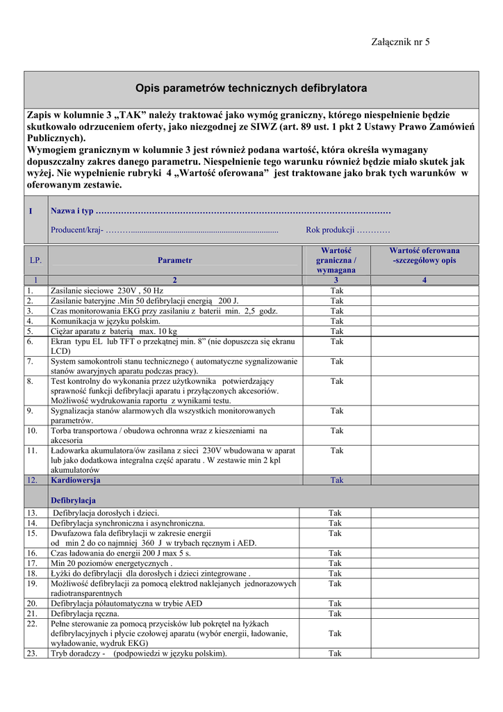 Załącznik nr 5 Opis parametrów technicznych defibrylatora Zapis w kolumnie 3 „TAK” należy traktować jako wymóg graniczny, którego niespełnienie będzie skutkowało odrzuceniem oferty, jako niezgodnej ze SIWZ (art. 89 ust. 1 pkt 2 Ustawy Prawo Zamówień Publicznych). Wymogiem granicznym w kolumnie 3 jest również podana wartość, która określa wymagany dopuszczalny zakres danego parametru. Niespełnienie tego warunku również będzie miało skutek jak wyżej. Nie wypełnienie rubryki 4 „Wartość oferowana” jest traktowane jako brak tych warunków w oferowanym zestawie. Nazwa i typ …………………………………………………………………………………………… I Producent/kraj- ………...................................................................... LP. Parametr 1 2 Zasilanie sieciowe 230V , 50 Hz Zasilanie bateryjne .Min 50 defibrylacji energią 200 J. Czas monitorowania EKG przy zasilaniu z baterii min. 2,5 godz. Komunikacja w języku polskim. Ciężar aparatu z baterią max. 10 kg Ekran typu EL lub TFT o przekątnej min. 8” (nie dopuszcza się ekranu LCD) System samokontroli stanu technicznego ( automatyczne sygnalizowanie stanów awaryjnych aparatu podczas pracy). Test kontrolny do wykonania przez użytkownika potwierdzający sprawność funkcji defibrylacji aparatu i przyłączonych akcesoriów. Możliwość wydrukowania raportu z wynikami testu. Sygnalizacja stanów alarmowych dla wszystkich monitorowanych parametrów. Torba transportowa / obudowa ochronna wraz z kieszeniami na akcesoria Ładowarka akumulatora/ów zasilana z sieci 230V wbudowana w aparat lub jako dodatkowa integralna część aparatu . W zestawie min 2 kpl akumulatorów Kardiowersja 1. 2. 3. 4. 5. 6. 7. 8. 9. 10. 11. 12. 13. 14. 15. 16. 17. 18. 19. 20. 21. 22. 23. Defibrylacja Defibrylacja dorosłych i dzieci. Defibrylacja synchroniczna i asynchroniczna. Dwufazowa fala defibrylacji w zakresie energii od min 2 do co najmniej 360 J w trybach ręcznym i AED. Czas ładowania do energii 200 J max 5 s. Min 20 poziomów energetycznych . Łyżki do defibrylacji dla dorosłych i dzieci zintegrowane . Możliwość defibrylacji za pomocą elektrod naklejanych jednorazowych radiotransparentnych Defibrylacja półautomatyczna w trybie AED Defibrylacja ręczna. Pełne sterowanie za pomocą przycisków lub pokręteł na łyżkach defibrylacyjnych i płycie czołowej aparatu (wybór energii, ładowanie, wyładowanie, wydruk EKG) Tryb doradczy - (podpowiedzi w języku polskim). Rok produkcji ………… Wartość graniczna / wymagana 3 Tak Tak Tak Tak Tak Tak Tak Tak Tak Tak Tak Tak Tak Tak Tak Tak Tak Tak Tak Tak Tak Tak Tak Wartość oferowana -szczegółowy opis 4 31. 32. 33. Monitorowanie EKG Prędkość przesuwu krzywych. Pomiar częstości akcji serca. 12 odprowadzeniowe EKG. Regulowane wzmocnienie sygnału EKG. Alarm zaburzeń rytmu serca. Regulowane alarmy górnej i dolnej granicy częstości akcji serca Żródło sygnału ekg: - z łyżek defibrylatora - z elektrod ekg - z elektrod stymulujących Prezentacja zapisu EKG na monitorze. Analiza i interpretacja EKG . Zabezpieczenie przed impulsem defibrylacji . 34. 35. 36. 37. 38. Stymulacja zewnętrzna synchroniczna i asynchroniczna Częstość impulsów stymulacji / min 40-170 / min Zakres prądu stymulacji od 0-140 mA Dołączone elektrody (2 zestawy) Stymulacja w trybie oczekiwania Stymulacja na żądanie i sztywna 39. 40. 41. 42. Rejestracja Wydruk EKG Automatyczny wydruk EKG dla zdarzeń krytycznych . Prędkość wydruku – podać Pamięć aparatu rejestrująca zdarzeniami - min 40 zdarzeń 24. 25. 26. 27. 28. 29. 30. 43. 44. 45. 46. 47. 48. 49. 50. 51. Podać Tak Tak Tak Tak Tak Tak Tak Tak Tak Tak Tak Tak Tak Tak Tak Tak Podać Tak Pulsoksymetria Zakres pomiaru min. od min 1-100 %. w technologii Masimo lub Nelcor OxiMax Sposób prezentacji wyników numeryczny i falowy. Czujnik typu klips palcowy dla dorosłych i kabel łączący w komplecie . Dźwięk sygnalizacji tętna. Inne Możliwość przesłania zapisu EKG do komputera PC (telemedycyna) Oprogramowanie do archiwizacji danych na PC ze zdarzeń (defibrylacji) i zapisów EKG. Przenoszenie danych do komputera PC. Załączyć odpowiednie akcesoria. Możliwość rozbudowy aparatu o dodatkową funkcję ciśnienia nieinwazyjnego i kapnografii. Regulowane alarmy górnej i dolnej granicy dla wszystkich monitorowanych parametrów. Łatwy do przenoszenia. Tak Tak Tak Tak Tak Tak Tak Tak Tak Niniejszym oświadczamy, że przedstawione powyżej dane są prawdziwe oraz zobowiązujemy się w przypadku wygrania przetargu, do dostarczenia sprzętu spełniającego wyspecyfikowane parametry. Niniejszym oświadczamy, że skonfigurowany wg powyższej specyfikacji sprzęt jest kompletny i po instalacji będzie gotowy do pracy bez dodatkowych zakupów, z zastrzeżeniem materiałów eksploatacyjnych. ..................................... ................................................................ (miejscowość i data ) (pieczątka i podpis osoby upoważnionej do reprezentowania Wykonawcy)