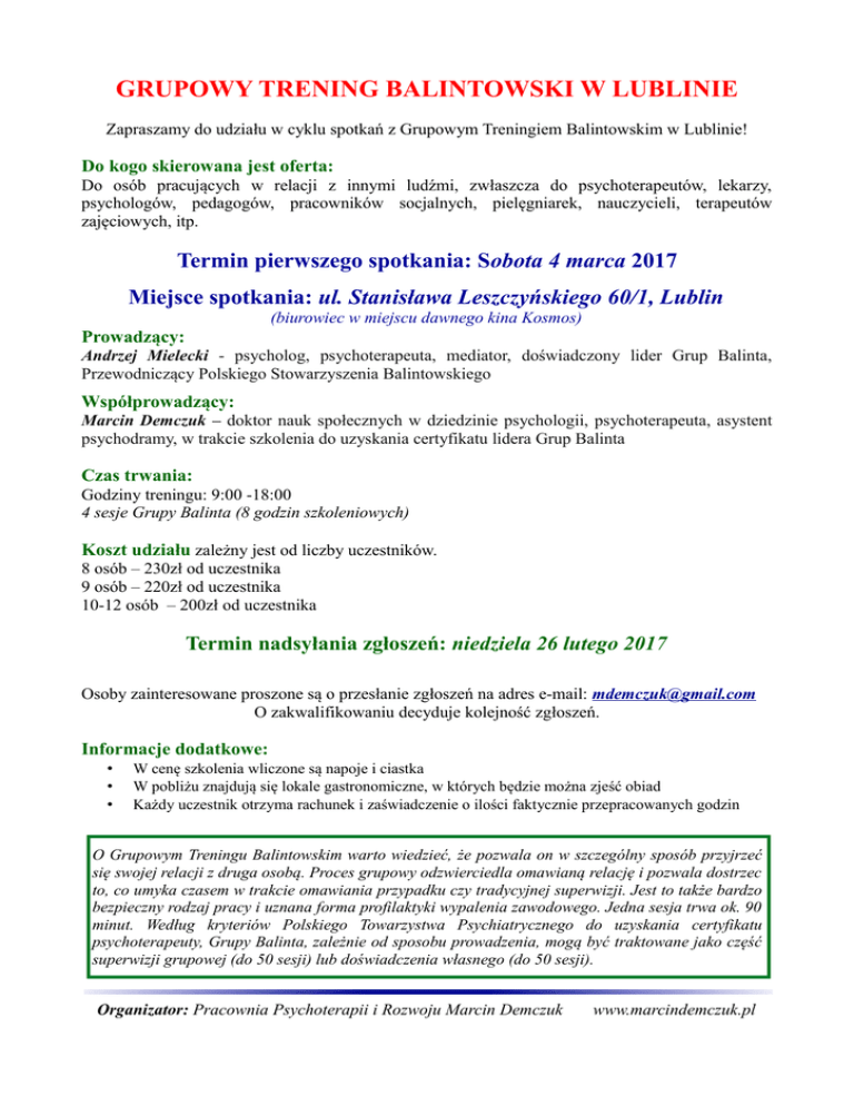 GRUPOWY TRENING BALINTOWSKI W LUBLINIE Zapraszamy do udziału w cyklu spotkań z Grupowym Treningiem Balintowskim w Lublinie! Do kogo skierowana jest oferta: Do osób pracujących w relacji z innymi ludźmi, zwłaszcza do psychoterapeutów, lekarzy, psychologów, pedagogów, pracowników socjalnych, pielęgniarek, nauczycieli, terapeutów zajęciowych, itp. Termin pierwszego spotkania: Sobota 4 marca 2017 Miejsce spotkania: ul. Stanisława Leszczyńskiego 60/1, Lublin (biurowiec w miejscu dawnego kina Kosmos) Prowadzący: Andrzej Mielecki - psycholog, psychoterapeuta, mediator, doświadczony lider Grup Balinta, Przewodniczący Polskiego Stowarzyszenia Balintowskiego Współprowadzący: Marcin Demczuk – doktor nauk społecznych w dziedzinie psychologii, psychoterapeuta, asystent psychodramy, w trakcie szkolenia do uzyskania certyfikatu lidera Grup Balinta Czas trwania: Godziny treningu: 9:00 -18:00 4 sesje Grupy Balinta (8 godzin szkoleniowych) Koszt udziału zależny jest od liczby uczestników. 8 osób – 230zł od uczestnika 9 osób – 220zł od uczestnika 10-12 osób – 200zł od uczestnika Termin nadsyłania zgłoszeń: niedziela 26 lutego 2017 Osoby zainteresowane proszone są o przesłanie zgłoszeń na adres e-mail: [email protected] O zakwalifikowaniu decyduje kolejność zgłoszeń. Informacje dodatkowe: • • • W cenę szkolenia wliczone są napoje i ciastka W pobliżu znajdują się lokale gastronomiczne, w których będzie można zjeść obiad Każdy uczestnik otrzyma rachunek i zaświadczenie o ilości faktycznie przepracowanych godzin O Grupowym Treningu Balintowskim warto wiedzieć, że pozwala on w szczególny sposób przyjrzeć się swojej relacji z druga osobą. Proces grupowy odzwierciedla omawianą relację i pozwala dostrzec to, co umyka czasem w trakcie omawiania przypadku czy tradycyjnej superwizji. Jest to także bardzo bezpieczny rodzaj pracy i uznana forma profilaktyki wypalenia zawodowego. Jedna sesja trwa ok. 90 minut. Według kryteriów Polskiego Towarzystwa Psychiatrycznego do uzyskania certyfikatu psychoterapeuty, Grupy Balinta, zależnie od sposobu prowadzenia, mogą być traktowane jako część superwizji grupowej (do 50 sesji) lub doświadczenia własnego (do 50 sesji). Organizator: Pracownia Psychoterapii i Rozwoju Marcin Demczuk www.marcindemczuk.pl