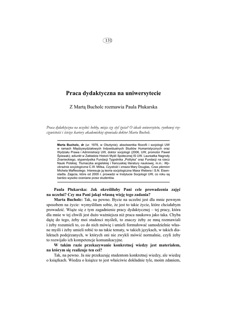 131 Praca dydaktyczna na uniwersytecie Z Martą Bucholc rozmawia Paula Płukarska Praca dydaktyczna na uczelni: hobby, misja czy styl życia? O ideale uniwersytetu, rynkowej rzeczywistości i ścieżce kariery akademickiej opowiada doktor Marta Bucholc. Marta Bucholc, dr (ur. 1978, w Olsztynie); absolwentka filozofii i socjologii UW w ramach Międzywydziałowych Indywidualnych Studiów Humanistycznych oraz Wydziału Prawa i Administracji UW, doktor socjologii (2006, UW, promotor Paweł Śpiewak); adiunkt w Zakładzie Historii Myśli Społecznej IS UW. Laureatka Nagrody Znanieckiego, stypendystka Fundacji Tygodnika „Polityka” oraz Fundacji na rzecz Nauki Polskiej. Tłumaczka angielskiej i francuskiej literatury naukowej, m.in.: Wyobraźnia socjologiczna C.W. Millsa, Czystość i zmaza Mary Douglas, Czas plemion Michela Maffesolego. Interesuje ją teoria socjologiczna Maxa Webera i S.N. Eisenstadta. Zajęcia, które od 2000 r. prowadzi w Instytucie Socjologii UW, co roku są bardzo wysoko oceniane przez studentów. Paula Płukarska: Jak określiłaby Pani cele prowadzenia zajęć na uczelni? Czy ma Pani jakąś własną wizję tego zadania? Marta Bucholc: Tak, na pewno. Bycie na uczelni jest dla mnie pewnym sposobem na życie: wymyśliłam sobie, że jest to takie życie, które chciałabym prowadzić. Wiąże się z tym zagadnienie pracy dydaktycznej – tej pracy, która dla mnie w tej chwili jest dużo ważniejsza niż praca naukowa jako taka. Chyba dążę do tego, żeby moi studenci myśleli, to znaczy żeby ze mną rozmawiali i żeby rozumieli to, co do nich mówię i umieli formułować samodzielnie własne myśli i żeby umieli robić to na takie tematy, w takich językach, w takich dialektach podejrzanych, w których oni nie zwykli mówić normalnie, czyli żeby to rozwijało ich kompetencje komunikacyjne. W takim razie przekazywanie konkretnej wiedzy jest materiałem, na którym się realizuje ten cel? Tak, na pewno. Ja nie przekazuję studentom konkretnej wiedzy, ale wiedzę o książkach. Wiedza o książce to jest właściwie dokładnie tyle, moim zdaniem, 132 Praca dydaktyczna na uniwersytecie co umiejętność sensownego uczynienia tej książki częścią własnego myślenia. W taki sposób wiedza, jaką mogę przekazać, jest materiałem do budowania pewnych kompetencji osobowościowych. Jakie jest miejsce na przekazywanie wartości w tak rozumianej pracy dydaktycznej? Czy etos naukowca, kogoś obiektywnego, zdystansowanego i „uczącego tego, jak pracuje zdyscyplinowany umysł”, nie wyklucza przekazywania wartości poprzez własny autorytet? Myślę, że wartości i dyscyplina naukowa się nie wykluczają. Postawa, która jest mi bliska, wcale nie wyklucza przekazywania wartości, choć może te wartości są trochę inne. Istnieją takie wartości jak odwaga w myśleniu i pokora przejawiająca się w tym, że wyraźnie oddzielamy własne myśli od myśli innych. Wartością jest taka weberowska pokora przejawiająca się w uznaniu, że to, co my myślimy, nie jest ani ostateczne, ani skończone, ani doskonałe, że jest to skazane na przygniecenie przez proces akumulacji. Szczerość jest wartością; dyscyplina, która się przejawia w umiejętności dostrzeżenia wielu aspektów zjawiska, pokazania tych aspektów; także coś takiego, czego uczy praca z grupą na zajęciach: szacunek dla sądu innego człowieka, umiejętność wysłuchania tego sądu, wejścia w dialog z tym sądem. To na pewno są wartości. Czy w uczelniach jest dzisiaj miejsce na realizację idei uniwersytetu, która została stworzona w okresie niemieckiego Oświecenia przez Wilhelma von Humboldta, czyli na nacisk nie tyle na kształcenie zawodowe, ile na rozwój osobowości? Miejsce na pewno jest. W jakim stopniu jednak idea ta jest realizowana, to inna sprawa. Nie można zapominać, że wizja Humboldta narodziła się w innych realiach. Nawet jeśli postrzegano wówczas uniwersytet jako miejsce, które ma odpowiadać na potrzeby społeczne, to były to potrzeby społeczeństwa, a nie potrzeby opinii społecznej. W tej chwili uniwersytet, chociażby z racji konkurencji na rynku edukacji, z racji dewaluacji wykształcenia, z racji technicyzacji wykształcenia, nastawiony jest raczej na realizację tego, czego ludzie otwarcie od niego żądają. Liczy się to, czego chcą studenci, czego chce władza, szeroko pojęta opinia publiczna, rynek. Nie uważam, żeby to znaczyło, iż instytucja ta musi zmienić swoje oblicze i stać się wyłącznie systemem reaktywnym, który będzie dostarczał jakichś pożądanych przez społeczeństwo dóbr. W tym sensie twierdzę, że miejsce jest, ale nie dziwi mnie, że nie na ten aspekt obecnie kładziony jest szczególny nacisk. Czy w Pani przypadku ta idea jest jakąś bezpośrednią inspiracją? Bezpośrednią inspiracją nie jest. Wprawdzie właśnie tak wyobrażam sobie wymarzony uniwersytet: elitarny, raczej dla niewielu, tworzący, produkujący taką arystokrację ducha, która w społeczeństwie miałaby swoje miejsce… Z Martą Bucholc rozmawia Paula Płukarska 133 Bardzo chętnie pracowałabym w takim miejscu, mogłabym się spełniać realizując taki model kształcenia. Nie wiem jednak, czy właśnie tego teraz potrzebujemy. Czy wobec tego praca na uniwersytecie w obecnym kształcie nie jest dla Pani mało satysfakcjonująca? Nie. Dzięki temu, że jest tu bardzo dużo ludzi o różnorodnych zainteresowaniach, moja swoboda jako pracownika jest ogromna. Ja mogę uczyć, o czym chcę, mogę rozmawiać, o czym chcę. Przychodzą do mnie ludzie, którzy chcą do mnie przyjść. Nikt nikogo nie zmusza, żeby chodził na moje zajęcia, nikt nikogo nie zmusza, żeby u mnie pisał pracę magisterską. Taka dobrowolność pozwala mi wyselekcjonować tych, którzy chcą ze mną, przynajmniej przez ten semestr, rok czy dwa lata, pójść jakiś kawałek moją drogą. To jest taka magia instytucji. Instytucja ta jest duża, pozostawia też dość dużo mi