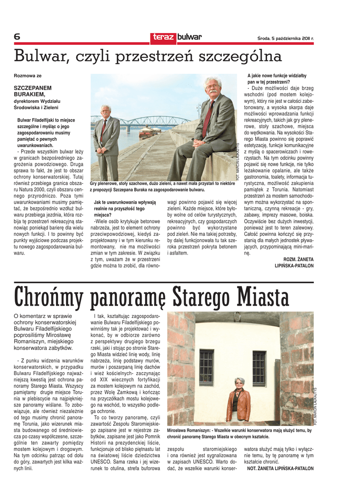 6 teraz bulwar Środa, 5 października 2011 r. Bulwar, czyli przestrzeñ szczególna A jakie nowe funkcje widzia³by pan w tej przestrzeni? Rozmowa ze SZCZEPANEM BURAKIEM, dyrektorem Wydzia³u Środowiska i Zieleni - Przede wszystkim bulwar le¿y w granicach bezpośredniego zagro¿enia powodziowego. Druga sprawa to fakt, ¿e jest to obszar ochrony konserwatorskiej. Tutaj równie¿ przebiega granica obszaru Natura 2000, czyli obszaru cennego przyrodniczo. Poza tymi uwarunkowaniami musimy pamiêtaæ, ¿e bezpośrednio wzd³u¿ bulwaru przebiega jezdnia, która rozbija tê przestrzeñ rekreacyjn¹ stanowi¹c poniek¹d barierê dla wielu nowych funkcji. I to powinny byæ punkty wyjściowe podczas projektu nowego zagospodarowania bulwaru. FOT. MARCIN dAUKAJTYS Bulwar Filadelfijski to miejsce szczególne i myśl¹c o jego zagospodarowaniu musimy pamiêtaæ o pewnych uwarunkowaniach. Gry plenerowe, sto³y szachowe, du¿o zieleni, a nawet ma³a przystañ to niektóre z propozycji Szczepana Buraka na zagospodarowanie bulwaru. Jak te uwarunkowania wp³ywaj¹ realnie na przysz³ośæ tego miejsca? -Wiele osób krytykuje betonowe nabrze¿a, jest to element ochrony przeciwpowodziowej, kiedyś zaprojektowany i w tym kierunku remontowany, nie ma mo¿liwości zmian w tym zakresie. W zwi¹zku z tym, uwa¿am ¿e w przestrzeni gdzie mo¿na to zrobiæ, dla równo- wagi powinno pojawiæ siê wiêcej zieleni. Ka¿de miejsce, które by³oby wolne od celów turystycznych, rekreacyjnych, czy gospodarczych powinno byæ wykorzystane pod zieleñ. Nie ma takiej potrzeby, by dalej funkcjonowa³a tu tak szeroka przestrzeñ pokryta betonem i asfaltem. - Du¿e mo¿liwości daje brzeg wschodni (pod mostem kolejowym), który nie jest w ca³ości zabetonowany, a wysoka skarpa daje mo¿liwości wprowadzania funkcji rekreacyjnych, takich jak gry plenerowe, sto³y szachowe, miejsca do wêdkowania. Na wysokości Starego Miasta powinno siê poprawiæ estetyzacjê, funkcje komunikacyjne z myśl¹ o spacerowiczach i rowerzystach. Na tym odcinku powinny pojawiæ siê nowe funkcje, nie tylko le¿akowanie opalanie, ale tak¿e gastronomia, toalety, informacja turystyczna, mo¿liwośæ zakupienia pami¹tek z Torunia. Natomiast przestrzeñ za mostem samochodowym mo¿na wykorzystaæ na spontaniczn¹, czynn¹ rekreacje - gry, zabawy, imprezy masowe, boiska. Oczywiście bez du¿ych inwestycji, poniewa¿ jest to teren zalewowy. Ca³ośæ powinna koñczyæ siê przystani¹ dla ma³ych jednostek p³ywaj¹cych, przypominaj¹c¹ mini-marinê. ROZM. ¯ANETA LIPIÑSKA-PATALON O komentarz w sprawie ochrony konserwatorskiej Bulwaru Filadelfijskiego poprosiliśmy Miros³awê Romaniszyn, miejskiego konserwatora zabytków. - Z punku widzenia warunków konserwatorskich, w przypadku Bulwaru Filadelfijskiego najwa¿niejsz¹ kwesti¹ jest ochrona panoramy Starego Miasta. Wszyscy pamiêtamy drugie miejsce Torunia w plebiscycie na najpiêkniejsze panoramy wiślane. To zobowi¹zuje, ale równie¿ niezale¿nie od tego musimy chroniæ panoramê Torunia, jako wizerunek miasta budowanego od średniowiecza po czasy wspó³czesne, szczególnie ten zawarty pomiêdzy mostem kolejowym i drogowym. Na tym odcinku patrz¹c od do³u do góry, zawartych jest kilka wa¿nych linii. I tak, kszta³tuj¹c zagospodarowanie Bulwaru Filadelfijskiego powinniśmy tak je projektowaæ i wykonaæ, by w odbiorze zarówno z perspektywy drugiego brzegu rzeki, jaki i stoj¹c po stronie Starego Miasta widzieæ liniê wody, liniê nabrze¿a, liniê podstawy murów, murów i poszarpan¹ liniê dachów i wie¿ kościelnych- zaczynaj¹c od XIX wiecznych fortyfikacji za mostem kolejowym na zachód, przez Wolê Zamkow¹ i koñcz¹c na przyczó³kach mostu kolejowego na wschód, to wszystko podlega ochronie. To co tworzy panoramê, czyli zawartośæ Zespo³u Staromiejskiego zapisane jest w rejestrze zabytków, zapisane jest jako Pomnik Historii na prezydenckiej liście, funkcjonuje od blisko piêtnastu lat na światowej liście dziedzictwa UNESCO. Sama rzeka i jej wizerunek to otulina, strefa buforowa FOT. MARCIN dAUKAJTYS Chroñmy panoramê Starego Miasta Miros³awa Romaniszyn: - Wszelkie warunki konserwatora maj¹ s³u¿yæ temu, by chroniæ panoramê Starego Miasta w obecnym kszta³cie. zespo³u staromiejskiego i ona równie¿ jest sygnalizowana w zapisach UNESCO. Warto dodaæ, ¿e wszelkie warunki konser- watora s³u¿yæ maj¹ tylko i wy³¹cznie temu, by tê panoramê w tym kszta³cie chroniæ. NOT. ¯ANETA LIPIÑSKA-PATALON