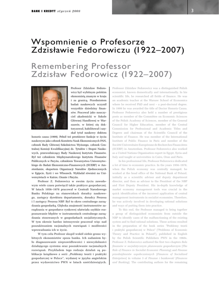B a n k i K r e dy t s t y c z e ń 2 0 0 8 Wspomnienie o Profesorze Zdzisławie Fedorowiczu (1922–2007) Remembering Professor Zdzisław Fedorowicz (1922–2007) Profesor Zdzisław Fedorowicz był wybitnym polskim ekonomistą znanym w kraju i za granicą. Przedmiotem badań naukowych uczynił wszystkie dziedziny finan- Professor Zdzisław Fedorowicz was a distinguished Polish economist, known domestically and internationally. In his scientific life, he researched all fields of finance. He was an academic teacher at the Warsaw School of Economics where he received PhD and next – a post-doctoral degree. In 1999 he was awarded the title of Doctor Honoris Causa. sów. Pracował jako nauczyciel akademicki w Szkole Głównej Handlowej w Warszawie, w której się doktoryzował, habilitował i uzyskał tytuł naukowy doktora honoris causa (1999). Pełnił też prestiżowe funkcje w życiu naukowym jako członek Komitetu Nauk Ekonomicznych PAN, członek Rady Głównej Szkolnictwa Wyższego, członek Centralnej Komisji Kwalifikacyjnej ds. Tytułów i Stopni Naukowych, przewodniczący Rady Naukowej Instytutu Finansów. Był też członkiem Międzynarodowego Instytutu Finansów Publicznych w Paryżu, członkiem Towarzystwa Uniwersyteckiego do Badań Ekonomiczno-Finansowych (SUERF) w Amsterdamie, ekspertem Organizacji Narodów Zjednoczonych w Egipcie, Syrii i we Włoszech. Wykładał również na Uniwersytetach w Kairze, Oranie i Paryżu. Profesor Z. Fedorowicz w swoim życiu zawodowym wiele czasu poświęcił także praktyce gospodarczej. W latach 1956–1978 pracował w Centrali Narodowego Banku Polskiego na stanowiskach doradcy naukowego, zastępcy dyrektora departamentu, doradcy Prezesa i I zastępcy Prezesa NBP. Był to okres centralnego zarządzania gospodarką. Głęboka znajomość instrumentów zarządzania w gospodarce rynkowej ułatwiała szybkie rozpoznawanie błędów w instrumentach centralnego zarządzania stosowanych w gospodarkach socjalistycznych. W tym okresie bardzo intensywnie pracował więc nad poszukiwaniem racjonalnych rozwiązań i możliwości wprowadzania ich w życie. W tym celu Profesor skupił wokół siebie grono wybitnych ekonomistów spoza banku. Ich zadaniem by- Professor Fedorowicz also held a number of prestigious posts as member of the Committee on Economic Sciences of the Polish Academy of Sciences, member of the General Council for Higher Education, member of the Central Commission for Professional and Academic Titles and Degrees and chairman of the Scientific Council of the Institute of Finance. He was member of the International Institute of Public Finance in Paris and member of the Société Universitaire Européenne de Recherches Financières (SUERF) in Amsterdam. Professor Fedorowicz also worked as a United Nations Organisation expert in Egypt, Syria and Italy and taught at universities in Cairo, Oran and Paris. In his professional life, Professor Fedorowicz dedicated a lot of time to economic practice. In the years 1956–1978, when the Polish economy was centrally managed, he worked at the head office of the National Bank of Poland, initially as a scientific advisor and deputy department director, and then as advisor to the President of the NBP and First Deputy President. His in-depth knowledge of market economy management tools was crucial in the quick identification of the incorrect application of central management instruments in socialist economies. Therefore, he was actively involved in developing rational solutions and ways of putting them into practice. To this end, the Professor managed to bring together a group of distinguished economists from outside the NBP to identify cases of the malfunctioning of the existing system and to find rational solutions. These actions resulted in the preparation of the book series "Problemy teorii i praktyki gospodarczej w Polsce" ["Problems of Economic Theory and Practice in Poland"], published in English by the Polish Scientific Publishers PWN in the 1960s. Professor Z. Fedorowicz authored the first two chapters Rola ło diagnozowanie nieprawidłowości i niewydolności działającego systemu oraz poszukiwanie racjonalnych rozwiązań. Przykładem tego rodzaju działań są publikacje książkowe z serii „Problemy teorii i praktyki gospodarczej w Polsce”, wydanej w języku angielskim przez wydawnictwo PWN w latach sześćdziesiątych. finansów w socjalistycznym planowaniu gospodarczym [The Role of Finance in Socialist Economic Planning] and Finanse przedsiębiorstw uspołecznionych [Finances of Socialized Enterprises] in volume 3 of Finanse i bankowość [Finances and Banking]. The contributing authors for the remaining Bank i Kredyt styczeń 2008 W tomie trzecim pt. Finanse i Bankowość dwa pierwsze rozdziały: Rola finansów w socjalistycznym planowaniu gospodarczym i Finanse przedsiębiorstw uspołecznionych, napisał Profesor Z. Fedorowicz. Autorami pozostałych są profesorowie SGH i przedstawiciel NBP. Na okładce czytamy: „Autorzy rozdziałów zamierzali (...) zaprezentować czytelnikowi teoretyczne problemy dotyczące funkcjonowania pieniądza i finansów w gospodarce socjalistycznej, jak również zastosowanie metod rozwiązywania tych problemów w Polsce”. Zagadnienia te stały się przedmiotem rozważań w kolejnych jedenastu wydaniach podręcznika Finanse w gospodarce socjalistycznej. Nie można pominąć także książki wydanej w 1967 r. pt. Sporne zagadnienia teorii pieniądza w gospodarce socjalistycznej, za którą Polskie Towarzystwo Ekonomiczne przyznało Profesorowi nagrodę naukową II stopnia im. Oskara Langego. chapters were professors of the Warsaw School of Economics and a NBP representative. The cover of the publication contains the following note: ”The authors of the chapters have intended to (...) present to the reader theoretical problems related to the functioning of money and finance in a socialist economy as well as methods of solving these problems in Poland”. T