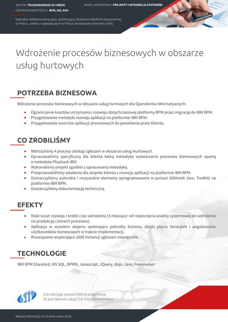 SEKTOR: TELEKOMUNIKACJA I MEDIA MODEL WSPÓŁPRACY: PROJEKTY I INTEGRACJA SYSTEMÓW CENTRUM KOMPETENCJI: BPM, EAI, SOA Operator telekomunikacyjny, dominujący dostawca telefonii stacjonarnej w Polsce. Jeden z największych w Polsce dostawców Internetu (ISP). Wdrożenie procesów biznesowych w obszarze usług hurtowych POTRZEBA BIZNESOWA Wdrożenie procesów biznesowych w obszarze usług hurtowych dla Operatorów Alternatywnych: Ograniczenie kosztów utrzymania i rozwoju dotychczasowej platformy BPM przez migrację do IBM BPM. Przygotowanie metodyki rozwoju aplikacji na platformie IBM BPM. Przygotowanie wzorców aplikacji procesowych do powielania przez Klienta. CO ZROBILIŚMY Wdrożyliśmy 4 procesy obsługi zgłoszeń w obszarze usług Hurtowych. Opracowaliśmy specyficzną dla klienta lekką metodykę wytwarzania procesów biznesowych opartą o metodykę Playback IBM. Wykonaliśmy projekt zgodnie z opracowaną metodyką. Przeprowadziliśmy szkolenia dla zespołu klienta z rozwoju aplikacji na platformie IBM BPM. Dostarczyliśmy autorskie i reużywalne elementy oprogramowania w postaci bibliotek (tzw. Toolkit) na platformie IBM BPM. Dostarczyliśmy dokumentację techniczną. EFEKTY Niski koszt rozwoju i krótki czas wdrożenia (3 miesiące: od rozpoczęcia analizy systemowej do wdrożenia na produkcję czterech procesów). Aplikacja w wysokim stopniu spełniająca potrzeby biznesu, dzięki pięciu iteracjom i angażowaniu użytkowników biznesowych w trakcie implementacji. Rozwiązanie wspierające 1000 instancji zgłoszeń miesięcznie. TECHNOLOGIE IBM BPM Standard, MS SQL, BPMN, Javascript, JQuery, dojo, Java, Freemarker Zatrudniając ponad 2000 pracowników, Sii jest liderem usług IT & Inżynierii w Polsce. Więcej informacji na stronie www.sii.pl