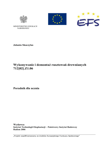 MINISTERSTWO EDUKACJI NARODOWEJ Jolanta Skoczylas Wykonywanie i demontaż rusztowań drewnianych 712[02].Z1.06 Poradnik dla ucznia Wydawca Instytut Technologii Eksploatacji – Państwowy Instytut Badawczy Radom 2006 „Projekt współfinansowany ze środków Europejskiego Funduszu Społecznego” Recenzenci: mgr inż. Lidia Staniszewska mgr inż. Małgorzata Karbowiak Opracowanie redakcyjne: mgr inż. Jolanta Skoczylas Konsultacja: dr inż. Jacek Przepiórka Korekta: Poradnik stanowi obudowę dydaktyczną programu jednostki modułowej 712[02].Z1.06 „Wykonywanie i demontaż rusztowań drewnianych”, zawartego w modułowym programie nauczania dla zawodu cieśla Wydawca Instytut Technologii Eksploatacji – Państwowy Instytut Badawczy, Radom 2006 „Projekt współfinansowany ze środków Europejskiego Funduszu Społecznego” 1 SPIS TREŚCI 1. 2. 3. 4. Wprowadzenie Wymagania wstępne Cele kształcenia Materiał nauczania 4.1. Rodzaje rusztowań drewnianych 4.1.1. Materiał nauczania 4.1.2. Pytania sprawdzające 4.1.3. Ćwiczenia 4.1.4. Sprawdzian postępów 4.2. Rusztowania stojakowe jednorzędowe i dwurzędowe drewniane 4.2.1. Materiał nauczania 4.2.2. Pytania sprawdzające 4.2.3. Ćwiczenia 4.2.4. Sprawdzian postępów 4.3. Przygotowanie podłoża pod rusztowania 4.3.1. Materiał nauczania 4.3.2. Pytania sprawdzające 4.3.3. Ćwiczenia 4.3.4. Sprawdzian postępów 4.4. Elementy komunikacyjne i zabezpieczające 4.4.1. Materiał nauczania 4.4.2. Pytania sprawdzające 4.4.3. Ćwiczenia 4.4.4. Sprawdzian postępów 4.5. Zasady montażu i demontażu rusztowań stojakowych drewnianych 4.5.1. Materiał nauczania 4.5.2. Pytania sprawdzające 4.5.3. Ćwiczenia 4.5.4. Sprawdzian postępów 4.6. Zasady bhp przy montażu i pracy na rusztowaniach 4.6.1. Materiał nauczania 4.6.2. Pytania sprawdzające 4.6.3. Ćwiczenia 4.6.4. Sprawdzian postępów 5. Sprawdzian osiągnięć 6. Literatura „Projekt współfinansowany ze środków Europejskiego Funduszu Społecznego” 2 3 5 6 7 7 7 9 9 10 11 11 14 15 17 18 18 18 19 19 20 20 21 21 23 24 24 25 25 27 28 28 29 29 30 31 37 1. WPROWADZENIE Poradnik będzie Ci pomocny w przyswajaniu wiedzy o rodzajach rusztowań drewnianych, przygotowaniu podłoża pod rusztowania, zasadach montażu rusztowań stojakowych drewnianych, elementach komunikacyjnych, zabezpieczających i demontażu rusztowań drewnianych. W poradniku zamieszczono: − wymagania wstępne, czyli wykaz niezbędnych umiejętności i wiedzy, które powinieneś mieć opanowane, aby przystąpić do realizacji tej jednostki modułowej, − cele kształcenia tej jednostki modułowej, − materiał nauczania (rozdział 4), który umożliwia samodzielne przygotowanie się do wykonania ćwiczeń i zaliczenia sprawdzianów. Obejmuje on również ćwiczenia, które zawierają wykaz materiałów, narzędzi i sprzętu potrzebnych do realizacji ćwiczeń. Przed ćwiczeniami zamieszczono pytania sprawdzające wiedzę potrzebną do ich wykonania. Po ćwiczeniach zamieszczony został sprawdzian postępów. Wykonując sprawdzian postępów, powinieneś odpowiadać na pytania tak lub nie, co oznacza, że opanowałeś materiał albo nie, − sprawdzian osiągnięć, w którym zamieszczono instrukcję dla ucznia oraz zestaw zadań testowych sprawdzających opanowanie wiedzy i umiejętności z zakresu całej jednostki. Zamieszczona została także kartę odpowiedzi, − wykaz literatury obejmujący zakres wiadomości dotyczących tej jednostki modułowej, która umożliwi Ci pogłębienie nabytych umiejętności. Jeżeli masz trudności ze zrozumieniem tematu lub ćwiczenia, to poproś nauczyciela lub instruktora o wyjaśnienie i ewentualne sprawdzenie, czy dobrze wykonujesz daną czynność. Jednostka modułowa: Wykonywanie i demontaż rusztowań drewnianych, której treści teraz poznasz stanowi jeden z elementów modułu 712[02].Z1 „Technologia robót ciesielskich” i jest oznaczona na schemacie na stronie 4. Bezpieczeństwo i higiena pracy W czasie pobytu w pracowni musisz przestrzegać regulaminów, przepisów bezpieczeństwa i higieny pracy oraz instrukcji przeciwpożarowych, wynikających z rodzaju wykonywanych prac. Przepisy te poznasz podczas trwania nauki. „Projekt współfinansowany ze środków Europejskiego Funduszu Społecznego” 3 712[02].Z1 Technologia robót ciesielskich 712[02].Z1.01 Dobieranie narzędzi, sprzętu i maszyn do robót ciesielskich 712[02].Z1.02 Wykonywanie podstawowych pomiarów w robotach ciesielskich 712[02].Z1.03 Ręczna obróbka drewna 712[02].Z1.04 Mechaniczna obróbka drewna 712[02].Z1.05 Wykonywanie połączeń i złączy ciesielskich 712[02].Z1.06 Wykonywanie i demontaż rusztowań drewnianych 712[02].Z1.07 Wykonywanie drewnianych ścian szkieletowych 712[02].Z1.08 Wykonywanie ścian wieńcowych 712[02].Z1.09 Wykonywanie stropów drewnianych 712[02].Z1.10 Wykonywanie wiązarów i dźwigarów dachowych 712[02].Z1.11 Deskowanie fundamentów i stóp fundamentowych 712[02].Z1.12 Deskowanie ścian i słupów 712[02].Z1.13 Deskowanie stropów 712[02].Z1.14 Deskowanie schodów 712[02].Z1.15 Zabezpieczanie ścian wykopów 712[02].Z1.17 Zabezpieczanie drewna przed szkodliwymi czynnikami zewnętrznymi 712[02].Z1.18 Rozliczanie robót ciesielskich 712[02].Z1.16 Wykonywanie napraw konstrukcji ciesielskich Schemat układu jednostek modułowych „Projekt współfinansowany ze środków Europejskiego Funduszu Społecznego” 4 2. WYMAGANIA WSTĘPNE − − − − − − − − − Przystępując do realizacji programu jednostki modułowej powinieneś umieć: rozpoznawać podstawowe materiały budowlane, posługiwać się podstawowymi pojęciami z zakresu budownictwa, wykonywać szkice podstawowymi technikami rysunkowymi, dobierać narzędzia, maszyny i sprzęt do robót ciesielskich, wykonywać podstawowe pomiary w robotach ciesielskich, wykonywać ręczną i mechaniczną obróbkę drewna, wykonywać połączenia i złącza ciesielskie, stosować podstawowe przepisy bezpieczeńs