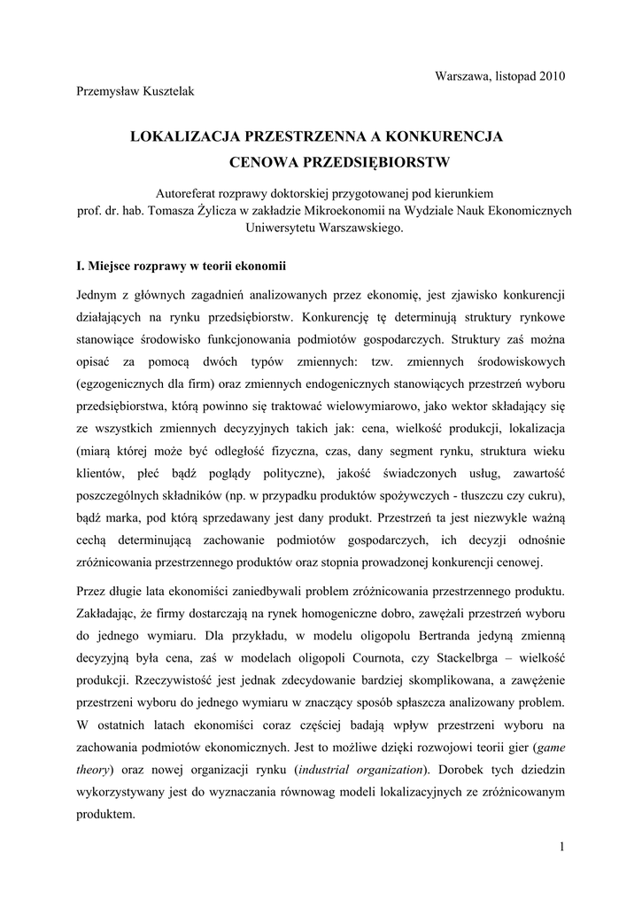 Warszawa, listopad 2010 Przemysław Kusztelak LOKALIZACJA PRZESTRZENNA A KONKURENCJA CENOWA PRZEDSIĘBIORSTW Autoreferat rozprawy doktorskiej przygotowanej pod kierunkiem prof. dr. hab. Tomasza Żylicza w zakładzie Mikroekonomii na Wydziale Nauk Ekonomicznych Uniwersytetu Warszawskiego. I. Miejsce rozprawy w teorii ekonomii Jednym z głównych zagadnień analizowanych przez ekonomię, jest zjawisko konkurencji działających na rynku przedsiębiorstw. Konkurencję tę determinują struktury rynkowe stanowiące środowisko funkcjonowania podmiotów gospodarczych. Struktury zaś można opisać za pomocą dwóch typów zmiennych: tzw. zmiennych środowiskowych (egzogenicznych dla firm) oraz zmiennych endogenicznych stanowiących przestrzeń wyboru przedsiębiorstwa, którą powinno się traktować wielowymiarowo, jako wektor składający się ze wszystkich zmiennych decyzyjnych takich jak: cena, wielkość produkcji, lokalizacja (miarą której może być odległość fizyczna, czas, dany segment rynku, struktura wieku klientów, płeć bądź poglądy polityczne), jakość świadczonych usług, zawartość poszczególnych składników (np. w przypadku produktów spożywczych - tłuszczu czy cukru), bądź marka, pod którą sprzedawany jest dany produkt. Przestrzeń ta jest niezwykle ważną cechą determinującą zachowanie podmiotów gospodarczych, ich decyzji odnośnie zróżnicowania przestrzennego produktów oraz stopnia prowadzonej konkurencji cenowej. Przez długie lata ekonomiści zaniedbywali problem zróżnicowania przestrzennego produktu. Zakładając, że firmy dostarczają na rynek homogeniczne dobro, zawężali przestrzeń wyboru do jednego wymiaru. Dla przykładu, w modelu oligopolu Bertranda jedyną zmienną decyzyjną była cena, zaś w modelach oligopoli Cournota, czy Stackelbrga – wielkość produkcji. Rzeczywistość jest jednak zdecydowanie bardziej skomplikowana, a zawężenie przestrzeni wyboru do jednego wymiaru w znaczący sposób spłaszcza analizowany problem. W ostatnich latach ekonomiści coraz częściej badają wpływ przestrzeni wyboru na zachowania podmiotów ekonomicznych. Jest to możliwe dzięki rozwojowi teorii gier (game theory) oraz nowej organizacji rynku (industrial organization). Dorobek tych dziedzin wykorzystywany jest do wyznaczania równowag modeli lokalizacyjnych ze zróżnicowanym produktem. 1 W teorii wyróżnia się dwa rodzaje zróżnicowania przestrzennego produktu: (1) zróżnicowanie horyzontalne (horizontal product differentiation); (2) zróżnicowanie wertykalne (vertical product differentiation). Produkty są zróżnicowane horyzontalnie (poziomo), jeżeli konsumenci mają heterogeniczne preferencje odnośnie najbardziej pożądanych przez nich produktów. W takim przypadku nie istnieje możliwość uporządkowania odmian dobra od najbardziej do najmniej pożądanych przez konsumentów, gdyż różne osoby preferują różne odmiany produktów. Przykładem dóbr zróżnicowanych horyzontalnie mogą być: różne odmiany wody mineralnej (procentowa zawartość dwutlenku węgla, źródło, z którego jest wydobywana), długopisy (zróżnicowanie kolorystyczne, typ wkładów), artykuły mleczne (zawartość tłuszczu, składniki dodatkowe), telewizory, czy samochody (marka). Jeżeli więc produkty zróżnicowane horyzontalnie będą sprzedawane po zbliżonych do siebie cenach, to konsumenci będą zgłaszali popyt na różne ich odmiany. Drugim typem zróżnicowania produktów jest zróżnicowanie wertykalne (pionowe). Produkty są zróżnicowane wertykalnie, jeżeli wszyscy konsumenci tak samo szeregują poszczególne dobra (kolejność dóbr jest taka sama dla wszystkich konsumentów po uszeregowaniu ich od najbardziej preferowanych do najmniej preferowanych). Przykładem dóbr zróżnicowanych wertykalnie mogą być: produkty różnej jakości - przykładowo samochody różniące się jedynie liczbą poduszek powietrznych lub mocą silnika, produkty różniące się jedynie wielkością opakowania, czy też długością okresu gwarancyjnego. Gdyby produkty takie były sprzedawane po identycznych cenach, to wszyscy konsumenci zdecydowaliby się na zakup tego samego produktu. Podejściem wertykalnym zajmowali się m. in. Gabszkiewicz i Thisse (1979), zaś próbę powiązania zróżnicowania wertykalnego z horyzontalnym podjął Anglin (1992). W literaturze istnieją również dwa nurty badania zachowania się firm i konsumentów: (1) podejście przestrzenne (spatial models); (2) podejście nieprzestrzenne (non-spatial models). Podejście przestrzennego zróżnicowania produktu zakłada, że produkty można scharakteryzować przez zestaw atrybutów (cech charakterystycznych produktu), zaś preferencje konsumentów są opisane na tych atrybutach. Każdy atrybut definiuje wówczas wymiar zróżnicowania. Produkty danej firmy konkurują więc bezpośrednio jedynie z produktami tych firm, które są mało zróżnicowane przestrzennie. Podejście to zapoczątkowali: Hotelling (1929) i Lancaster (1979). Podejście nieprzestrzennego 2 zróżnicowania produktu opiera się natomiast na założeniu, że istnieją na rynku pewne odmiany produktów, wobec których konsumenci mają określone preferencje uwzględniające różnorodność odmian. Podejście to zapoczątkowali: Robinson (1932) i Chamberlin (1933), a rozwinęli Spence (1976) oraz Dixit i Stiglitz (1977). Podstawową różnicą pomiędzy tymi podejściami jest to, że w podejściu nieprzestrzennym przyjmuje się, iż firmy konkurują w równym stopniu ze wszystkimi pozostałymi firmami na rynku, podczas gdy w podejściu przestrzennym firma ma zaledwie kilku konkurentów, którzy bezpośrednio wpływają na jej zachowanie (Anderson 1992). Do nurtu nieprzestrzennego zróżnicowania produktu należy m.in. model konkurencji monopolistycznej, w którym zmiana decyzji jednej firmy wpływa w równym stopniu na wyniki uzyskiwane przez wszystkich konkurentów. Wpływ ten jest jednak niewielki