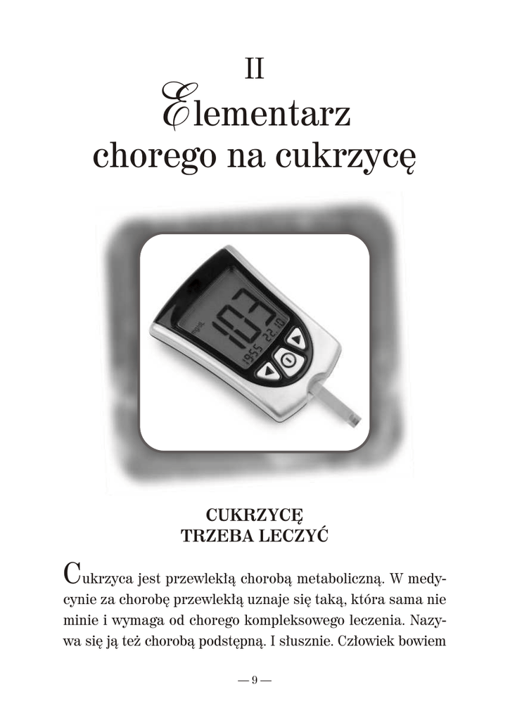 II E lementarz chorego na cukrzycę CUKRZYCĘ TRZEBA LECZYĆ Cukrzyca jest przewlekłą chorobą metaboliczną. W medy- cynie za chorobę przewlekłą uznaje się taką, która sama nie minie i wymaga od chorego kompleksowego leczenia. Nazywa się ją też chorobą podstępną. I słusznie. Człowiek bowiem —9— Ziołowy poradnik chorego na cukrzycę zanim dowie się, że jest nią dotknięty, może nawet przez 10 lat znajdować się w stanie określanym jako przedcukrzycowy. Wcale nie musi odczuwać wyraźnych niepokojących objawów zdradzających tę przypadłość. Jest to choroba cywilizacyjna, co oznacza, że zapada na nią dziś bardzo dużo ludzi na świecie i wciąż rośnie liczba nowych zdiagnozowanych jej przypadków. Publikuje się różne statystyki dotyczące zachorowalności na cukrzycę. Wszystkie zapierają wręcz dech w piersiach, stąd mówi się już ostatnio o wyraźnej epidemii tej choroby. Światowa Organizacja Zdrowia (WHO) regularnie zabiera głos w sprawie narastającego problemu zagrożenia cukrzycą. Według jej prognoz w 2030 roku liczba zachorowań na świecie może wynieść 366 milionów ludzi. Sporządzono raport, z którego wynika, że z każdym rokiem zachorowanie na cukrzycę wzrasta o 11%. W ciągu ostatnich 30 lat liczba takich chorych wzrosła na świecie z 135 do 300 milionów. W Polsce sytuacja wcale nie wygląda lepiej. W 2000 roku zarejestrowanych było 1,3 miliona pacjentów z cukrzycą, a dziś jest to już liczba 3 milionów, a nawet więcej. Musimy bowiem wziąć pod uwagę, że wielu ludzi nie ma świadomości, że są chorzy. Aby wzmóc czujność, a także nagłośnić narastający problem zagrożenia tym schorzeniem, obchodzi się u nas w listopadzie Światowy Dzień Walki z Cukrzycą. — 10 — Elementarz chorego na cukrzycę NA CZYM POLEGA ISTOTA CUKRZYCY? Cukrzyca ma ścisły związek z pracą trzustki, a konkret- nie ze skupiskami komórek β (beta), produkującymi ważny hormon – insulinę. Dzięki niej wszystkie komórki naszego organizmu mają zdolność przyswajania z krwi niezbędnej do życia glukozy (podstawowe źródło energii). Stanowi ona swego rodzaju klucz otwierający pewne receptory rozmieszczone w komórce, przez które wnika do nich glukoza. Po spełnieniu zadania insulina jest usuwana z organizmu, dlatego trzustka musi być przygotowana na regularne jej dostarczanie. Kiedy ten organ wcale nie produkuje insuliny lub produkuje jej zbyt mało, glukoza nie może być spalana, a jej nadmiar wciąż utrzymuje się we krwi. Niekiedy bywa i tak, że komórki β produkują insulinę, ale komórki naszego organizmu zupełnie na nią nie reagują (zamykają się na jej działanie – wykazują tzw. insulinooporność). Medycyna rozróżnia cztery typy cukrzycy, ale najczęściej występują dwa. Mamy do czynienia z cukrzycą typu 1 – zwaną także młodzieńczą lub insulinozależną, która jest spowodowana zniszczeniem komórek β wysp trzustkowych (choruje na nią około 15-20% ludzi). Występuje również cukrzyca typu 2 – zwana insulinoniezależną, gdzie powodem podwyższonego poziomu cukru we krwi jest niedobór insuliny lub jej wystarczająca ilość, ale — 11 — Ziołowy poradnik chorego na cukrzycę jej działanie w organizmie jest ograniczone lub zahamowane (komórki wykazują na nią odporność). Zmaga się z nią około 80% chorych osób. Jest jeszcze cukrzyca ciężarnych (spotyka się ją u 3-5% kobiet oczekujących dziecka). Zwykle ustępuje samoistnie po urodzeniu dziecka. Wymaga jednak stałej obserwacji, bo niewykryta w porę może np. być powodem rodzenia niemowląt o wadze powyżej 4 kilogramów (makrosomia). Z reguły stwarza poza tym większe ryzyko wystąpienia wad rozwojowych u dziecka. Rzadko natomiast występuje cukrzyca wtórna, która ujawnia się np. na skutek zażywanych leków, urazu czy też ostrego, przewlekłego stanu zapalnego trzustki. Długotrwały nadmiar glukozy we krwi wywołuje wiele zaburzeń i powikłań – z czasem zagrażających zdrowiu i życiu chorego. Stąd też często skupia się uwagę na powikłaniach cukrzycowych. Piszę o tym szczegółowo w dalszej części książki. KIEDY POZIOM CUKRU WE KRWI JEST NIEPRAWIDŁOWY Istnienie cukrzycy zdradza poziom (stężenie) glukozy we krwi, który jest mierzony (oznaczany na podstawie próbek krwi) na czczo bądź np. 2 godziny po obciążeniu glukozą (podaje się ją badanemu pacjentowi). W oparciu o wiarygodne opracowania Amerykańskiego Towarzystwa Diabetolo— 12 — Elementarz chorego na cukrzycę gicznego (ADA – American Diabetes Association) w odniesieniu do cukrzycy typu 2 objawem potwierdzającym chorobę jest taki stan, gdy we krwi badanej na czczo osoby poziom glukozy wynosi 126 mg/dl (tj. 7 mmol/l) albo kiedy taki poziom badany przypadkowo wynosi 200 mg/dl (co odpowiada 11,1 mmol/l). To samo Towarzystwo daje też zalecenie, że za istnienie cukrzycy przyjmuje się oznaczenie poziomu glukozy 200 mg/dl (11,1 mmol/l) we krwi badanego 2 godziny po obciążeniu glukozą. Określenie „na czczo” oznacza w praktyce medycznej niespożywanie żadnego posiłku 8 godzin przed planowanym badaniem poziomu cukru we krwi. Tu jednak uwaga. Nie ulega wątpliwości, że wczesne wykrycie cukrzycy ma wiodące znaczenie w jej leczeniu, ale czasem spłyca się diagnostykę na podstawie badań krwi. Na niewiele może zdać się nawet największa troska lekarza pierwszego kontaktu, który zleci pacjentowi takie badanie z krwi pobranej na czczo. Może się zdarzyć, że osoba będzie miała prawidłowy poziom glukozy we krwi na czczo, ale niebezpieczne objawy hiperglikemii (wzrost poziomu cukru) wystąpią u niej 2 godziny po posiłku. Znawcy twierdzą, że jeśli poziom ten wyniesie 200 mg/dl, stanowi to równie poważny problem. Długo utrzymujący się we krwi wysoki poziom glukozy po spożyciu posiłku przy zachowaniu normalnego jej poziomu na czczo zwiększa aż dwukrotnie śmiertelność. To więc niewiele mniej niż w
