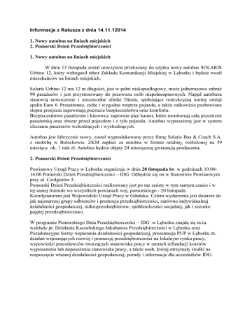 Informacje z Ratusza z dnia 14.11.12014 1. Nowy autobus na liniach miejskich 2. Pomorski Dzień Przedsiębiorczości 1. Nowy autobus na liniach miejskich W dniu 13 listopada został uroczyście przekazany do użytku nowy autobus SOLARIS Urbino 12, który wzbogacił tabor Zakładu Komunikacji Miejskiej w Lęborku i będzie woził mieszkańców na liniach miejskich. Solaris Urbino 12 ma 12 m długości, jest w pełni niskopodłogowy, może jednorazowo zabrać 90 pasażerów i jest przystosowany do przewozu osób niepełnosprawnych. Napęd autobusu stanowią nowoczesne i niezawodne silniki Diesla, spełniające restrykcyjną normę emisji spalin Euro 6. Przestronne, ciche i wygodne wnętrze pojazdu, a także całkowicie pozbawione stopni przejścia zapewniają poczucie bezpieczeństwa oraz komfortu. Bezpieczeństwo pasażerom i kierowcy zapewnia pięć kamer, które monitorują całą przestrzeń pasażerską oraz obszar przed pojazdem i z tyłu pojazdu. Autobus wyposażony jest w system zliczania pasażerów wchodzących i wychodzących. Autobus jest fabrycznie nowy, został wyprodukowany przez firmę Solaris Bus & Coach S.A. z siedzibą w Bolechowie. ZKM zapłaci za autobus w formie ratalnej, rozłożonej na 59 miesięcy ok. 1 mln zł. Autobus będzie objęty 24 miesięczną gwarancją producenta. 2. Pomorski Dzień Przedsiębiorczości Powiatowy Urząd Pracy w Lęborku organizuje w dniu 20 listopada br. w godzinach 10.0014.00 Pomorski Dzień Przedsiębiorczości – IDG. Odbędzie się on w Starostwie Powiatowym przy ul. Czołgistów 5. Pomorski Dzień Przedsiębiorczości realizowany jest po raz szósty w tym samym czasie i w tej samej formule we wszystkich powiatach woj. pomorskiego - 20 listopada. Koordynatorem jest Wojewódzki Urząd Pracy w Gdańsku. Celem wydarzenia jest dotarcie do jak najszerszej grupy odbiorców i promocja przedsiębiorczości, zarówno indywidualnej działalności gospodarczej, mikroprzedsiębiorstw, spółdzielczości socjalnej, jak i szeroko pojętej przedsiębiorczości. W programie Pomorskiego Dnia Przedsiębiorczości – IDG w Lęborku znajdą się m.in. wykłady pt. Działania Kaszubskiego Inkubatora Przedsiębiorczości w Lęborku oraz Pozadotacyjne formy wspierania działalności gospodarczej, prezentacja PUP w Lęborku nt. działań wspierających rozwój i promocję przedsiębiorczości na lokalnym rynku pracy, wypowiedzi pracodawców tworzących stanowiska pracy w ramach refundacji kosztów wyposażenia lub doposażenia stanowiska pracy, a także osób, której otrzymały środki na rozpoczęcie własnej działalności gospodarczej, porady i informacje dla uczestników IDG.