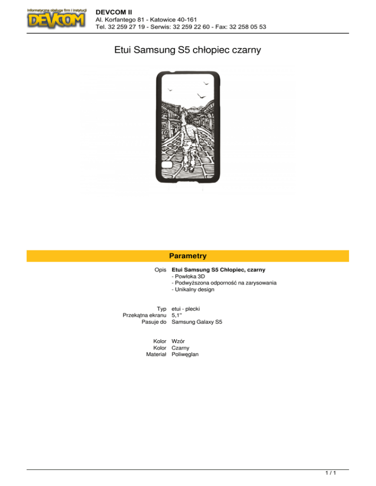 DEVCOM II Al. Korfantego 81 - Katowice 40-161 Tel. 32 259 27 19 - Serwis: 32 259 22 60 - Fax: 32 258 05 53 Etui Samsung S5 chłopiec czarny Parametry Opis Etui Samsung S5 Chłopiec, czarny - Powłoka 3D - Podwyższona odporność na zarysowania - Unikalny design Typ etui - plecki Przekątna ekranu 5,1'' Pasuje do Samsung Galaxy S5 Kolor Wzór Kolor Czarny Materiał Poliwęglan 1/1 Powered by TCPDF (www.tcpdf.org)