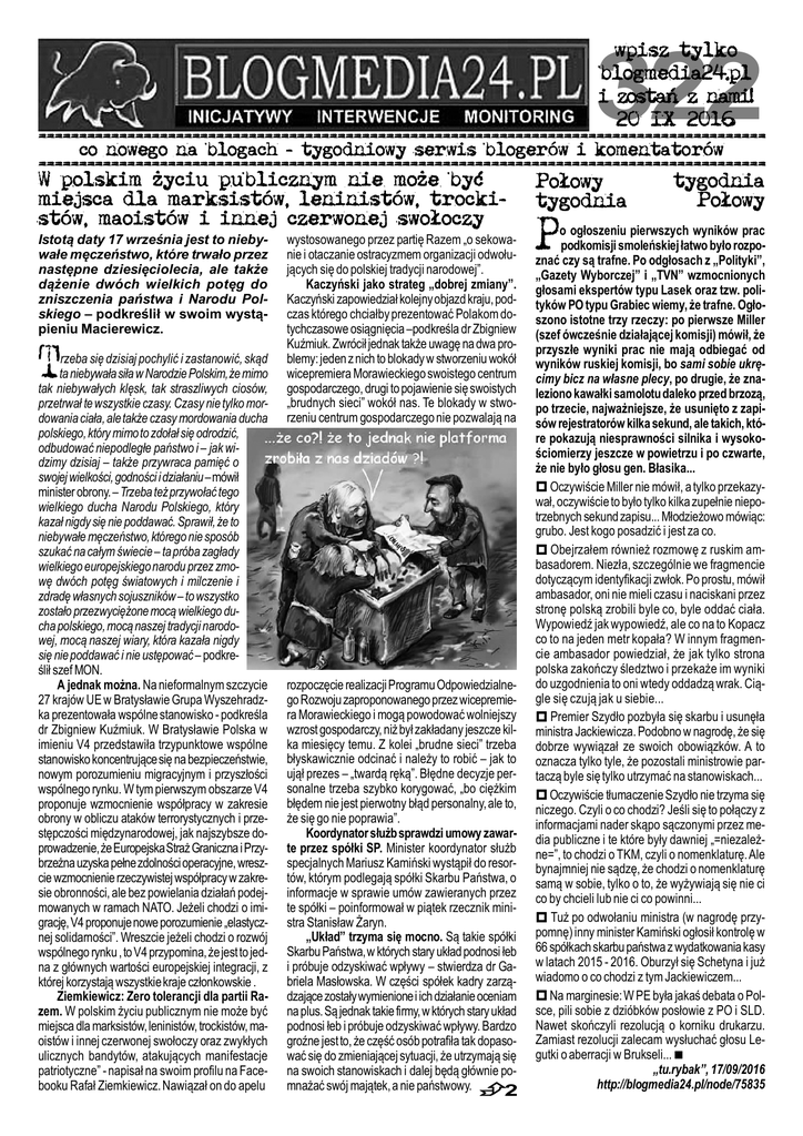 wpisz tylko blogmedia24.pl i zostañ z nami! 20 IX 2016 ========================================================================================== 322 co nowego na blogach - tygodniowy serwis blogerów i komentatorów ========================================================================================== W polskim ¿yciu publicznym nie mo¿e byæ tygodnia Po³owy miejsca dla marksistów, leninistów, trockiPo³owy tygodnia stów, maoistów i innej czerwonej swo³oczy Istotą daty 17 września jest to niebywałe męczeństwo, które trwało przez następne dziesięciolecia, ale także dążenie dwóch wielkich potęg do zniszczenia państwa i Narodu Polskiego – podkreślił w swoim wystąpieniu Macierewicz. T rzeba się dzisiaj pochylić i zastanowić, skąd ta niebywała siła w Narodzie Polskim, że mimo tak niebywałych klęsk, tak straszliwych ciosów, przetrwał te wszystkie czasy. Czasy nie tylko mordowania ciała, ale także czasy mordowania ducha polskiego, który mimo to zdołał się odrodzić, odbudować niepodległe państwo i – jak widzimy dzisiaj – także przywraca pamięć o swojej wielkości, godności i działaniu – mówił minister obrony. – Trzeba też przywołać tego wielkiego ducha Narodu Polskiego, który kazał nigdy się nie poddawać. Sprawił, że to niebywałe męczeństwo, którego nie sposób szukać na całym świecie – ta próba zagłady wielkiego europejskiego narodu przez zmowę dwóch potęg światowych i milczenie i zdradę własnych sojuszników – to wszystko zostało przezwyciężone mocą wielkiego ducha polskiego, mocą naszej tradycji narodowej, mocą naszej wiary, która kazała nigdy się nie poddawać i nie ustępować – podkreślił szef MON. A jednak można. Na nieformalnym szczycie 27 krajów UE w Bratysławie Grupa Wyszehradzka prezentowała wspólne stanowisko - podkreśla dr Zbigniew Kuźmiuk. W Bratysławie Polska w imieniu V4 przedstawiła trzypunktowe wspólne stanowisko koncentrujące się na bezpieczeństwie, nowym porozumieniu migracyjnym i przyszłości wspólnego rynku. W tym pierwszym obszarze V4 proponuje wzmocnienie współpracy w zakresie obrony w obliczu ataków terrorystycznych i przestępczości międzynarodowej, jak najszybsze doprowadzenie, że Europejska Straż Graniczna i Przybrzeżna uzyska pełne zdolności operacyjne, wreszcie wzmocnienie rzeczywistej współpracy w zakresie obronności, ale bez powielania działań podejmowanych w ramach NATO. Jeżeli chodzi o imigrację, V4 proponuje nowe porozumienie „elastycznej solidarności”. Wreszcie jeżeli chodzi o rozwój wspólnego rynku , to V4 przypomina, że jest to jedna z głównych wartości europejskiej integracji, z której korzystają wszystkie kraje członkowskie . Ziemkiewicz: Zero tolerancji dla partii Razem. W polskim życiu publicznym nie może być miejsca dla marksistów, leninistów, trockistów, maoistów i innej czerwonej swołoczy oraz zwykłych ulicznych bandytów, atakujących manifestacje patriotyczne” - napisał na swoim profilu na Facebooku Rafał Ziemkiewicz. Nawiązał on do apelu wystosowanego przez partię Razem „o sekowanie i otaczanie ostracyzmem organizacji odwołujących się do polskiej tradycji narodowej”. Kaczyński jako strateg „dobrej zmiany”. Kaczyński zapowiedział kolejny objazd kraju, podczas którego chciałby prezentować Polakom dotychczasowe osiągnięcia –podkreśla dr Zbigniew Kuźmiuk. Zwrócił jednak także uwagę na dwa problemy: jeden z nich to blokady w stworzeniu wokół wicepremiera Morawieckiego swoistego centrum gospodarczego, drugi to pojawienie się swoistych „brudnych sieci” wokół nas. Te blokady w stworzeniu centrum gospodarczego nie pozwalają na rozpoczęcie realizacji Programu Odpowiedzialnego Rozwoju zaproponowanego przez wicepremiera Morawieckiego i mogą powodować wolniejszy wzrost gospodarczy, niż był zakładany jeszcze kilka miesięcy temu. Z kolei „brudne sieci” trzeba błyskawicznie odcinać i należy to robić – jak to ujął prezes – „twardą ręką”. Błędne decyzje personalne trzeba szybko korygować, „bo ciężkim błędem nie jest pierwotny błąd personalny, ale to, że się go nie poprawia”. Koordynator służb sprawdzi umowy zawarte przez spółki SP. Minister koordynator służb specjalnych Mariusz Kamiński wystąpił do resortów, którym podlegają spółki Skarbu Państwa, o informacje w sprawie umów zawieranych przez te spółki – poinformował w piątek rzecznik ministra Stanisław Żaryn. „Układ” trzyma się mocno. Są takie spółki Skarbu Państwa, w których stary układ podnosi łeb i próbuje odzyskiwać wpływy – stwierdza dr Gabriela Masłowska. W części spółek kadry zarządzające zostały wymienione i ich działanie oceniam na plus. Są jednak takie firmy, w których stary układ podnosi łeb i próbuje odzyskiwać wpływy. Bardzo groźne jest to, że część osób potrafiła tak dopasować się do zmieniającej sytuacji, że utrzymają się na swoich stanowiskach i dalej będą głównie pomnażać swój majątek, a nie państwowy. 2 P o ogłoszeniu pierwszych wyników prac podkomisji smoleńskiej łatwo było rozpoznać czy są trafne. Po odgłosach z „Polityki”, „Gazety Wyborczej” i „TVN” wzmocnionych głosami ekspertów typu Lasek oraz tzw. polityków PO typu Grabiec wiemy, że trafne. Ogłoszono istotne trzy rzeczy: po pierwsze Miller (szef ówcześnie działającej komisji) mówił, że przyszłe wyniki prac nie mają odbiegać od wyników ruskiej komisji, bo sami sobie ukręcimy bicz na własne plecy, po drugie, że znaleziono kawałki samolotu daleko przed brzozą, po trzecie, najważniejsze, że usunięto z zapisów rejestratorów kilka sekund, ale takich, które pokazują niesprawności silnika i wysokościomierzy jeszcze w powietrzu i po czwarte, że nie było głosu gen. Błasika... Oczywiście Miller nie mówił, a tylko przekazywał, oczywiście to było tylko kilka zupełnie 