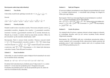 Rozwiązania zadań (etap indywidualny) Zadanie 4. Zadanie 1. W pewnym trójkącie prostokątnym suma długości przyprostokątnych wynosi , a wysokość poprowadzona z wierzchołka kąta prostego ma długość . Oblicz pole tego trójkąta. Trzy liczby = 1, to Udowodnij, że jeśli liczby spełniają warunek + = 1. Dowód: + = Zadanie 2. + = + = = =1 Orzechy dziadka Bądź jak Pitagoras Rozwiązanie Niech , oznaczają długości przyprostokątnych, wysokość !" = ℎ . Przeciwprostokątna AB ma zatem długość $% = &' + ( = & ' + ( − 2'( = √* − 4,. Jednocześnie pole trójkąta jest równe , = !" ∙ $% = ℎ√* − 4,. Z równania , = ℎ√* − 4, otrzymujemy , = ℎ.√* + ℎ − ℎ/. Dziadek rozdał swoim wnuczkom orzechy. Pierwszemu dał jeden orzech i pozostałych orzechów, pozostałych orzechów, drugiemu dwa orzechy i trzeciemu 3 orzechy i pozostałych orzechów itd. aż orzechy skończyły się. Okazało się, że każdy z wnuków dostał tę samą liczbę orzechów. Oblicz ilu jest wnuczków i po ile orzechów dostał każdy z nich? Rozwiązanie. Niech 1+ = oznacza liczbę orzechów. Pierwszy wnuczek dostał . Dla pozostałych wnuczków zostało wnuczek otrzymał 2 + −2 = = co pierwszy, stąd − = . Zatem drugi i musiał otrzymać tyle orzechów . Otrzymujemy = 81. Zatem było dziewięciu wnuczków i każdy z nich otrzymał 9 orzechów. Zadanie 3. Suma kwadratów Udowodnij, że suma kwadratów pięciu kolejnych liczb naturalnych nie może być kwadratem liczby naturalnej. Dowód: −2 + −1 + + +1 + +2 =5 +2 Kwadraty liczb naturalnych przy dzieleniu przez 5 dają resztę 0, 1, 4, a zatem liczba + 2 nie może być podzielna przez 5. Rozpatrywana suma kwadratów jest podzielna przez 5, ale nie jest podzielna przez 25, zatem nie może być kwadratem liczby naturalnej. Zadanie 5. Liczba 10-cyfrowa Czy istnieje liczba 10-cyfrowa, zapisana różnymi cyframi, mająca tę własność, że wykreślając dowolne sześć jej cyfr zawsze uzyskamy liczbę złożoną? Odpowiedź uzasadnij. Rozwiązanie. Np. 1397245680. Jeśli przy wykreślaniu pozostawimy jedną z sześciu ostatnich cyfr to powstała liczba czterocyfrowa będzie parzysta lub podzielna przez 5. Jeśli wykreślimy ostatnie sześć cyfr, to uzyskana liczba (czyli 1397) jest podzielna przez 11.