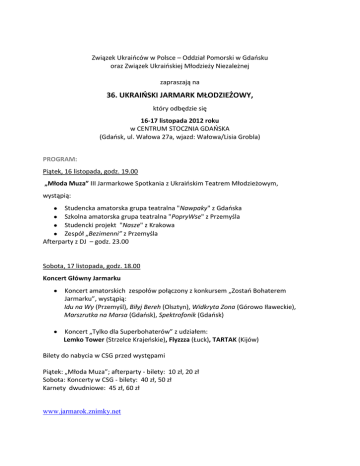 Związek Ukraińców w Polsce – Oddział Pomorski w Gdańsku oraz Związek Ukraińskiej Młodzieży Niezależnej zapraszają na 36. UKRAIŃSKI JARMARK MŁODZIEŻOWY, który odbędzie się 16-17 listopada 2012 roku w CENTRUM STOCZNIA GDAŃSKA (Gdańsk, ul. Wałowa 27a, wjazd: Wałowa/Lisia Grobla) PROGRAM: Piątek, 16 listopada, godz. 19.00 „Młoda Muza” III Jarmarkowe Spotkania z Ukraińskim Teatrem Młodzieżowym, wystąpią: Studencka amatorska grupa teatralna "Nawpaky" z Gdańska Szkolna amatorska grupa teatralna "PopryWse" z Przemyśla Studencki projekt "Nasze" z Krakowa Zespół „Bezimenni” z Przemyśla Afterparty z DJ – godz. 23.00 Sobota, 17 listopada, godz. 18.00 Koncert Główny Jarmarku Koncert amatorskich zespołów połączony z konkursem „Zostań Bohaterem Jarmarku”, wystąpią: Idu na Wy (Przemyśl), Biłyj Bereh (Olsztyn), Widkryta Zona (Górowo Iławeckie), Marszrutka na Marsa (Gdańsk), Spektrofonik (Gdańsk) Koncert „Tylko dla Superbohaterów” z udziałem: Lemko Tower (Strzelce Krajeńskie), Flyzzza (Łuck), TARTAK (Kijów) Bilety do nabycia w CSG przed występami Piątek: „Młoda Muza”; afterparty - bilety: 10 zł, 20 zł Sobota: Koncerty w CSG - bilety: 40 zł, 50 zł Karnety dwudniowe: 45 zł, 60 zł www.jarmarok.znimky.net Ukraiński Jarmark Młodzieżowy jest imprezą cykliczną organizowaną w Trójmieście nieprzerwanie od 1977 roku. Ma charakter ogólnopolski, a podczas dwóch dni Jarmarku prezentowane są małe formy teatralne, występują amatorskie młodzieżowe zespoły wokalno-instrumentalne mniejszości ukraińskiej w Polsce, zespoły inspirowane folklorem ukraińskim oraz gwiazdy sceny muzycznej z Ukrainy. Krok po kroczku, krok za krokiem jeszcze lepszy niż przed rokiem … idzie Jarmark! Ukraiński Jarmark Młodzieżowy to przedsięwzięcie, które pod szyldem dobrej zabawy, młodości i tolerancji łączy ludzi i pokolenia. Jest to wielkie święto ukraińskiej kultury młodzieżowej w Polsce. Stanowi okazję do promocji początkujących twórców, jak również narzuca ton kreując muzyczne trendy młodzieży wywodzącej się z mniejszości ukraińskiej. Jarmark jest jednocześnie wizytówką Ukrainy w Polsce, pokazuje bogactwo form i ekspresji powstających na kanwie wciąż żywej kultury ludowej. Przed nami już trzydzieste szóste spotkanie z efektami kulturalnej działalności młodych Ukraińców. Jarmark rozpoczynamy w piątek (16 listopada) o godzinie 19.00 w specjalnie przygotowanej dla nas industrialnej sali teatralnej Centrum Stocznia Gdańska. Odbędą się tam Trzecie Spotkania z Ukraińskim Teatrem Mołoda Muza. Jest to ukłon w kierunku klasyki ukraińskiego dramatu, a także szansa dla młodych, amatorskich grup teatralnych na zaprezentowanie swoich artystycznych osiągnięć. Główny Koncert Jarmarku natomiast rozpocznie się w sobotę 17 listopada o godzinie 18.00. Na dużej scenie Stoczni Gdańskiej zdecydowanie dominować będą rockowo-folkowe brzmienia, nie zabraknie jednak również bardziej nowoczesnych, inspirujących i niekonwencjonalnych muzycznych projektów. Gwiazdą wieczoru będzie zespół TARTAK z Kijowa. Konkurs "ZOSTAŃ BOHATEREM JARMARKU" ma na celu wyłonienie najlepszego amatorskiego zespołu muzycznego Jarmarku, a także promocję utalentowanych, młodych artystów. Zespoły zakwalifikowane do występu na 36. UJM wezmą udział w sobotnim koncercie i zostaną ocenione przez specjalnie powołane i niezależne jury. Trzy najlepsze zespoły przejdą do kolejnego etapu, który przeprowadzony zostanie w formie głosowania na serwisie społecznościowym Facebook. Nagrodą główną w Konkursie jest zakontraktowany, godzinny występ w ramach przyszłorocznego Koncertu Głównego Jarmarku 2013. Organizatorzy 36. Ukraińskiego Jarmarku Młodzieżowego – Związek Ukraińców w Polsce i Związek Ukraińskiej Młodzieży Niezależnej – gwarantują mnóstwo niezapomnianych kulturalnych wrażeń. Dlatego też wszyscy pozytywnie zakręceni, młodzi duchem, odczuwający „wschodniego bakcyla” amatorzy ukraińskich klimatów powinni niezwłocznie zarezerwować sobie w swoich terminarzach 16 i 17 listopada. Spotkajmy się razem, nieodmiennie w Stoczni na obu wieczorach poświęconych kulturze ukraińskiej. Informacje o zespołach TARTAK Saszko Położyns’kyj wymyślił Tartak jeszcze w 1996 r. Natchnął i zmotywował go fakt, iż w rodzinnym Łucku wśród nowatorskich muzycznych zespołów odbywać się będzie przesłuchanie do udziału w najważniejszemu wówczas ukraińskim festiwalu „Czerwona Ruta”. Muzyka, którą dziś gra Tartak rodziła się w bólach. Wszystko zaczynało się od łamanych rytmów i elektronicznych dźwięków i podłożonych pod to ironicznych, a nawet zuchwałych tekstów. Od tego czasu skład i brzmienie grupy zmieniało się kilkakrotnie, niezmiennym pozostał natomiast głos i temperament założyciela i lidera. Tartak wydał aż pięć własnych albumów, uczestniczył również w różnych projektach z innymi ukraińskimi zespołami i muzykami. Twórczość zespołu czasami ostra, czasami delikatna, a czasami po prostu wesoła, zawsze jednak z misją i bliska sercu świadomego Ukraińca. Dzisiaj chłopcy na żywo grają swoją muzykę, która nasiąknęła duchem alternatywy w różnorodnych przejawach uliczno-garażowo-piwnicznej subkultury. O Tartaku można by pisać wiele, o tym, że jest niewątpliwie jednym z najlepszych zespołów współczesnych na ukraińskim rynku muzycznym. Nie sposób nie wspomnieć też o działalności społecznej i obywatelskiej artystów, o ich udziale w Pomarańczowej Rewolucji, oraz ich krytycznemu stosunkowi do skrajnie niedemokratycznych zachowań aktualnie panującej władzy… Najlepiej jednak po prostu usiąść i posłuchać ich utworów. Wtedy wszystko będzie jasne. Dla wnikliwych i znających język ukraiński: http://tartak.com.ua FLYZZZA To jeden z najlepszych i najpopularniejszych na Ukrainie zespołów nurtu regga