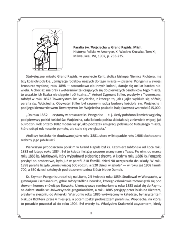 Parafia św. Wojciecha w Grand Rapids, Mich. Historya Polska w Ameryce, X. Wacław Kruszka, Tom XI, Milwaukee, WI, 1907, p. 233-235. Stutysięczne miasto Grand Rapids, w powiecie Kent, stolica biskupa Niemca Richtera, ma trzy kościoły polskie. „Emigracja rodaków naszych do tego miasta — pisze ks. Ponganis w swojej broszurce wydanej roku 1898 — stosunkowo do innych kolonii, datuje się od lat bardzo niewielu. A chociaż nie brak i weteranów zaliczających się do pierwszych osadników tego miasta, to wszakże ich liczba nie sięgnie i pół tuzina..." Antoni Zygmunt Stiller, przybyły z Trzemeszna, założył w roku 1872 Towarzystwo św. Wojciecha, z którego to, jak z jajka wykluła się później parafia św. Wojciecha. Obywatel Stiller był czynnym radcą budowy kościoła św. Wojciecha i pod jego kierownictwem Towarzystwo św. Wojciecha posiadło halę (kasyno) wartości $15,000. „Do roku 1882 — czytamy w broszurce ks. Ponganisa — t. j. kiedy położono kamień węgielny pod pierwszy polski kościół św. Wojciecha, cała kolonia polska składała się z niewiele więcej, jak 60 rodzin. Rok przeto 1882 można wziąć jako początek emigracji polskiej do tutejszego miasta, która odtąd rok rocznie pomału, ale stale się zwiększała." Atoli czy kościoła nie zbudowano już w roku 1881, skoro w listopadzie roku 1906 obchodzono srebrny jego jubileusz? Pierwszym proboszczem polskim w Grand Rapids był ks. Kazimierz Jabłoński od lipca roku 1883 od lutego roku 1884. Był to ksiądz i książę zarazem znany nam z Texas. Po nim, do marca roku 1886 ks. Matkowski, który wybudował plebanię z drzewa. A kiedy w roku 1886 ks. Ponganis przybył po probostwo, było już w parafii 210 familii, dzieci 90 uczęszczało do szkoły. W roku 1898 parafia liczyła „mniej więcej 600 rodzin, a 520 dzieci w szkole" — w roku zaś 1902 familii 700, a 650 dzieci szkolnych pod dozorem tuzina Sióstr Notre Damek. Ks. Szymon Ponganis urodził się na Litwie, 24 kwietnia roku 1859. Studiował w Warszawie, w gimnazjum i seminarium, gdzie założył Kółko Litewskie, którego członkowie zobowiązali się pod słowem honoru mówić po litewsku. Ukończywszy seminarium w roku 1883 udał się do Rzymu na dalsze studia w Uniwersytecie gregoriańskim, a roku 1885 przyjęty przez biskupa Richtera, przybył w sierpniu do Ameryki. W grudniu roku 1885 wyświęcony w katedrze, był asystentem biskupa Richtera przez 4 miesiące, a potem został proboszczem parafii św. Wojciecha, na której to posadzie pozostał aż do roku 1904. Był wtedy ks. Władysław Krakowski asystentem, kiedy 1 ks. Ponganis był przez biskupa zmuszony opuścić Grand Rapids. Wynikły stąd długie procesy w niższych i wyższych instancjach, w których przyznano słuszność po części biskupowi i po części ks. Ponganisowi, czyli właściwie mówiąc, żadnemu z nich nie przyznano słuszności, tak, że sprawa pozostała in statu quo. A ks. Ponganis, jako mądry, ustąpił z Grand Rapids na mniejszą parafię w Gaylord, Mich., ile że wolał krzywdę cierpieć niż krzywdę czynić. Z Gaylord na jego miejsce w roku 1904 przybył ks. Kazimierz Skory, który „swym serdecznym, spokojnym i taktownym postępowaniem zjednał sobie serca wszystkich parafian". Pomimo że z parafii św. Wojciecha wyrosły już dwie inne, ona sama w roku 1906 liczyła 700 familii a wciąż się zwiększa tak, że ów z drzewa budowany kościół okazał się już dawno za mały. Dziatwy w szkole blisko 700. 2