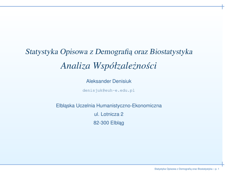 Statystyka Opisowa z Demografia˛ oraz Biostatystyka Analiza Współzależności Aleksander Denisiuk [email protected] Elblaska ˛ Uczelnia Humanistyczno-Ekonomiczna ul. Lotnicza 2 82-300 Elblag ˛ Statystyka Opisowa z Demografia˛ oraz Biostatystyka – p. 1 Analiza Współzależności Najnowsza wersja tego dokumentu dostepna ˛ jest pod adresem http://denisjuk.euh-e.edu.pl/ Statystyka Opisowa z Demografia˛ oraz Biostatystyka – p. 2 Współzależność statystyczna • zwiazki ˛ miedzy ˛ zjawiskami • duża liczba obserwacji • wykrywanie zwiazków ˛ • analiza statystyczna poprzedzana jest analiza˛ logiczna˛ zwiazków ˛ • pary cech, każda jednostka ststystyczna scharakteryzowana jednocześnie dwoma cechami Statystyka Opisowa z Demografia˛ oraz Biostatystyka – p. 3 Metody analizy współzależnośi • korelacja — wzajemne oddziaływanie • regresja — wpływ jednej cechy (przyczyny) na druga˛ (skutek) • forma opisu ◦ tabelaryczna (czeregi lub tablice) ◦ graficzna (diagram korelacji) ◦ parametryczna (liczbowa) • zależy od rodzaju cech (ilościowe, jakościowe) Statystyka Opisowa z Demografia˛ oraz Biostatystyka – p. 4 Ocena rodzaju zwiazku ˛ • korelacja dodatnia • korelacja ujemna • poszczególne obserwacje moga˛ odbiegać od stwierdzonej prawidłowości Statystyka Opisowa z Demografia˛ oraz Biostatystyka – p. 5 Przykład (wojewódzstwo Pomorskie) powiat liczba ludności liczba podmiotów sektora publicznego bytowski 76,0 164 chojnicki 90,3 182 człuchowski 58,6 124 kartuski 98,0 170 kościerski 65,0 136 kwidzyński 82,6 146 leborski ˛ 65,2 199 malborski 108,8 234 nowodworski 36,5 86 gdański 74,7 128 pucki 69,9 142 słupski 93,7 154 starogardski 121,0 232 tczewski 113,4 178 wejherowski 166,7 209 Statystyka Opisowa z Demografia˛ oraz Biostatystyka – p. 6 ! Diagram korelacyjny • zwiazek ˛ korelacyjny dodatni • zbliżony do liniowego • umiarkowana siła współzależnośi Statystyka Opisowa z Demografia˛ oraz Biostatystyka – p. 7 Miary korelacji Miara współczynnik korelacji linowej Pearsona współczynnik korelacji rang Spearmana współczynnik zbieżności T Czuprowa Cechy Zwiazek ˛ Prezentacja obie ilościowe liniowy szeregi, tablice liniowy szeregi nie ma znaczenia tablice obie ilościowe lub jakościowe w skali porzadkowej ˛ obie ilościowe lub jakościowa i ilościowa Statystyka Opisowa z Demografia˛ oraz Biostatystyka – p. 8 Współczynnik korelacji liniowej Pearsona • pokazuje siłe˛ i kierunek współzależnośi • r= n P (xi −x̄)(yi −ȳ) i=1 n·sx ·sy n n P xi yi − i=1 s n· n P i=1 x2i − n P = i=1 n P n P (xi −x̄)(yi −ȳ) i=1 s i=1 n P (xi −x̄)2 xi = (yi −ȳ)2 i=1 i=1 n P n P yi i=1 2 n n 2 P 2 P · n· xi yi − yi i=1 i=1 Statystyka Opisowa z Demografia˛ oraz Biostatystyka – p. 9 Determinacja i indeterminacja • r2 — współczynnik determinacji ◦ pokazuje jaka cz˛eść zmienności cechy jest wyjaśnona ukształtowaniem sie˛ drugiej cechy • φ2 = 1 − r2 — współczynnik indeterminacji ◦ pokazuje jaka cz˛eść zmienności cechy nie może być wyjaśnona ukształtowaniem sie˛ drugiej cechy Statystyka Opisowa z Demografia˛ oraz Biostatystyka – p. 10 Współczynnik Pearsona. Przykład • ceny działek budowlanych w zależności od odległości od centrum miasta odległość (km) cena (zł/m2 ) 0 1000 1 900 2 500 3 500 4 270 5 300 6 100 • r = −0,959 • r2 = 0,920 Statystyka Opisowa z Demografia˛ oraz Biostatystyka – p. 11 Współczynnik korelacji rang Spearmana • wartości cech zastepujemy ˛ rangami (od 1 do n) ◦ jeżeli kilka cech maja˛ te same rangi, zastepujemy ˛ liczba˛ średnia˛ • zgodność uporzadkować ˛ cech • przyjmuje wartości w przedziale [−1, 1] • znak + oznacza uporzadkowanie ˛ zgodne • znak − oznacza uporzadkowanie ˛ przeciwne • im bliższy do ±1, tym zwiazek ˛ jest silniejszy 6 • rs = 1 − n P d2i i=1 n(n2 −1) , gdzie di jest różnica miedzy ˛ rangami Statystyka Opisowa z Demografia˛ oraz Biostatystyka – p. 12 Współczynnik Spearmana. Przykład • 1 tura wyborów 1995 roku kandydat A. Kwaśniewski L. Wałesa ˛ J. Kuroń J. Olszewski W. Pawlak T. Zieliński H. Gronkiewicz-Waltz J. Korwin-Mikke odsetek głosów miast wsi 31,4 33,4 33,4 33,4 13,3 6,3 7,0 7,2 0,5 9,5 4,6 2,5 3,5 2,7 4,3 1,4 • rs = 0,542 Statystyka Opisowa z Demografia˛ oraz Biostatystyka – p. 13 Współczynnik zbieżności T Czuprowa • dowolne dwie cechy, przedstawione w postaci tablicy (zazwyczaj jakościowe) • przyjmuje wartości w przedziale [0, 1] • im bliżej 1, tym silniejsza jest współzależność • tablica korelacyjna ◦ k wierszy, dotyczacych ˛ wariantów cechy X ◦ l kolumn, dotyczacych ˛ wariantów cechy Y ◦ nij jest liczba˛ jednostek, posiadajacych ˛ i-ty wariant cechy X i j -ty wariant cechy Y Statystyka Opisowa z Demografia˛ oraz Biostatystyka – p. 14 Obliczenie współczynnika T Czuprowa 1. dla każdego pola oblicza sie˛ liczebności teoretyczne n̂ij = nin·nj , gdzie ni jest suma˛ wiersza, nj — suma˛ kolumny P P (nij −n̂ij )2 P P n2ij 2 = 2. statystyka chi-kwadrat χ = n̂ij n̂ij − n i i j 3. współczynnik zbieżności T Czuprowa T = r n j χ2 , (k−1)(l−1) √ gdzie k jest ilościa˛ wierszy, l — kolumn Statystyka Opisowa z Demografia˛ oraz Biostatystyka – p. 15 Współczynnik T Czuprowa. Przykład • czy opinia o pracy służby zdrowia zależy do płci? opinia negatywna pozytywna M 120 280 K 240 360 • T = 0,10 (nie zależy) Statystyka Opisowa z Demografia˛ oraz Biostatystyka – p. 16 Model regresji liniowej • funkcja regresji opisuje wpływ, jaki wywiera przyczyna na skutku: ŷi = f (xi ) • funkcja regresji jest funkcja˛ matematyczna˛ określonego typu, która jest przybliżeniem faktycznej zależnośći • postać funkcji ustala sie˛ na podstawie zaobserowanych wartośći (xi , yi ) ◦ zaobserwowane wartości bed ˛ a˛ sie˛ odchylały od funkcji po wpływem ce