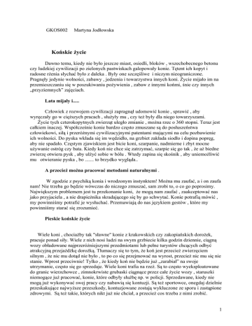 GKOS002 Martyna Jodłowska Końskie życie Dawno temu, kiedy nie było jeszcze miast, osiedli, bloków , wszechobecnego betonu czy ludzkiej cywilizacji po zielonych pastwiskach galopowały konie. Tętent ich kopyt i radosne rżenia słychać było z daleka . Były one szczęśliwe i niczym nieograniczone. Pragnęły jedynie wolności, zabawy , jedzenia i towarzystwa innych koni. Życie mijało im na przemieszczaniu się w poszukiwaniu pożywienia , zabaw z innymi końmi, śnie czy innych „przyziemnych” zajęciach. Lata mijały i..... Człowiek z rozwojem cywilizacji zapragnął udomowić konie , sprawić , aby wyręczały go w cięższych pracach , służyły mu , czy też były dla niego towarzyszami. Życie tych czterokopytnych zwierząt uległo zmianie , można rzec o 360 stopni. Teraz jest całkiem inaczej. Współcześnie konie bardzo często zmuszane są do posłuszeństwa człowiekowi, siłą i przeróżnymi cywilizacyjnymi patentami mającymi na celu pozbawienie ich wolności. Do pyska wkłada się im wędzidło, na grzbiet zakłada siodło i dopina popręg, aby nie spadało. Częstym zjawiskiem jest bicie koni, szarpanie, nadmierne i zbyt mocne używanie ostróg czy bata. Kiedy koń nie chce się zatrzymać, szarpie się go tak , że aż biedne zwierzę otwiera pysk , aby ulżyć sobie w bólu . Wtedy zapina się skośnik , aby uniemożliwić mu otwieranie pyska , bo ....... to brzydko wygląda.. A przecież można pracować metodami naturalnymi . W zgodzie z psychiką konia i wrodzonym instynktem! Można mu zaufać, a i on zaufa nam! Nie trzeba go będzie wówczas do niczego zmuszać, sam zrobi to, o co go poprosimy. Największym problemem jest tu przekonanie koni, że mogą nam zaufać , zaakceptować nas jako przyjaciela , a nie drapieżnika skradającego się by go schwytać. Konie potrafią mówić , my powinniśmy potrafić je wysłuchać. Przemawiają do nas językiem gestów , które my powinniśmy starać się zrozumieć. Pieskie końskie życie Wiele koni , chociażby tak "sławne" konie z krakowskich czy zakopiańskich dorożek, pracuje ponad siły. Wiele z nich nosi ludzi na swym grzbiecie kilka godzin dziennie, ciągną wozy obładowane najprzeróżniejszymi przedmiotami lub pełne turystów chcących odbyć atrakcyjną przejażdżkę dorożką. Tłumaczy się to tym, że koń jest przecież zwierzęciem silnym , że nic mu dotąd nie było , to po co się przejmować na wyrost, przecież nic mu się nie stanie. Wprost przeciwnie! Tylko , że kiedy koń nie będzie już „zarabiał” na swoje utrzymanie, często się go sprzedaje. Wiele koni trafia na rzeź. Są to często wyeksploatowane do granic wierzchowce , zimnokrwiste grubaski ciągnące przez całe życie wozy , staruszki niemogące już pracować, konie, które odbyły służbę np. w policji. Sprzedawane, kiedy nie mogą już wykonywać swej pracy czy nabawią się kontuzji. Są też sportowce, onegdaj dzielnie przeskakujące najwyższe przeszkody, kontuzjowane zostają wykluczone ze sporu i zastąpione zdrowymi. Są też takie, których nikt już nie chciał, a przecież cos trzeba z nimi zrobić. 1 Najwięcej chętnych jest na małe , młodziutkie źrebaki. Im młodsze, tym lepsze. Dziesiątki tysięcy koni rocznie spotyka ten los. Na emigrację po śmierć. Polska jest jednym z największych sprzedawców koni na mięso, głównie do Włoch. Włoscy konsumenci potrzebują ogromnych ilości koniny, a w Polsce jest ona tania , zaś prawo przychylne handlarzom. Konie te wiezione są przez wiele godzin, często nawet dni. Podczas wielodniowych transportów co jakiś czas powinny być postoje trwające ok. 24 godzin, aby konie mogły wyjść, czy zostać napojone . Jednak czas to pieniądz ,a klienci wolą mięso "suche". Konie wiązane są krótko, kiedy droga zakręca, często przewracają się, tratując się wzajemnie i tratują. Są osłabione, odwodnione, brudne i poranione, większość jest wycieńczona, część zdycha. Kiedy trafiają na miejsce, są wywlekane z ciężarówek i wciągane do rzeźni. Według prawa przed śmiercią powinny być ogłuszone, jednak często jest to ignorowane. A przecież może być inaczej! Ile to razy dziennikarze podejmowali ten temat, ile spraw czy dochodzeń się odbyło.. Jakże często można było o tym przeczytać w gazetach , czy usłyszeć w telewizji.. Jednak zwierzęta dalej cierpią, a prawo jest dalej łamane i ignorowane... Są fundacje odkupujące konie od handlarzy. Odbywają się aukcje, na których można zakupić tak zwaną cegiełkę , czyli ulotkę ze zdjęciem konia. Jej koszt to 5zł , czasem trochę więcej , a kupiona przez wiele ludzi może uratować końskie życie. Za zebrane pieniądze wykupywane są konie z rzeźni , lub leki , witaminy i sprzęt potrzebny dla podopiecznych takich fundacji. Wiele ludzi podchodzi do tego z lekceważeniem, a przecież to tak niewiele , a może tak bardzo pomóc! Uratowanie jednego konia całego świata nie zmieni , ale na pewno świat ulegnie zmianie dla tego właśnie konia. Każdy powinien zrozumieć, że koń to też żywe stworzenie. Czuje, pragnie zaufania i miłości ,a nie bólu i przemocy tak często towarzyszących jeździectwu , czy hodowli... Czy potrafimy im to dać? Przecież na to zasługują. 2