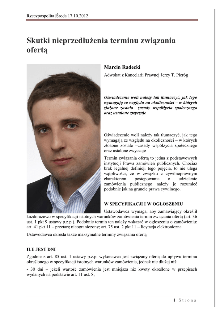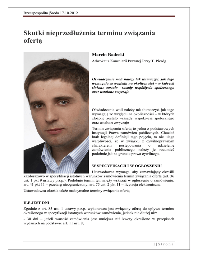 Rzeczpospolita |Środa 17.10.2012 Skutki nieprzedłużenia terminu związania ofertą Marcin Radecki Adwokat z Kancelarii Prawnej Jerzy T. Pieróg Oświadczenie woli należy tak tłumaczyć, jak tego wymagają ze względu na okoliczności – w których złożone zostało –zasady współżycia społecznego oraz ustalone zwyczaje Oświadczenie woli należy tak tłumaczyć, jak tego wymagają ze względu na okoliczności – w których złożone zostało –zasady współżycia społecznego oraz ustalone zwyczaje Termin związania ofertą to jedna z podstawowych instytucji Prawa zamówień publicznych. Chociaż brak legalnej definicji tego pojęcia, to nie ulega wątpliwości, że w związku z cywilnoprawnym charakterem postępowania o udzielenie zamówienia publicznego należy je rozumieć podobnie jak na gruncie prawa cywilnego. W SPECYFIKACJI I W OGŁOSZENIU Ustawodawca wymaga, aby zamawiający określił każdorazowo w specyfikacji istotnych warunków zamówienia termin związania ofertą (art. 36 ust. 1 pkt 9 ustawy p.z.p.). Podobnie termin ten należy wskazać w ogłoszeniu o zamówieniu: art. 41 pkt 11 – przetarg nieograniczony; art. 75 ust. 2 pkt 11 – licytacja elektroniczna. Ustawodawca określa także maksymalne terminy związania ofertą ILE JEST DNI Zgodnie z art. 85 ust. 1 ustawy p.z.p. wykonawca jest związany ofertą do upływu terminu określonego w specyfikacji istotnych warunków zamówienia, jednak nie dłużej niż: - 30 dni – jeżeli wartość zamówienia jest mniejsza niż kwoty określone w przepisach wydanych na podstawie art. 11 ust. 8; 1|Strona Rzeczpospolita |Środa 17.10.2012 - 90 dni – jeżeli wartość zamówienia dla robót budowlanych jest równa lub przekracza wyrażoną w złotych równowartość kwoty 20 mln euro, a dla dostaw lub usług – 10 mln euro; - 60 dni – jeżeli wartość zamówienia jest inna niż określona w pkt 1 i 2. Z CZYJEJ INICJATYWY Często zdarza się, że zamawiający nie dokonują wyboru oferty najkorzystniejszej w terminie związania ofertą, zwłaszcza w przypadku przetargów o dużej wartości lub gdy ocena ofert jest czasochłonna. Ustawodawca taką sytuacje przewidział, postanawiając w art. 85 ust. 2 ustawy p.z.p., że wykonawca samodzielnie lub na wniosek zamawiającego może przedłużyć termin związania ofertą, z tym że zamawiający może tylko raz, co najmniej na 3 dni przed upływem terminu związania ofertą, zwrócić się do wykonawców o wyrażenie zgody na przedłużenie tego terminu o oznaczony okres, nie dłuższy jednak niż 60 dni. Wobec tego przedłużenie terminu związania ofertą może nastąpić zarówno z inicjatywy zamawiającego, jak i wykonawcy. Jednak zamawiający taką inicjatywę może przejawić tylko raz. W JAKIEJ FORMIE Ustawodawca nie określił formy, w jakiej oświadczenie o wyrażeniu zgody powinno być złożone. Nie stawia w tym zakresie żadnych wymagań. Trzeba zatem stwierdzić, że nie musi to być forma pisemna. Gdyby tak było, to zapewne ustawodawca wskazałby to wprost, jak np. w art. 82 ust. 2 czy 139 ust. 2 ustawy p.z.p. W takiej sytuacji forma złożenia przedmiotowego oświadczenia powinna być zgodna z regulacją art. 27 ust. 1 ustawy p.z.p., co oznacza, że wykonawca może skorzystać z wszystkich form komunikacji dopuszczonych w postępowaniu. Zgodnie bowiem z art. 36 ust. 1 pkt 7 ustawy p.z.p., specyfikacja istotnych warunków zamówienia zawiera co najmniej informacje o sposobie porozumiewania się zamawiającego z wykonawcami oraz przekazywania oświadczeń lub dokumentów, a także wskazanie osób uprawnionych do porozumiewania się z wykonawcami. PRZED UPŁYWEM PIERWOTNEGO TERMINU Jak wskazała Krajowa Izba Odwoławcza w wyroku z 15 czerwca 2011, KIO 1191/11oświadczenie o przedłużeniu terminu związania ofertą, stanowiące o podtrzymaniu przez wykonawcę swojej woli złożenia oferty w danym postępowaniu o udzielenie zamówienia publicznego, jest oświadczeniem wykonawcy składnym w ofercie, a w przypadku przedłużania się procedury udzielenia zamówienia publicznego oświadczeniem, które należy złożyć zamawiającemu przed upływem pierwotnego terminu związania ofertą. Niewątpliwe oświadczenie to jest oświadczeniem, o którym mowa w art. 27 ust. 1 ustaw p.z.p., co do którego także zamawiający w SIWZ określił dwie możliwe formy przekazu: pisemnie lub faksem. 2|Strona Rzeczpospolita |Środa 17.10.2012 SKUTKI BRAKU OŚWIADCZENIA Zgodnie z art. 85 ust. 3 ustawy p.z.p. odmowa wyrażenia zgody, o której mowa w ust. 2 , nie powoduje utraty wadium. Co do zasady, brak złożenia przez wykonawcę oświadczenia o przedłużeniu terminu związania ofertą powinien skutkować wykluczeniem z postępowania o udzielenie zamówienia publicznego. Zgodnie z art. 24 ust. 2 pkt 2 ustawy p.z.p. z postępowania o udzielenie zamówienia wyklucza się wykonawców, którzy nie wnieśli wadium do upływu terminu składania ofert, na przedłużony okres związania ofertą lub w terminie, o którym mowa w art. 46 ust. 3, albo nie zgodzili się na przedłużenie okresu związania ofertą. SĄ ROZBIEŻNOŚCI W orzecznictwie Krajowej Izby Odwoławczej występują jednak rozbieżności co do zasadności wykluczenia na tej podstawie w sytuacji, gdy wykonawca nie złożył przedmiotowego oświadczenia, a zamawiający nie wzywał wykonawcy do przedłużenia terminu związania ofertą. Występują dwa przeciwstawne poglądy. Zgodnie z pierwszym należy bezwzględnie takiego wykonawcę wykluczyć. Takie stanowisko przedstawiła Krajowa Izba Odwoławcza w wyroku z 5 września 2011, KIO 1815/11. ZAWSZE TRZEBA WYKLUCZYĆ Krajowa Izba Odwoławcza w tym wyroku podkreśliła, że przesłanką możliwości wykluczenia wykonawcy na podstawie art. 24 ust. 2 pkt 2 ustawy nie jest uprzednie wezwanie wykonawcy przez zamawiającego do przedłużenia terminu związania ofertą. Z treści artykułu 24 nie wynika, aby brak zgody wykonawcy, o którym mowa w tym przepisie, musiał być p