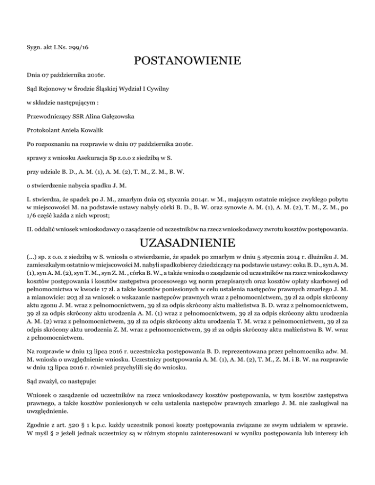 Sygn. akt I.Ns. 299/16 POSTANOWIENIE Dnia 07 października 2016r. Sąd Rejonowy w Środzie Śląskiej Wydział I Cywilny w składzie następującym : Przewodniczący SSR Alina Gałęzowska Protokolant Aniela Kowalik Po rozpoznaniu na rozprawie w dniu 07 października 2016r. sprawy z wniosku Asekuracja Sp z.o.o z siedzibą w S. przy udziale B. D., A. M. (1), A. M. (2), T. M., Z. M., B. W. o stwierdzenie nabycia spadku J. M. I. stwierdza, że spadek po J. M., zmarłym dnia 05 stycznia 2014r. w M., mającym ostatnie miejsce zwykłego pobytu w miejscowości M. na podstawie ustawy nabyły córki B. D., B. W. oraz synowie A. M. (1), A. M. (2), T. M., Z. M., po 1/6 część każda z nich wprost; II. oddalić wniosek wnioskodawcy o zasądzenie od uczestników na rzecz wnioskodawcy zwrotu kosztów postępowania. UZASADNIENIE (...) sp. z o.o. z siedzibą w S. wniosła o stwierdzenie, że spadek po zmarłym w dniu 5 stycznia 2014 r. dłużniku J. M. zamieszkałym ostatnio w miejscowości M. nabyli spadkobiercy dziedziczący na podstawie ustawy: coka B. D., syn A. M. (1), syn A. M. (2), syn T. M., syn Z. M. , córka B. W., a także wniosła o zasądzenie od uczestników na rzecz wnioskodawcy kosztów postępowania i kosztów zastępstwa procesowego wg norm przepisanych oraz kosztów opłaty skarbowej od pełnomocnictwa w kwocie 17 zł. a także kosztów poniesionych w celu ustalenia następców prawnych zmarłego J. M. a mianowicie: 203 zł za wniosek o wskazanie następców prawnych wraz z pełnomocnictwem, 39 zł za odpis skrócony aktu zgonu J. M. wraz z pełnomocnictwem, 39 zł za odpis skrócony aktu małżeństwa B. D. wraz z pełnomocnictwem, 39 zł za odpis skrócony aktu urodzenia A. M. (1) wraz z pełnomocnictwem, 39 zł za odpis skrócony aktu urodzenia A. M. (2) wraz z pełnomocnictwem, 39 zł za odpis skrócony aktu urodzenia T. M. wraz z pełnomocnictwem, 39 zł za odpis skrócony aktu urodzenia Z. M. wraz z pełnomocnictwem, 39 zł za odpis skrócony aktu małżeństwa B. W. wraz z pełnomocnictwem. Na rozprawie w dniu 13 lipca 2016 r. uczestniczka postępowania B. D. reprezentowana przez pełnomocnika adw. M. M. wniosła o uwzględnienie wniosku. Uczestnicy postępowania A. M. (1), A. M. (2), T. M., Z. M. i B. W. na rozprawie w dniu 13 lipca 2016 r. również przychylili się do wniosku. Sąd zważył, co następuje: Wniosek o zasądzenie od uczestników na rzecz wnioskodawcy kosztów postępowania, w tym kosztów zastępstwa prawnego, a także kosztów poniesionych w celu ustalenia następców prawnych zmarłego J. M. nie zasługiwał na uwzględnienie. Zgodnie z art. 520 § 1 k.p.c. każdy uczestnik ponosi koszty postępowania związane ze swym udziałem w sprawie. W myśl § 2 jeżeli jednak uczestnicy są w różnym stopniu zainteresowani w wyniku postępowania lub interesy ich są sprzeczne, sąd może stosunkowo rozdzielić obowiązek zwrotu kosztów lub włożyć go na jednego z uczestników w całości. To samo dotyczy zwrotu kosztów postępowania wyłożonych przez uczestników. Natomiast § 3 stanowi, że jeżeli interesy uczestników są sprzeczne, sąd może włożyć na uczestnika, którego wnioski zostały oddalone lub odrzucone, obowiązek zwrotu kosztów postępowania poniesionych przez innego uczestnika. Przepis powyższy stosuje się odpowiednio, jeżeli uczestnik postępował niesumiennie lub oczywiście niewłaściwie. Wykładnia zawartego w art. 520 § 2 i 3 k.p.c. pojęcia sprzeczności interesów może budzić wątpliwości, skoro jednak przepis ten odnosi się do rozliczenia kosztów pomiędzy uczestnikami, tj. osobami, których praw dotyczy wynik postępowania (art. 510 § 1 k.p.c.), to reguły wykładni systemowej i logicznej pozwalają przyjąć, że sprzeczność interesów zachodzi wtedy, gdy postanowienie kończące postępowanie w sprawie może wywrzeć wpływ dla jednych zainteresowanych na zwiększenie, a dla innych na zmniejszenie sfery ich uprawnień. Stworzenie katalogu spraw, w których interesy uczestników są sprzeczne nie jest możliwe, nie powinno jednak budzić sprzeciwu stwierdzenie, że w postępowaniu nieprocesowym są rozpoznawane sprawy, w których interesy uczestników zazwyczaj są sprzeczne oraz, że do tej kategorii zaliczają się sprawy o stwierdzenie nabycia własności rzeczy przez zasiedzenie, czy sprawy o ustanowienie drogi pomiędzy występującym z takim wnioskiem a właścicielem nieruchomości, która ma zostać obciążona służebnością gruntową (postanowienie Sądu Najwyższego z dnia 26 lipca 2012 r. II CZ 86/12 LEX nr 1228797, postanowienie Sądu Najwyższego z dnia 5 grudnia 2012 r. I CZ 148/12 I CZ 148/12). Sprzeczność interesów pomiędzy uczestnikami daje sądowi możliwość włożenia na uczestnika, którego wnioski zostały oddalone lub odrzucone, obowiązku zwrotu kosztów postępowania poniesionych przez innego zainteresowanego (art. 520 § 3 zdanie pierwsze k.p.c.). Regulacja ta zbliża się w pewnym sensie do unormowania zawartego w art. 98 § 1 k.p.c., gdyż ustawodawca musiał uwzględnić niebudzący wątpliwości fakt, że niejednokrotnie pomiędzy uczestnikami postępowania nieprocesowego toczą się spory i wtedy w pewnym sensie upodabnia się ono do procesu, w którym można usytuować poszczególnych zainteresowanych w pozycji wygrywający - przegrywający (por. postanowienie Sądu Najwyższego z dnia 27 lipca 1960 r., I CR 640/60, OSN 1961, nr 4, poz. 109). Należy jednak podkreślić, że sytuacja w postępowaniu nieprocesowym jest inna niż w procesie, w którym przegranie sprawy z reguły wywołuje skutek w postaci obowiązku zwrotu kosztów. Wynika to wprost z zawartego w art. 520 § 2 i 3 k.p.c. wyrażenia "sąd może". W postępowaniu nieprocesowym sąd ma więc możliwość oceny, czy rodzaj sprawy, jej okoliczności, wątpliwość występujących w niej zagadnień prawnych czyniły i w jakim zakresie nietrafność lub nawet oczywistą niesłuszność stanowiska któregoś z uczestnik