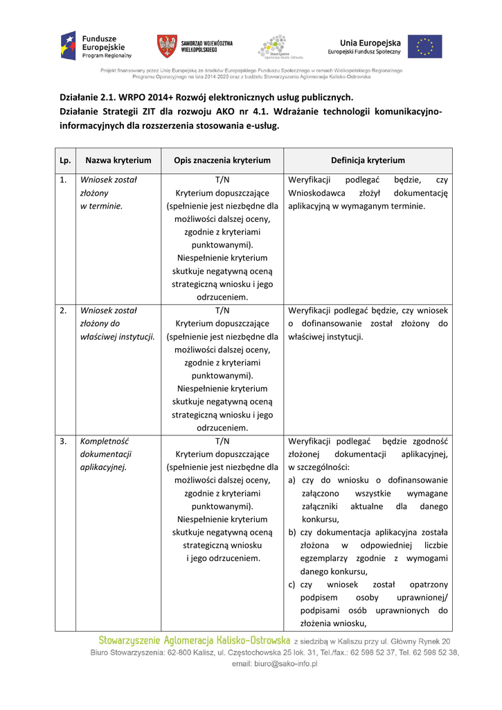 Działanie 2.1. WRPO 2014+ Rozwój elektronicznych usług publicznych. Działanie Strategii ZIT dla rozwoju AKO nr 4.1. Wdrażanie technologii komunikacyjnoinformacyjnych dla rozszerzenia stosowania e-usług. Lp. Nazwa kryterium 1. Wniosek został złożony w terminie. 2. Wniosek został złożony do właściwej instytucji. 3. Kompletność dokumentacji aplikacyjnej. Opis znaczenia kryterium Definicja kryterium T/N Kryterium dopuszczające (spełnienie jest niezbędne dla możliwości dalszej oceny, zgodnie z kryteriami punktowanymi). Niespełnienie kryterium skutkuje negatywną oceną strategiczną wniosku i jego odrzuceniem. T/N Kryterium dopuszczające (spełnienie jest niezbędne dla możliwości dalszej oceny, zgodnie z kryteriami punktowanymi). Niespełnienie kryterium skutkuje negatywną oceną strategiczną wniosku i jego odrzuceniem. T/N Kryterium dopuszczające (spełnienie jest niezbędne dla możliwości dalszej oceny, zgodnie z kryteriami punktowanymi). Niespełnienie kryterium skutkuje negatywną oceną strategiczną wniosku i jego odrzuceniem. Weryfikacji podlegać będzie, czy Wnioskodawca złożył dokumentację aplikacyjną w wymaganym terminie. Weryfikacji podlegać będzie, czy wniosek o dofinansowanie został złożony do właściwej instytucji. Weryfikacji podlegać będzie zgodność złożonej dokumentacji aplikacyjnej, w szczególności: a) czy do wniosku o dofinansowanie załączono wszystkie wymagane załączniki aktualne dla danego konkursu, b) czy dokumentacja aplikacyjna została złożona w odpowiedniej liczbie egzemplarzy zgodnie z wymogami danego konkursu, c) czy wniosek został opatrzony podpisem osoby uprawnionej/ podpisami osób uprawnionych do złożenia wniosku, 4. Obszar realizacji projektu. 5. Prawidłowy poziom i wartość wnioskowanego dofinansowania. 6. Okres realizacji projektu. T/N Kryterium dopuszczające (spełnienie jest niezbędne dla możliwości dalszej oceny, zgodnie z kryteriami punktowanymi). Niespełnienie kryterium skutkuje negatywną oceną strategiczną wniosku i jego odrzuceniem. T/N Kryterium dopuszczające (spełnienie jest niezbędne dla możliwości dalszej oceny, zgodnie z kryteriami punktowanymi). Niespełnienie kryterium skutkuje negatywną oceną strategiczną wniosku i jego odrzuceniem. T/N Kryterium dopuszczające (spełnienie jest niezbędne dla możliwości dalszej oceny, zgodnie z kryteriami punktowanymi). Niespełnienie kryterium skutkuje negatywną oceną strategiczną wniosku i jego odrzuceniem. d) czy dokumentacja aplikacyjna w formie elektronicznej została przygotowana na właściwym nośniku informatycznym w odpowiednim pliku i możliwe jest odczytanie danych zawartych na nośniku informatycznym. Weryfikacja będzie miała charakter wstępny, pełna ocena kryterium będzie miała miejsce podczas oceny formalnej przeprowadzonej przez IZ WRPO 2014+. Weryfikacji podlegać będzie, czy projekt jest realizowany na obszarze Aglomeracji Kalisko-Ostrowskiej (tj. obszarze funkcjonalnym ośrodka regionalnego Kalisza z Ostrowem Wielkopolskim wyznaczonego Uchwałą Nr 4014/2013 ZWW z dn. 07.11.2013 r.). Weryfikacji podlegać będzie właściwy poziom i wartość dofinansowania. Weryfikacji podlegać będzie zgodność założonego okresu realizacji projektu. 7. Wnioskodawca złożył w danym konkursie jeden projekt. 8. Zgodność projektu ze Strategią Zintegrowanych Inwestycji Terytorialnych dla rozwoju Aglomeracji KaliskoOstrowskiej. 9. Powszechność oferowanej usługi. T/N/ND Jeżeli w dokumentacji konkursowej/ Kryterium dopuszczające w wezwaniu do złożenia wniosku (spełnienie jest niezbędne dla określono, że Wnioskodawca może złożyć możliwości dalszej oceny, maksymalnie jeden wniosek zgodnie z kryteriami o dofinansowanie, to przekroczenie tej punktowanymi). liczby wyklucza Wnioskodawcę z dalszej Niespełnienie kryterium oceny (jeśli dotyczy). skutkuje negatywną oceną strategiczną wniosku i jego odrzuceniem. T/N Weryfikacji podlegać będzie, czy projekt Kryterium dopuszczające jest zgodny ze Strategią ZIT dla rozwoju (spełnienie jest niezbędne dla AKO, tj.: możliwości dalszej oceny, - priorytetami/ celami/ działaniami zgodnie z kryteriami określonymi w Strategii, punktowanymi). - planowanym zakresem wsparcia Niespełnienie kryterium wskazanym w Strategii, skutkuje negatywną oceną - czy wybrane wskaźniki produktu strategiczną wniosku i jego i rezultatu odzwierciedlają zakres odrzuceniem. rzeczowy projektu, a założone do osiągnięcia wartości są realne do osiągnięcia. T/N Weryfikacji podlegać będzie, czy Kryterium dopuszczające Wnioskodawca wykazał, że przynajmniej (spełnienie jest niezbędne dla jedna usługa będzie powszechnie możliwości dalszej oceny, wykorzystywana, tzn. że jest skierowana zgodnie z kryteriami do licznej lub często korzystającej grupy punktowanymi). odbiorców oraz że istnieje znaczne Niespełnienie kryterium prawdopodobieństwo, że będzie skutkuje negatywną oceną wykorzystywana przez znaczny odsetek strategiczną wniosku i jego danej grupy odbiorców. odrzuceniem. 10. Wpływ wartości wskaźników przyjętych w projekcie na realizację celów Strategii ZIT dla rozwoju AKO. 0-8 11. Wpływ projektu na rozwój społeczeństwa informacyjnego. 0-9 12. Komplementarność projektu z innymi projektami. 0-3 Ocenie podlegać będzie poprawność, wiarygodność i kompletność oraz wpływ zadeklarowanych wartości przyjętych wskaźników na osiągnięcie celów Strategii ZIT dla rozwoju AKO. Za spełnienie ww. wymogów projekt otrzyma: a) za poprawność, wiarygodność i kompletność przyjętych wskaźników – 0-2 pkt, b) za udział w realizacji wartości docelowych wskaźników produktu ujętych w Strategii ZIT dla rozwoju AKO – 0-3 pkt, c) za udział w realizacji wartości docelowej wskaźnika rezultatu ujętego w Strategii ZIT dla rozwoju AKO – 0-3 pkt. Dla określenia ilości punktów wg ww. wymogów określonych w ppkt b będą brane pod u