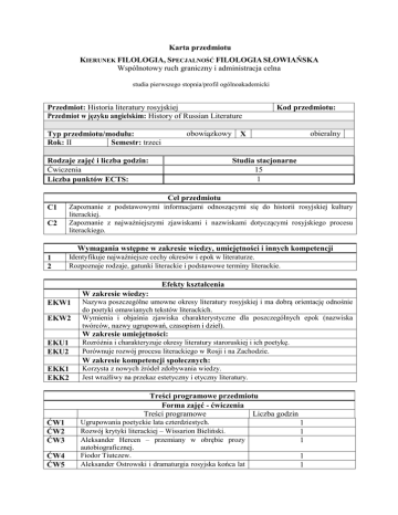 Karta przedmiotu KIERUNEK FILOLOGIA, SPECJALNOŚĆ FILOLOGIA SŁOWIAŃSKA Wspólnotowy ruch graniczny i administracja celna studia pierwszego stopnia/profil ogólnoakademicki Przedmiot: Historia literatury rosyjskiej Przedmiot w języku angielskim: History of Russian Literature obowiązkowy Typ przedmiotu/modułu: Rok: II Semestr: trzeci Rodzaje zajęć i liczba godzin: Ćwiczenia Liczba punktów ECTS: Kod przedmiotu: obieralny X Studia stacjonarne 15 1 Cel przedmiotu C1 C2 Zapoznanie z podstawowymi informacjami odnoszącymi się do historii rosyjskiej kultury literackiej. Zapoznanie z najważniejszymi zjawiskami i nazwiskami dotyczącymi rosyjskiego procesu literackiego. Wymagania wstępne w zakresie wiedzy, umiejętności i innych kompetencji 1 2 Identyfikuje najważniejsze cechy okresów i epok w literaturze. Rozpoznaje rodzaje, gatunki literackie i podstawowe terminy literackie. Efekty kształcenia W zakresie wiedzy: EKW1 EKW2 Nazywa poszczególne umowne okresy literatury rosyjskiej i ma dobrą orientację odnośnie do poetyki omawianych tekstów literackich. Wymienia i objaśnia zjawiska charakterystyczne dla poszczególnych epok (nazwiska twórców, nazwy ugrupowań, czasopism i dzieł). W zakresie umiejętności: EKU1 EKU2 Rozróżnia i charakteryzuje okresy literatury staroruskiej i ich poetykę. Porównuje rozwój procesu literackiego w Rosji i na Zachodzie. W zakresie kompetencji społecznych: EKK1 EKK2 Korzysta z nowych źródeł zdobywania wiedzy. Jest wrażliwy na przekaz estetyczny i etyczny literatury. Treści programowe przedmiotu Forma zajęć - ćwiczenia Treści programowe Liczba godzin ĆW1 ĆW2 ĆW3 ĆW4 ĆW5 Ugrupowania poetyckie lata czterdziestych. Rozwój krytyki literackiej – Wissarion Bieliński. Aleksander Hercen – przemiany w obrębie prozy autobiograficznej. Fiodor Tiutczew. Aleksander Ostrowski i dramaturgia rosyjska końca lat 1 1 1 1 1 ĆW6 ĆW7 ĆW8 ĆW9 ĆW10 ĆW11 ĆW12 ĆW13 ĆW14 ĆW15 40. Literatura rosyjska drugiej połowy XIX wieku – charakterystyka ogólna. Dramaturgia rosyjska drugiej połowy XIX wieku – charakterystyka ogólna. Czernyszewski i krytyka literacka lat 50-60. Poezja rosyjska drugiej połowy XIX wieku. Iwan Turgieniew. Iwan Gonczarow. Michaił Sałtykow-Szczedrin. Mikołaj Leskow. Fiodor Dostojewski. Życie i twórczość. Zbrodnia i kara F. Dostojewskiego 1 1 1 1 1 1 1 1 1 1 15 Suma godzin: Metody i środki dydaktyczne 1 2 3 4 Dyskusja, konwersatorium. Referat. Analiza tekstu. Konsultacje. Sposoby oceniania Ocenianie kształtujące F1 F2 Aktywny udział w zajęciach. Przygotowanie do zajęć. Śródsemestralne kolokwia w formie pisemnej lub ustnej. P1 Ocena końcowa jest wypadkową ocen cząstkowych. Ocenianie podsumowujące Obciążenie pracą studenta Średnia liczba godzin na realizowanie Forma aktywności aktywności Godziny kontaktowe z wykładowcą, realizowane w formie zajęć dydaktycznych – łączna liczba godzin w semestrze Godziny kontaktowe z wykładowcą realizowane w formie konsultacji – łączna liczba godzin w semestrze Przygotowanie się do ćwiczeń – łączna liczba godzin w semestrze Zapoznanie z literaturą przedmiotu – łączna liczba godzin w semestrze. Przygotowanie do zaliczenia i egzaminu, obecność na kolokwium zaliczeniowym i egzaminie. Przygotowanie referatu. Suma godzin: Sumaryczna liczba punktów ECTS dla przedmiotu/modułu 15 3 5 10 10 7 50 1 Literatura podstawowa i uzupełniająca 1 2 3 4 Кусков В. И., История дневнерусской литературы, Москва 2003. Historia literatury rosyjskiej, red. M. Jakóbiec, Warszawa 1976. Historia literatury rosyjskiej XX wieku, red. A. Drawicz, Warszawa 1997. Баевский В.С., История русской литературы ХХ века, Москва 2003. EKW1 K_W03 Sposoby oceniania Metody i środki dydaktyczne Treści programowe Cele przedmiotu Stopień w jakim efekty kształcenia związane są z przedmiotem Odniesienie danego efektu do efektów specjalnościowych Stopień w jakim efekty kształcenia związane są z przedmiotem Efekt kształcenia Odniesienie danego efektu kształcenia do efektów zdefiniowanych dla całego programu (PEK) Macierz efektów kształcenia +++ C1,C2 ĆW1-15 1,2,3,4 F1,F2,P1 EKW2 K_W06 +++ C1,C2 ĆW1-15 1,2,3,4 F1,F2,P1 EKU1 K_U02 ++ C1,C2 ĆW1-15 1,2,3,4 F1,F2,P1 EKU2 K_U05 +++ C1,C2 ĆW1-15 1,2,3,4 F1,F2,P1 EKK1 K_K06 +++ C1,C2 ĆW1-15 1,2,3,4 F1,F2,P1 EKK2 K_K01 +++ C1,C2 ĆW1-15 1,2,3,4 F1,F2,P1 Formy oceny - szczegóły Na ocenę 2 (ndst) Na ocenę 3 (dst) Na ocenę 3+ (dst+) Nie posiada elementarnej wiedzy dotyczącej zagadnień tematycznych omawianych na zajęciach, nie potrafi wykorzystać jej w sytuacjach komunikacyjnych. Nie ma świadomości złożoności procesu historycznoliterackiego, nie umie wymienić i objaśnić zjawisk charakterystycznych dla poszczególnych epok literackich (dotyczących przestrzeni kultury rosyjskiej). Nie umie dokonać periodyzacji dziejów literatury rosyjskiej, nie potrafi scharakteryzować poszczególnych okresów w jej rozwoju, w tym zagadnień dotyczących poetyki prezentowanych tekstów literackich. Student nie potrafi zastosować wiedzy o literaturze rosyjskiej w sytuacjach komunikacyjnych, nie ma świadomości analogii i różnic zachodzących pomiędzy procesami literackim w Rosji i literaturach zachodnioeuropejskich. Nie wykazuje zainteresowania tematem i nie rozumie potrzeby ciągłego uczenia się. Nie pracuje w grupie, nie uczestniczy w zajęciach. Posiada elementarną wiedzę dotyczącą zagadnień tematycznych omawianych na zajęciach, potrafi częściowo wykorzystać poznane zagadnienia w sytuacji komunikacyjnej. Ma niewielką świadomość złożoności procesu historycznoliterackiego, umie poprawnie wymienić i objaśnić nieliczne zjawiska charakterystycznych dla poszczególnych epok literackich (dotyczących przestrzeni kultury rosyjskiej). Umie poprawnie dokonać periodyzacji dziejów literatury rosyjskiej, nie potr