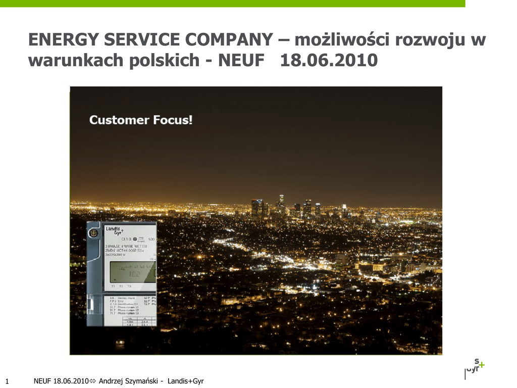 ENERGY SERVICE COMPANY – możliwości rozwoju w warunkach polskich - NEUF 18.06.2010 1 NEUF 18.06.2010 Andrzej Szymański - Landis+Gyr Przedsiębiorstwo Usług Energetycznych (ESCO) + ESCO - firma oferująca usługi i podejmująca działania w celu zmniejszenia kosztów energii klienta, z finansowaniem przedsięwzięć pro oszczędnościowych i ponoszeniem ryzyka zwrotu z inwestycji poprzez rozliczanie wydatków inwestycyjnych z przyszłych oszczędności w rachunkach klienta. + ESCO może oferować jedną z poniższych usług: finansowanie, projektowanie i instalacja, zarządzanie projektami, usługi edukacyjne, leasing sprzętu, konserwację i weryfikację i kontrolę. Zakres usług wynika z wstępnych umów restrukturyzacji profilu energetycznego klienta i ma pomóc dużym organizacjom użyteczności publicznej w zmniejszeniu zużycia energii. + ESCO jako dostawca usług efektywności energetycznej, są ważne dla zrównoważonego rozwoju, ponieważ umożliwiają przedsiębiorstwom, które zwykle nie mają środków na finansowanie inwestycji, stać się bardziej efektywne, bardziej opłacalne i przyjazne dla środowiska naturalnego. Możliwy jest prawdziwy profil win-win-win, jeśli inwestycja jest prawidłowo zrealizowana. 2 NEUF 18.06.2010 Andrzej Szymański - Landis+Gyr Obszary działalności ESCO w Polsce - budownictwo + Termomodernizacja – Ustawa o wspieraniu termomodernizacji i remontów(Dz.U. 223, z 18.12.2008) – Audyty Energetyczne , Termomodernizacyje budynków – Modernizacje systemów grzewczych, wodno-kanalizacyjnych + Modernizacje systemów wentylacyjnych + Świadectwa Energetyczne budynków – EPBD (Energy Performance of Buildings Directive) Dyrektywa 2002/91/EC Parlamentu Europejskiego i Rady Unii Europejskiej, z 16 grudnia 2002 r – Budynki pasywne + Edukacja i szkolenia 3 NEUF 18.06.2010 Andrzej Szymański - Landis+Gyr Dom pasywny – 15kWh/m2/rok 4 NEUF 18.06.2010 Andrzej Szymański - Landis+Gyr Nowe możliwości ESCO w Polsce – energetyka + Zasada TPA – Third Part Access – Zmiana struktury zasilania – wspólna umowa na dostawę energii – Zmiana dostawcy energii + Systemy Load Management – Zarządzanie Obciążeniem – Modelowanie procesów technologicznych – Systemy zdalnego monitorowania odbiorników energetycznych + Smart Grid Smart Metering – – – – 5 Dwukierunkowy przepływ informacji Terminale domowe Nowoczesne instalacje pomiarowe Mikrogeneracja – „Czerwone i Zielone certyfikaty” NEUF 18.06.2010 Andrzej Szymański - Landis+Gyr Nowe wsparcie dla ESCO – „Białe Certyfikaty) + Ustawa o efektywności energetycznej spodziewana jest na początek 2011 roku + Premiowane będą projekty skutkujące zmniejszeniem zużycia energii przez co najmniej 5 lat + Powstanie katalog działań i przedsięwzięć za które będzie można otrzymać Białe certyfikaty + Szacuje się, że środki przeznaczone na najlepsze projekty będą warte ok. 1 miliarda złotych rocznie z czego 80% ma trafić do finalnych odbiorców energii + 20% ogólnej premii ma posłużyć sfinansowaniu projektów w zakresie efektywnego wytworzenia i przesyłu energii 6 NEUF 18.06.2010 Andrzej Szymański - Landis+Gyr Multi Energy - Multi Utilities Zarządzanie wieloma rodzajami energii Bezprzewodowy interfejs + dane profilowe + wartości rozliczeniowe + wartość emisji CO2 + informacje i uwagi Komunikacja: M-BUS lub M-BUS bezprzewodowy Libra 425 7 UW50 NEUF 18.06.2010 Andrzej Szymański - Landis+Gyr Świadomość klienta + Dyskretnie + Na czas + Prosto i wygodnie + Tylko istotne informacje UH50 Korzyści dla klientów końcowych: Oszczędności Energii Domowy wyświetlacz zmienia zachowania klientów i pozwala zredukować 8-9% zużycie energii. Badania wpływu wyświetlaczy domowych na redukcję zużycia (%, wynik w instalacji) Average = 9% Direct Load Control % Electricity Reduction Page 8 18.06.2010 © HumaticaAndrzej AG Confidential NEUF Szymański - Landis+Gyr Podsumowanie + Formuła ESCO jest usankcjonowana jako element poprawy efektywności energetycznej w prawodawstwie UE + Istnieje dostateczna ilość aktów prawnych pozwalających na rozwój ESCO w Polsce, + Jest wiele pozytywnych doświadczeń z wdrożonych projektów w EU + Są lokalnie działające firmy ESCO w Polsce + Jest szereg inicjatyw promocyjnych i edukacyjnych projekty efektywnościowe + Tak jak „zielone czy czerwone” certyfikaty pomogły mikrogeneracji tak „białe” certyfikaty będą wspierały działania formuły ESCO + Istnieją bariery konkurencyjne dla firm typu ESCO głównie związane z wciąż niskim poziomem wiedzy o możliwości realizacji przedsięwzięć w tej formule 9 NEUF 18.06.2010 Andrzej Szymański - Landis+Gyr Gridstream Inteligentne sieci jutra 10 NEUF 18.06.2010 Andrzej Szymański - Landis+Gyr