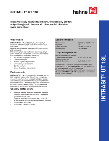 INTRASIT® UT 18L Niezawierający rozpuszczalników, uniwersalny środek antyadhezyjny do betonu, do chłonnych i niechłonnych szalunków Właściwości Dane techniczne INTRASIT® UT 18L jest płynnym, uniwersalnym środkiem antyadhezyjnym o działaniu chemicznym i fizycznym. Nie wpływa ujemnie na przyczepność nakładanych później powłok. Dzięki niskiej lepkości skutecznie zapobiega przyleganiu betonu do powierzchni szalunków, nawet przy użyciu niewielkich ilości tego preparatu. • Nie zawiera rozpuszczalników • Gotowy do użycia • Nadaje się do natryskiwania • Uniwersalny w stosowaniu • Bardzo wydajny • Ulega degradacji biologicznej Opakowanie Pojemnik Forma dostawy Składowanie INTRASIT® UT 18L do stosowania na prawie wszystkich rodzajach szalunków. Do ochrony i pielęgnacji maszyn budowlanych, w szczególności jako środek antyadhezyjny dla pojazdów służących do przewozu i transportu asfaltu . Powoduje wyraźne zmniejszenie przyczepności gorącego asfaltu i umożliwia lepsze czyszczenie powierzchni składowania i transportu. Obszary zastosowań: • • • • • Szalunki stalowe, szalunki drewniane (również powlekane tworzywem sztucznym) i szalunki z tworzywa sztucznego Szalunki ogrzewane do temperatury +180 °C Wykonywanie betonu na miejscu i betonu licowego Prefabrykaty betonowe Pojazdy do transportu asfaltu Zużycie / wydajność Niechłonne szalunki stalowe i z tworzywa sztucznego 0,015 do 0,02 l/m2 Chłonne szalunki / szalunki drewniane 0,03 do 0,05 l/m2 W przypadku szalunków stalowych lub z tworzywa sztucznego 1 litr płynu INTRASIT® UT 18L wystarcza na posmarowanie ok. 50 m2 szalunku. W przypadku szalunków chłonnych lub drewnianych 1 litr płynu INTRASIT® UT 18L wystarcza na posmarowanie ok. 25 m2 szalunku. INTRASIT® UT 18L Zastosowanie kanister polietylenowy 20 l 24 poj. na palecie 18 miesięcy INTRASIT® UT 18L Przygotowanie podłoża Powierzchnia szalunków musi być czysta i sucha. Wykonanie Wytycznymi są Normy: DIN 1056 dot. betonu i żelbetu oraz DIN 18999 dot. dodatków do betonów i zapraw. 1. INTRASIT® UT 18L nakłada się cienką, równomierną warstwą na powierzchnie szalunków lub powierzchnie składowania przy pomocy ławkowca, szmaty lub sprzętu do natryskiwania. Unikać tworzenia się kałuż. 2. Natychmiast po zakończeniu pracy czyścić sprzęt i narzędzia. W przypadku stosowania urządzenia do natryskiwania stosować sprzęt odporny na działanie oleju. Ważne wskazówki • • Płyn antyadhezyjny nie nadaje się do rozcieńczania. Przestrzegać podanych ilości do stosowania. Składniki Oleje mineralne, dodatki Bezpieczeństwo pracy / zalecenia Dokładniejsze informacje dotyczące bezpieczeństwa podczas transportu, składowania i obchodzenia się z produktami znajdują się w aktualnej karcie charakterystyki preparatu niebezpiecznego. Usuwanie odpadów Dla wszystkich systemów obowiązują aktualne przepisy krajowe. Producent Heinrich Hahne GmbH & Co KG Heinrich-Hahne-Weg 11 D-45711 Datteln Dystrybutor VISBUD Projekt Sp. z o.o. ul. M. Bacciarellego 8E /I 51-649 Wrocław Tel. (+48) 71 344 04 34 Fax (+48) 71 345 17 72 e-mail: [email protected] Opisane wyżej właściwości materiału oparte są na wieloletnim doświadczeniu i badaniach laboratoryjnych. Właściwości materiału nie odnoszą się do wszystkich podłoży i przypadków zastosowania. W przypadkach powierzchni wątpliwych należy wykonać próby. Zmiany techniczne w ramach doskonalenia produktu zastrzeżone. W pozostałym zakresie obowiązują nasze ogólne warunki handlowe. Stan: 5.2016