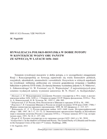 Studia Slavica et Balcanica Petropolitana ББК 63.3(2) Польша; УДК 94(438).04 M. Nagielski RYWALIZACJA POLSKO-ROSYJSKA W DOBIE POTOPU W KONTEKŚCIE WOJNY OBU PAŃSTW ZE SZWECJĄ W LATACH 1656–1661 Tematem rywalizacji mocarstw w dobie potopu, a w szczególności zmaganiami Rosji i Rzeczypospolitej ze Szwecją zajmowało się wielu historyków polskich, rosyjskich, ukraińskich, niemieckich i szwedzkich. Oczywiście w różnych aspektach tej rywalizacji: militarnej, politycznej czy wreszcie gospodarczej związanej z handlem bałtyckim w połowie XVII wieku. Ze starszej literatury wymieńmy jedynie A. N. Malcewa1, L. Zaborowskiego 2 G. W. Forstena 3 czy O. Wajnsztejna 4. Z najważniejszych prac ostatnio wydanych należy wymienić autorstwa: B. N. Florii 5, A. Kotljarchuka 6, Мальцев А. Н. Международное положение Русского государства в 50-х годах и русскошведская война 1656–1658 гг. // Очерки истории СССР. Период феодализма, XVII в. / Pед. А. А. Новосельский, Н. В. Устюгов. М., 1955. С. 496–505. 2 Заборовский Л. В. Россия, Речь Посполитая и Швеция в середине XVII в. М., 1981. 3 Форстен Г. В. Сношения Швеции и России во второй половине XVII века (1648–1700) // Журнал министерства народного просвещения. 1898. № 165 (февраль). С. 315–317. 4 Вайнштейн О. Л. 1) Русско-шведская война 1655–1660 годов: Историографический обзор // ВИ. 1947. № 3. С. 53–72; 2) Экономические предпосылки борьбы за Балтийское море и внешняя политика России в середине XVII в. // Ученые записки ЛГУ. Сер. исторических наук. 1951. Nr 18. С. 157–184. 5 Флоря Б. Н. Русское государство и его западные соседи (1655–1661 гг.). М., 2010. 6 Kotljarchuk A. In the shadows of Poland and Russia. The Grand Duchy of Lithuania and Sweden in the European Crisis of the mid-17th Century. Huddinge, 2006. 1 © M. Nagielski, 2014 98 Петербургские славянские и балканские исследования M. Nagielski. Rywalizacja polsko-rosyjska w dobie potopu... Иванов Д. И. Речь Посполитая в планах московских политиков накануне виленских переговоров 1656 года (из истории международного кризиса в Восточной Европе середины XVII века) // Славяноведение. 2003. № 3. С. 52–68. 8 Кобзарева Е. И. Дипломатическая борьба России за выход к Балтийскому морю в 1655– 1661 гг. М., 1998. 9 Малов А. В. Русско-польская война 1654–1667 гг. М., 2006. 10 Fagerlund R. Kriget i Osterjoprovinserna 1655–1661. Operationer och krigsanstrangningar pa en brikrigskadeplats under Carl X Gustafs krig. Abo, 1979. 11 Stade A. Geneza decyzji Karola X Gustawa o wojnie z Polską w 1655 r. // Studia i Materiały do Historii Wojskowości. 1973. T. XIX. Vol. 1. S. 19–91. 12 Frost R. After the Deluge: Poland-Lithuania and the Second Northern War 1655–1660. Cambridge, 1993. 13 Wójcik Z. Polska a Rosja wobec wspólnego niebezpieczeństwa szwedzkiego w okresie wojny północnej 1655–1660 // Polska w okresie drugiej wojny północnej / Red. K. Lepszy. T. I. Warszawa, 1957. S. 373–377. 14 Kersten A. Hieronim Radziejowski. Studium władzy i opozycji. Warszawa, 1988. 15 Котлярчук А. Дипломатические отношения Швеции и Украины в 1654–1660 гг.: Шведская историография и источники // Украина и соседние государства в XVІІ веке: Материалы международной конференции. СПб., 2004. С. 90–107; Федорук Я. О. Міжнародна дипломатія і політика України 1654–1657 рр. Львів, 1996. 16 Bobiatyński K. Dyneburg i Inflanty polskie podczas wojny Rzeczypospolitej z Moskwą w latach 1654–1655 // Zapiski Historyczne. Toruń, 2005. T. 70. Z. 2–3. S. 107–123. 17 Kossarzecki K. Szlachta litewska wobec panowania szwedzkiego i moskiewskiego w okresie załamania Rzeczypospolitej przełomu 1655 i 1656 roku // Z dziejów stosunków Rzeczypospolitej Obojga Narodów ze Szwecją w XVII wieku / Red. M. Nagielski. Warszawa, 2007. S. 277–301. 18 Wimmer J. 1) Przegląd operacji w wojnie polsko-szwedzkiej 1655–1660 // Wojna polskoszwedzka 1655–1660. Warszawa, 1973. S. 127–206; 2) Polska-Szwecja. Konflikty zbrojne w XVI–XVIII wieku. Oświęcim, 2013. S. 93–222. 19 Федорук Я. Віленський договір 1656 року. Східноєвропейська криза і Україна у середині XVII століття. Київ, 2011. 7 2014. № 1. Январь—Июнь 99 Commentarii / Статьи D. I. Iwanowa7, E. I. Kobzarewej8, A. W. Małowa9, R. Fagerlunda10, A. Stadego11, czy R. Frosta12. Lista autorów zajmujących się rywalizacją mocarstw środkowej Europy o dominację nad Bałtykiem w dobie drugiej wojny północnej jest bardzo obszerna i sięga kilkuset autorów, biorąc pod uwagę badania cząstkowe. Gorzej jest z historiografią polską i do dzisiaj nadal zachowują swoją wartość prace Z. Wójcika wydane w latach 50. XX w., zwłaszcza jego artykuł opublikowany w zbiorze poświęconym II wojnie północnej pt: «Polska a Rosja wobec wspólnego niebezpieczeństwa szwedzkiego w okresie wojny północnej 1655–1660» 13. Wiele wnosi do rokowań szwedzko-koza