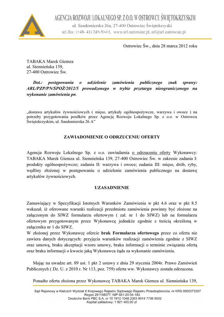 Ostrowiec Św., dnia 28 marca 2012 roku TABAKA Marek Giemza ul. Siennieńska 139, 27-400 Ostrowiec Św. Dot.: postępowania o udzielenie zamówienia publicznego znak sprawy: ARL/PZP/PN/SPOŻ/2012/5 prowadzonego w trybie przetargu nieograniczonego na wykonanie zamówienia pn. „dostawa artykułów żywnościowych ( mięso, artykuły ogólnospożywcze, warzywa i owoce ) na potrzeby przygotowania posiłków przez Agencję Rozwoju Lokalnego Sp. z o.o. w Ostrowcu Świętokrzyskim, ul. Sandomierska 26 A” ZAWIADOMIENIE O ODRZUCENIU OFERTY Agencja Rozwoju Lokalnego Sp. z o.o. zawiadamia o odrzuceniu oferty Wykonawcy: TABAKA Marek Giemza ul. Siennieńska 139, 27-400 Ostrowiec Św. w zakresie zadania I: produkty ogólnospożywcze; zadania II: warzywa i owoce; zadania III: mięso, drób, ryby, wędliny złożonej w postępowaniu o udzielenie zamówienia publicznego na dostawę artykułów żywnościowych. UZASADNIENIE Zamawiający w Specyfikacji Istotnych Warunków Zamówienia w pkt 4.6 oraz w pkt 8.5 wskazał, iż oferowane warunki realizacji przedmiotu zamówienia powinny być złożone na załączonym do SIWZ formularzu ofertowym ( zał. nr 1 do SIWZ) lub na formularzu ofertowym przygotowanym przez Wykonawcę jednakże zgodnie z treścią określoną w załączniku nr 1 do SIWZ. W złożonej przez Wykonawcę ofercie brak Formularza ofertowego przez co oferta nie zawiera danych dotyczących: przyjęcia warunków realizacji zamówienia zgodnie z SIWZ oraz umową, braku akceptacji wzoru umowy, braku informacji o terminie związania ofertą oraz braku informacji o kwocie jaką Wykonawca żąda za wykonanie zamówienia. Mając na uwadze art. 89 ust. 1 pkt 2 ustawy z dnia 29 stycznia 2004r. Prawo Zamówień Publicznych ( Dz. U. z 2010 r. Nr 113, poz. 759) oferta ww. Wykonawcy została odrzucona. Ponadto oferta złożona przez Wykonawcę TABAKA Marek Giemza ul. Siennieńska 139, 27-400 Ostrowiec Św. nie zawiera oświadczenia o spełnianiu warunków udziału w postępowaniu ( wg wzoru jak zał. nr 3 do SIWZ) oraz oświadczenia o braku podstaw do wykluczenia z udziału w postępowaniu ( wg wzoru jak zał. nr 4 do SIWZ) a także podpisanego projektu umowy ( wg wzoru jak zał. nr 2 do SIWZ). Zamawiający nie skorzystał z zapisów art. 26 ust. 3 ustawy PZP tj. nie wzywał o uzupełnienie ww. dokumentów z uwagi na fakt, iż mimo uzupełnienia ww. dokumentów oferta Wykonawcy podlega odrzuceniu ( brak formularza ofertowego ). Magdalena Salwerowicz – Prezes Zarządu ........................................................ Zamawiający Do wiadomości: 1. KIDEM Sp. j. Ireneusz Kowalski, Dorota Kowalska 27-400 Ostrowiec ŚW., Jędrzejów 78 2. PW MAT Marzena Tkaczuk Ul. Zgodna 4 b 27-200 Starachowice 3. a/a