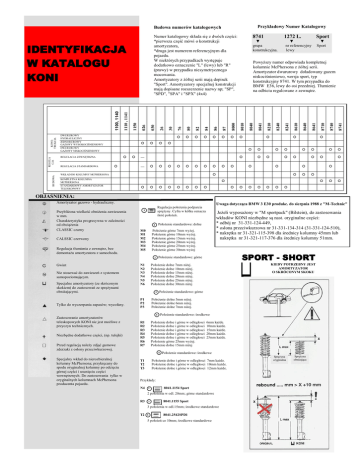 Przykładowy Numer Katalogowy Budowa numerów katalogowych BUDOWA REGULA CJA KONSTRUKCJA DWURUROWY HYDRAULICZNY JEDNORUROWY GAZOWY WYSOKOCIŚNIENIOWY DWURUROWY GAZOWY NISKOCIŚNIENIOWY 8741 ▼ grupa konstrukcyjna. — ▼ Sport 8741 8740 8710 8641 8640 8610 8241 8240 8210 WKŁAD DO KOLUMNY MCPHERSONA KOMPLETNA KOLUMNA MCPHERSONA STANDARDOWY AMORTYZATOR TELESKOPOWY 8041 8040 — Sport ▼ nr referencyjny lewy 1272 L. Powyższy numer odpowiada kompletnej kolumnie McPhersona z żółtej serii. Amortyzator dwururowy doładowany gazem niskociśnieniowo, wersja sport, typ konstrukcyjny 8741. W tym przypadku do BMW E36, lewy do osi przedniej. Tłumienie na odbiciu regulowane z zewnątrz. 8010 8000 87 86 84 82 80 76 26 030 REGULACJA ZEWNĘTRZNA REGULACJA STANDARDOWA 026 1150 1110 , 1141 1100, 1140 IDENTYFIKACJA W KATALOGU KONI 30 Numer katalogowy składa się z dwóch części: *pierwsza część mówi o konstrukcji amortyzatora, *druga jest numerem referencyjnym dla pojazdu. W niektórych przypadkach występuje dodatkowo oznaczenie "L" (lewy) lub "R" (prawy) w przypadku niesymetrycznego mocowania. Amortyzatory z żółtej serii mają dopisek "Sport". Amortyzatory specjalnej konstrukcji mają dopisane rozszerzenie nazwy np; "SP", "SPD", "SPA" i "SPX" (4x4) OBJAŚNIENIA: Amortyzator gazowo - hydrauliczny. Przybliżona wielkość obniżenia zawieszenia w mm. Charakterystyka progresywna w zależności od obciążenia CLASSIC czarny CALSSIC czerwony Regulacja tłumienia z zewnątrz, bez demontażu amortyzatora z samochodu. Nie stosować do zawieszeń z systemem samopoziomującym. Specjalne amortyzatory (ze skróconym skokiem) do zastosowań ze sprężynami obniżającymi. Tylko do wyczerpania zapasów; wycofany. Zastosowanie amortyzatorów teleskopowych KONI nie jest możliwe z przyczyn technicznych. Niezbędne dodatkowe części, (np. tulejki) Przed regulacją należy zdjąć gumowe zderzaki z osłony przeciwkurzowej. Położenie standardowe: dolne 2 N1 N2 N3 N4 N5 N6 Położenie dolne 7mm niżej. Położenie dolne 10mm niżej. Położenie dolne 15mm niżej. Położenie dolne 20mm niżej. Położenie dolne 25mm niżej. Położenie dolne 30mm niżej P1 P2 P3 Położenie dolne 5mm niżej. Położenie dolne 6mm niżej. Położenie dolne 7mm niżej. 3 KIEDY POTRZEBNY JEST AMORTYZATOR O SKRÓCONYM SKOKU Położenie standardowe: górne Położenie standardowe: środkowe 3 Położenie dolne i górne w odległosci Położenie dolne i górne w odległosci Położenie dolne i górne w odległosci Położenie dolne i górne w odległosci Położenie dolne i górne w odległosci Położenie górne 25mm wyżej. Położenie dolne 15mm niżej R1 R2 R3 R4 R5 R6 R7 SPORT - SHORT Położenie standardowe: górne 5 Specjalny wkład do nierozbieralnej kolumny McPhersona; przykręcany do spodu oryginalnej kolumny po odcięciu górnej części i usunięciu części wewnętrznych. Do zastosowania tylko w oryginalnych kolumnach McPhersona producenta pojazdu. Jeżeli wyposażony w "M sportpack" (Bilstein), do zastosowania wkładów KONI niezbędne są nast. oryginalne części: * odbój nr 31-331-124-449, * osłona przeciwkurzowa nr 31-331-134-314 (31-331-124-510), * nakrętka nr 31-321-115-398 dla średnicy kolumny 45mm lub nakrętka nr 31-321-117-376 dla średnicy kolumny 51mm. Położenie górne 7mm wyżej. Położenie górne 10mm wyżej. Położenie górne 15mm wyżej. Położenie górne 20mm wyżej. Położenie górne 25mm wyżej. Położenie górne 30mm wyżej M0 M1 M2 M3 M4 M5 2 Gwint Uwaga dotycząca BMW 3 E30 produkc. do sierpnia 1988 z "M-Technic" Regulacja położenia podparcia sprężyny. Cyfra w kółku oznacza ilość położeń. 3 6mm każde. 10mm każde. 15mm każde. 20mm każde. 25mm każde. Położenie standardowe: środkowe Położenie dolne i górne w odległosci 7mm każde. Położenie dolne i górne w odległosci 10mm każde. Położenie dolne i górne w odległosci 12mm każde. T1 T2 T3 Przykłady: N4 2 8041.1154 Sport 2 położenia w odl. 20mm; górne standardowe R3 3 8041.1155 Sport 3 położenia w odl.15mm; środkowe standardowe T2 5 8041.2542SPD1 5 położeń co 10mm; środkowe standardowe Sprężyna oryginalna Sprężyna obniżająca