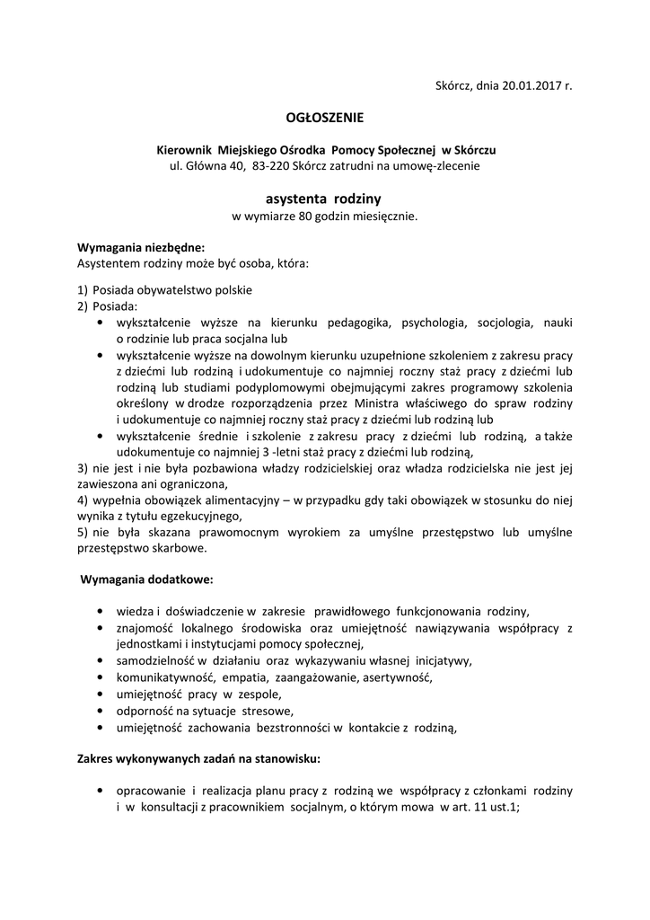 Skórcz, dnia 20.01.2017 r. OGŁOSZENIE Kierownik Miejskiego Ośrodka Pomocy Społecznej w Skórczu ul. Główna 40, 83-220 Skórcz zatrudni na umowę-zlecenie asystenta rodziny w wymiarze 80 godzin miesięcznie. Wymagania niezbędne: Asystentem rodziny może być osoba, która: 1) Posiada obywatelstwo polskie 2) Posiada: • wykształcenie wyższe na kierunku pedagogika, psychologia, socjologia, nauki o rodzinie lub praca socjalna lub • wykształcenie wyższe na dowolnym kierunku uzupełnione szkoleniem z zakresu pracy z dziećmi lub rodziną i udokumentuje co najmniej roczny staż pracy z dziećmi lub rodziną lub studiami podyplomowymi obejmującymi zakres programowy szkolenia określony w drodze rozporządzenia przez Ministra właściwego do spraw rodziny i udokumentuje co najmniej roczny staż pracy z dziećmi lub rodziną lub • wykształcenie średnie i szkolenie z zakresu pracy z dziećmi lub rodziną, a także udokumentuje co najmniej 3 -letni staż pracy z dziećmi lub rodziną, 3) nie jest i nie była pozbawiona władzy rodzicielskiej oraz władza rodzicielska nie jest jej zawieszona ani ograniczona, 4) wypełnia obowiązek alimentacyjny – w przypadku gdy taki obowiązek w stosunku do niej wynika z tytułu egzekucyjnego, 5) nie była skazana prawomocnym wyrokiem za umyślne przestępstwo lub umyślne przestępstwo skarbowe. Wymagania dodatkowe: • • • • • • • wiedza i doświadczenie w zakresie prawidłowego funkcjonowania rodziny, znajomość lokalnego środowiska oraz umiejętność nawiązywania współpracy z jednostkami i instytucjami pomocy społecznej, samodzielność w działaniu oraz wykazywaniu własnej inicjatywy, komunikatywność, empatia, zaangażowanie, asertywność, umiejętność pracy w zespole, odporność na sytuacje stresowe, umiejętność zachowania bezstronności w kontakcie z rodziną, Zakres wykonywanych zadań na stanowisku: • opracowanie i realizacja planu pracy z rodziną we współpracy z członkami rodziny i w konsultacji z pracownikiem socjalnym, o którym mowa w art. 11 ust.1; • • • • • • • • • • • • • • • • • • • • opracowanie, we współpracy z członkami rodziny i koordynatorem rodzinnej pieczy zastępczej, planu pracy z rodziną, który jest skoordynowany z planem pomocy dziecku umieszczonemu w pieczy zastępczej ; udzielanie pomocy rodzinom w poprawie ich sytuacji życiowe, w tym w zdobywaniu umiejętności prawidłowego prowadzenia gospodarstwa domowego; udzielanie pomoc rodzinom w rozwiązywaniu problemów socjalnych; udzielanie pomocy rodzinom w rozwiązywaniu problemów psychologicznych; udzielanie pomocy rodzinom w rozwiązywaniu problemów wychowawczych z dziećmi; wspieranie aktywności społecznej rodzin; motywowanie członków rodzin do podnoszenia kwalifikacji zawodowych; udzielanie pomocy w poszukiwaniu, podejmowaniu i utrzymywaniu pracy zarobkowej; motywowanie do udziału w zajęciach grupowych dla rodziców, mających na celu kształtowanie prawidłowych wzorców rodzicielskich i umiejętności psychospołecznych; udzielanie wsparcia dzieciom, w szczególności poprzez udział w zajęciach psychoedukacyjnych; podejmowanie działań interwencyjnych i zaradczych w sytuacji zagrożenia bezpieczeństwa dzieci i rodzin; prowadzenie indywidualnych konsultacji wychowawczych dla rodziców i dzieci; realizacja zadań określonych w ustawie z dnia 4 listopada 2016 r. o wsparciu kobiet w ciąży i rodzin „Za życiem” (Dz. U. poz. 1860); prowadzenie dokumentacji dotyczącej pracy z rodziną; dokonywanie okresowej oceny sytuacji rodziny, nie rzadziej niż co pół roku i przekazywanie tej oceny podmiotowi, o którym mowa w art. 17 ust. 1; monitorowanie funkcjonowania rodziny po zakończeniu pracy z rodziną; sporządzanie, na wniosek sądu, opinii o rodzinie i jej członkach; współpraca z jednostkami administracji rządowej i samorządowej, właściwymi organizacjami pozarządowymi oraz innymi podmiotami i osobami specjalizującymi się w działaniach na rzecz dziecka i rodziny; współpraca z zespołem interdyscyplinarnym lub grupą roboczą, o których mowa w art.. 9a ustawy z dnia 29 lipca 2005r. o przeciwdziałaniu przemocy w rodzinie (Dz.U. Nr 180,poz.1493, z pózn. zm.), lub innymi podmiotami, których pomoc przy wykonywaniu zadań uzna za niezbędną; współpraca z instytucjami takimi jak szkoła, przedszkole, sąd, urząd pracy, urząd gminy itp. Wymagane dokumenty: • • • list motywacyjny, curriculum vitae, kserokopia dokumentów potwierdzających wykształcenie i uprawnienia zawodowe, • • • • • • kserokopie świadectw pracy dokumentujących wymagany staż pracy lub zaświadczenie o zatrudnieniu, zawierające okres zatrudnienia, w przypadku pozostawania stosunku pracy, oświadczenie o nie skazaniu prawomocnym wyrokiem za umyślne przestępstwo lub umyślne przestępstwo skarbowe, oświadczenie kandydata o pełnej zdolności do czynności prawnych i korzystaniu z pełni praw publicznych, oświadczenie , że kandydat nie jest i nie był pozbawiony władzy rodzicielskiej oraz władza rodzicielska nie została mu zawieszona ani ograniczona, oświadczenie, że kandydat wypełnia obowiązek alimentacyjny, w przypadku gdy taki obowiązek został nałożony na podstawie tytułu wykonawczego pochodzącego lub zatwierdzającego przez sąd, oświadczenie dotyczące zgody na przetwarzanie danych osobowych o treści: „Wyrażam zgodę na przetwarzanie danych osobowych dla potrzeb procesu rekrutacji na asystenta rodziny ogłoszonego przez Miejski Ośrodek Pomocy Społecznej w Skórczu zgodnie z ustawą z dnia 29 sierpnia 1997 r. o ochronie danych osobowych (tj. Dz. U. z 2016, poz. 922 ). Warunki zatrudnienia: Umowa zlecenie Termin i miejsce składania dokumentów: Wymagane dokumenty aplikacyjne należy składać w Miejskim Ośrodku Pomocy Społecznej w Skórczu ul. Główna 40, 83-220 Skórcz pokój nr 1/2 z dopiskiem „Asystent rodziny”, w terminie do dnia 