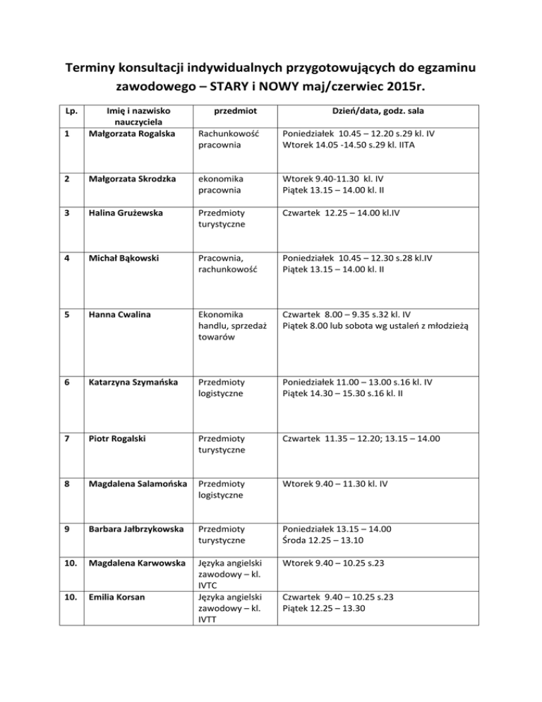 Terminy konsultacji indywidualnych przygotowujących do egzaminu zawodowego – STARY i NOWY maj/czerwiec 2015r. Lp. 1 Imię i nazwisko nauczyciela Małgorzata Rogalska 2 przedmiot Dzień/data, godz. sala Rachunkowość pracownia Poniedziałek 10.45 – 12.20 s.29 kl. IV Wtorek 14.05 -14.50 s.29 kl. IITA Małgorzata Skrodzka ekonomika pracownia Wtorek 9.40-11.30 kl. IV Piątek 13.15 – 14.00 kl. II 3 Halina Grużewska Przedmioty turystyczne Czwartek 12.25 – 14.00 kl.IV 4 Michał Bąkowski Pracownia, rachunkowość Poniedziałek 10.45 – 12.30 s.28 kl.IV Piątek 13.15 – 14.00 kl. II 5 Hanna Cwalina Ekonomika handlu, sprzedaż towarów Czwartek 8.00 – 9.35 s.32 kl. IV Piątek 8.00 lub sobota wg ustaleń z młodzieżą 6 Katarzyna Szymańska Przedmioty logistyczne Poniedziałek 11.00 – 13.00 s.16 kl. IV Piątek 14.30 – 15.30 s.16 kl. II 7 Piotr Rogalski Przedmioty turystyczne Czwartek 11.35 – 12.20; 13.15 – 14.00 8 Magdalena Salamońska Przedmioty logistyczne Wtorek 9.40 – 11.30 kl. IV 9 Barbara Jałbrzykowska Przedmioty turystyczne Poniedziałek 13.15 – 14.00 Środa 12.25 – 13.10 10. Magdalena Karwowska Wtorek 9.40 – 10.25 s.23 10. Emilia Korsan Języka angielski zawodowy – kl. IVTC Języka angielski zawodowy – kl. IVTT Czwartek 9.40 – 10.25 s.23 Piątek 12.25 – 13.30