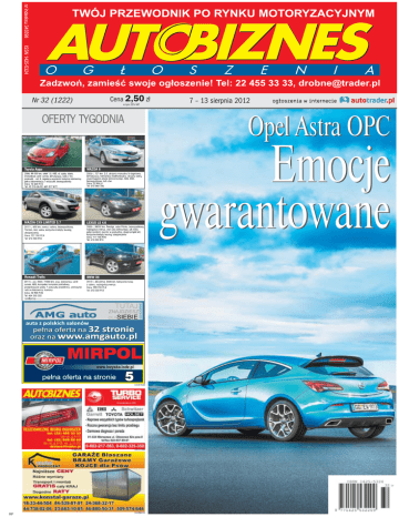 Nr 32 (1222) Cena 2,50 zł w tym 23% VAT 7 – 13 sierpnia 2012 Opel Astra OPC OFERTY TYGODNIA Emocje gwarantowane 10167638 31985028 RP 10211398 10168410 Nie należę do ludzi, którzy na co dzień jeżdżą jakoś specjalnie szybko. Nie chodzi wcale o strach przed mandatami. Zwyczajnie nie czuję potrzeby udowadniać ani sobie, ani innym, że potrafię do następnych świateł dojechać jako pierwszy. Nie znaczy to jednak, że gardzę sportowymi autami. Wręcz przeciwnie! Dlatego na wieść, iż będę miał okazję wypróbować nową Astrę OPC, cieszyłem się jak dziecko na wizytę Świętego Mikołaja. TESTT TE 7 – 13 sierpnia 2012 r. Opel Astra OPC Emocje gwarantowane W segmencie kompaktowych hot hatchów robi się coraz ciekawiej. Mamy przecież m.in. gorącego Golfa GTI i sportowe Megane RS, przypakowaną Giuliettę QV i dziarską Mazdę 3 MPS. Niedawno do towarzystwa dołączył nowy Focus ST, a teraz Astra OPC, i muszę przyznać, że jest to bardzo mocne wejście OPEL str. 4 Wygląd Lądujemy we Frankfurcie, tobołki w dłoń i już chwilę później zjeżdżamy do podziemnego parkingu. Po krótkim spacerze w labiryncie chłodnych korytarzy zza któregoś z kolei załomu wyłania się wreszcie twarz małej bestii. Samochody stoją w idealnym rządku, ustawione z największą niemiecką precyzją. Są spokojne, bo uśpione, ale wszystkie wyglądają, jakby chciały skoczyć do gardeł Bogu ducha winnych gości. Przejeżdżając wzrokiem po autach, myślę sobie: „Nie wiem jeszcze, jak to jeździ, ale wygląda świetnie”. Przedni zderzak z wielkimi wlotami powietrza, duża lotka nad tylną szybą, dwie szeroko rozstawione końcówki wydechu i koła z 19-calowymi obręczami wypełniające nadkola nie pozostawiają wątpliwości, do czego te auta zostały stworzone. Przy całej swojej drapieżności Astra OPC nie jest jednak przesadnie krzykliwa. I dobrze. Ostatnia generacja Focusa RS, z wielkimi chrapami i gigantycznym dyfuzorem, na ulicy wygląda, jakby jej kierowca się zgubił. Chciał poszaleć na torze w Poznaniu, ale przegapił zjazd z autostrady. Astra jest bardziej stonowana, elegancka. Wszystko to jest oczywiście kwestią gustu i żeby nie było niedomówień – uwielbiamy Focusa RS. Na prostej Poza tym, nie oszukujmy się, nie przyjechałem tu po to, by podziwiać auto z zewnątrz. Odbieramy kluczyki i czym prędzej wskakujemy do środka. Wielkiego zaskoczenia nie ma. Wnętrze to dobrze już znana Astra GTC z kilkoma dodatkami, które w każdej mniej lub bardziej usportowionej wersji znaleźć się powinny. Mamy zatem nieco mniejszą i spłaszczoną u dołu kierownicę, mocno wyprofilowane fotele oraz zegary, które po uruchomieniu silnika podświetlają się na czerwono. Wrzucam jedynkę, kolega siedzący na prawym fotelu z wymownym uśmieszkiem zapina pas i ruszamy w drogę. Zanim dojedziemy do celu, czeka nas podróż autostradą. Niemiecką autostradą, co nie jest bez znaczenia w przypadku prezentacji auta o sportowej duszy. Już pierwsze, niewinne muśnięcia pedału gazu zwiastują, że Astra OPC lubi ostrą zabawę. Nie jesteśmy specjalnie zaskoczeni, pod maską pracuje przecież 2-litrowy benzyniak podkręcony do 280 koni mechanicznych. Turbina pomaga wycisnąć z niego okrągłe 400 Nm momentu obrotowego. To aż 200 Nm z jednego litra pojemności. W żadnym aucie oferowanym w Europie nie znajdziemy czterocylindrowego silnika o takim potencjale. Warto też dodać, że maksymalny moment dostępny jest w przedziale od 2500 do 4500 obrotów na minutę. Dynamiczna jazda nie wymaga więc częstego wachlowania biegami. To dobrze, bo choć kolejne przełożenia (a jest ich sześć) wskakują bez większych protestów, sam skok dźwigni mógłby być nieco krótszy. Jak na sportowe auto, Astra OPC jest całkiem nieźle wyciszona i nawet przy prędkościach bliskich 200 km/h można w niej całkiem swobodnie rozmawiać. W zakrętach Celem naszej podróży jest lotnisko wojskowe w Pferdsfeld, dziś służące Oplowi za poligon doświadczalny. Aby dojechać na miejsce, musimy na moment zjechać z autostrady. I świetnie, bo dopiero na wąskich, krętych drogach wijących się w dół i w górę po okolicznych pagórkach po raz pierwszy możemy naprawdę wypróbować zawieszenie i potencjał drzemiący pod maską. Oczywiście do każdego silnika – szczególnie wyposażonego w turbinę – trzeba się na początku trochę przyzwyczaić. Nauczyć się go. Dopiero kiedy kierowca i maszyna nieco się dotrą, kiedy wyczujemy, w którym miejscu auto najmocniej napina mięśnie, zaczyna się prawdziwa zabawa. A ten samochód to zabawka z krwi i kości. Producent chwali się, że w przypadku Astry OPC turbodziura nie istnieje. Fajnie by było. Tak naprawdę auto dostaje kopa dopiero bliżej 2800 obr./min. Jednak kiedy wskazówka obrotomierza mija magiczną wartość, spod maski wydobywa się szalony – przypominający ryk silnika myśliwca – świst turbiny, rozmowy cichną, a wszyscy oprócz kierow cy do cho dzą do wnio sku, że chyba jednak lepiej było jechać autobusem. Do setki auto rozpędza się w sześć sekund. To naprawdę dobry wynik. Słowa pochwały należą się również zawieszeniu. W porównaniu do zwykłej, trzydrzwiowej Astry w OPC zostało ono obniżone o 10 mm. Zastosowano też twardsze o 30 procent sprężyny. Mimo to nawet na wyboistej drodze ani razu nie usłyszeliśmy żadnych niepokojących odgłosów. Jak na auto z 19-calowymi obręczami kół było też całkiem komfortowo, ale to akurat bardzo łatwo zmienić. Zawieszenie FlexRide pozwala wybrać jeden z trzech predefiniowanych trybów pracy. Oprócz normalnego jest jeszcze Sport (utwardza się zawieszenie, a kierownica pracuje z nieco większym oporem) oraz OPC (dodatkowo wyostrza się reakcja silnika na wciśnięcie gazu). Chociaż Astra ma z tyłu belkę skrętną, zastosowane w niej drążki Watta znacznie poprawiają stabilność auta podczas szybkiego pokonywania zakrętów i dynamic