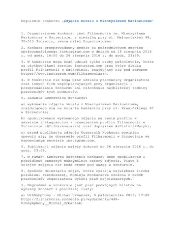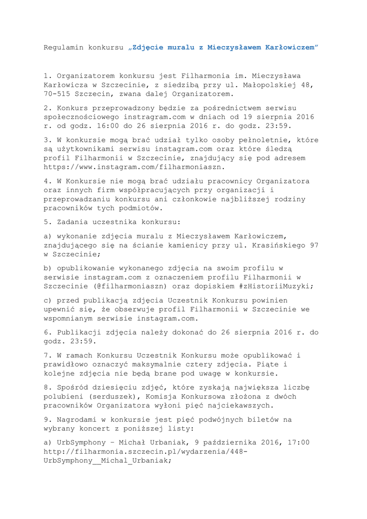 Regulamin konkursu „Zdjęcie muralu z Mieczysławem Karłowiczem” 1. Organizatorem konkursu jest Filharmonia im. Mieczysława Karłowicza w Szczecinie, z siedzibą przy ul. Małopolskiej 48, 70-515 Szczecin, zwana dalej Organizatorem. 2. Konkurs przeprowadzony będzie za pośrednictwem serwisu społecznościowego instragram.com w dniach od 19 sierpnia 2016 r. od godz. 16:00 do 26 sierpnia 2016 r. do godz. 23:59. 3. W konkursie mogą brać udział tylko osoby pełnoletnie, które są użytkownikami serwisu instagram.com oraz które śledzą profil Filharmonii w Szczecinie, znajdujący się pod adresem https://www.instagram.com/filharmoniaszn. 4. W Konkursie nie mogą brać udziału pracownicy Organizatora oraz innych firm współpracujących przy organizacji i przeprowadzaniu konkursu ani członkowie najbliższej rodziny pracowników tych podmiotów. 5. Zadania uczestnika konkursu: a) wykonanie zdjęcia muralu z Mieczysławem Karłowiczem, znajdującego się na ścianie kamienicy przy ul. Krasińskiego 97 w Szczecinie; b) opublikowanie wykonanego zdjęcia na swoim profilu w serwisie instagram.com z oznaczeniem profilu Filharmonii w Szczecinie (@filharmoniaszn) oraz dopiskiem #zHistoriiMuzyki; c) przed publikacją zdjęcia Uczestnik Konkursu powinien upewnić się, że obserwuje profil Filharmonii w Szczecinie we wspomnianym serwisie instagram.com. 6. Publikacji zdjęcia należy dokonać do 26 sierpnia 2016 r. do godz. 23:59. 7. W ramach Konkursu Uczestnik Konkursu może opublikować i prawidłowo oznaczyć maksymalnie cztery zdjęcia. Piąte i kolejne zdjęcia nie będą brane pod uwagę w konkursie. 8. Spośród dziesięciu zdjęć, które zyskają największa liczbę polubieni (serduszek), Komisja Konkursowa złożona z dwóch pracowników Organizatora wyłoni pięć najciekawszych. 9. Nagrodami w konkursie jest pięć podwójnych biletów na wybrany koncert z poniższej listy: a) UrbSymphony – Michał Urbaniak, 9 października 2016, 17:00 http://filharmonia.szczecin.pl/wydarzenia/448UrbSymphony__Michal_Urbaniak; b) LAB 1.1: El-symphony - TRISTANO, 13 października 2016, 19:00 http://filharmonia.szczecin.pl/wydarzenia/461-LAB_1.1_Elsymphony_-_TRISTANO; c) Metamorfoza - Sławek Uniatowski, 25 października 2016, 17:00 http://filharmonia.szczecin.pl/wydarzenia/440-Metamorfoza__Slawek_Uniatowski_; d) Laureaci – XVII Międzynarodowy Konkurs Pianistyczny im. Fryderyka Chopina - 29 listopada 2016, 19:00 http://filharmonia.szczecin.pl/wydarzenia/482Laureaci__XVII_Miedzynarodowy_Konkurs_Pianistyczny_im._Frydery ka_Chopina_ e) Narek Hakhnazaryan gra Czajkowskiego, 16 grudnia 2016, 19:00 http://filharmonia.szczecin.pl/wydarzenia/488Narek_Hakhnazaryan_gra_Czajkowskiego_ Każdy pojedynczy bilet będzie kosztował 1 PLN (słownie: jeden złoty). 10. Nagrody przyznane zostaną pięciu uczestnikom konkursu, których zdjęcia zostaną wyłonione jako najlepsze przez Komisję Konkursu. 11. Zwycięzcy zostaną poinformowani o wygranej przez wiadomość prywatną w serwisie instagram.com w ciągu 7 dni od zakończenia konkursu. 12. Nagroda konkursowa będzie wydana wyłącznie w postaci określonej niniejszym regulaminem, bez możliwości wypłaty jej równowartości w gotówce, zastrzeżenia szczególnych właściwości nagród lub zamiany na inną nagrodę rzeczową. 13. Celem potwierdzenia chęci przyjęcia nagrody, zwycięzcy powinni skontaktować się z Organizatorem konkursu pod wskazanym przez Organizatora w prywatnej wiadomości, w serwisie intagram.com, adresem e-mail pod rygorem utraty prawa do nagrody. 14. Uczestnicy konkursu wyrażają zgodę na przetwarzanie danych osobowych (zgodnie z ustawą z dnia 29 sierpnia 1997 r. o ochronie danych osobowych), zarówno dla celów organizacji i przeprowadzenia Konkursu, wyłonienia i powiadomienia zwycięzców oraz przekazania nagród, w szeroko pojętych celach marketingowych i promocyjnych działalności Organizatora także w celach statystycznych, analitycznych oraz nawiązywania kontaktu z właścicielem danych. 15. Zwycięzca Konkursu wyraża zgodę na rozpowszechnianie swojego wizerunku utrwalonego podczas korzystania z nagród (zdjęcia, film) w związku z informacjami o konkursie. 16. Opublikowanie zdjęcia oznaczonego zgodnie z zasadami konkursu jest równoznaczne z akceptacją powyższych warunków. 17. Filharmonia im. M. Karłowicza w Szczecinie informuje, iż dochód z tytułu wygranej zwolniony jest z podatku dochodowego od osób fizycznych (podstawa: art. 21 ust. 1 pkt 68 ustawy z dnia 26 lipca 1991 r. o podatku dochodowym od osób fizycznych; Dz. U. z 2012 r., poz. 361 ze zm.).