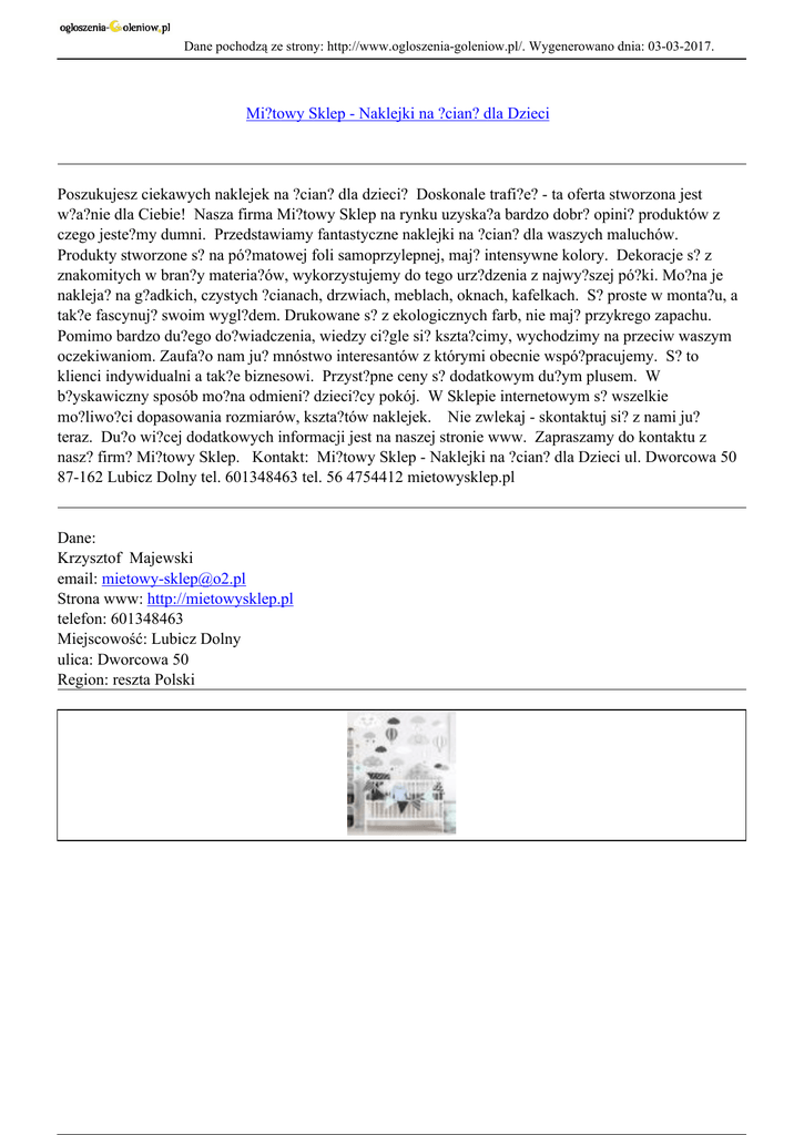 Dane pochodzą ze strony: http://www.ogloszenia-goleniow.pl/. Wygenerowano dnia: 03-03-2017. Mi?towy Sklep - Naklejki na ?cian? dla Dzieci Poszukujesz ciekawych naklejek na ?cian? dla dzieci? Doskonale trafi?e? - ta oferta stworzona jest w?a?nie dla Ciebie! Nasza firma Mi?towy Sklep na rynku uzyska?a bardzo dobr? opini? produktów z czego jeste?my dumni. Przedstawiamy fantastyczne naklejki na ?cian? dla waszych maluchów. Produkty stworzone s? na pó?matowej foli samoprzylepnej, maj? intensywne kolory. Dekoracje s? z znakomitych w bran?y materia?ów, wykorzystujemy do tego urz?dzenia z najwy?szej pó?ki. Mo?na je nakleja? na g?adkich, czystych ?cianach, drzwiach, meblach, oknach, kafelkach. S? proste w monta?u, a tak?e fascynuj? swoim wygl?dem. Drukowane s? z ekologicznych farb, nie maj? przykrego zapachu. Pomimo bardzo du?ego do?wiadczenia, wiedzy ci?gle si? kszta?cimy, wychodzimy na przeciw waszym oczekiwaniom. Zaufa?o nam ju? mnóstwo interesantów z którymi obecnie wspó?pracujemy. S? to klienci indywidualni a tak?e biznesowi. Przyst?pne ceny s? dodatkowym du?ym plusem. W b?yskawiczny sposób mo?na odmieni? dzieci?cy pokój. W Sklepie internetowym s? wszelkie mo?liwo?ci dopasowania rozmiarów, kszta?tów naklejek. Nie zwlekaj - skontaktuj si? z nami ju? teraz. Du?o wi?cej dodatkowych informacji jest na naszej stronie www. Zapraszamy do kontaktu z nasz? firm? Mi?towy Sklep. Kontakt: Mi?towy Sklep - Naklejki na ?cian? dla Dzieci ul. Dworcowa 50 87-162 Lubicz Dolny tel. 601348463 tel. 56 4754412 mietowysklep.pl Dane: Krzysztof Majewski email: [email protected] Strona www: http://mietowysklep.pl telefon: 601348463 Miejscowość: Lubicz Dolny ulica: Dworcowa 50 Region: reszta Polski