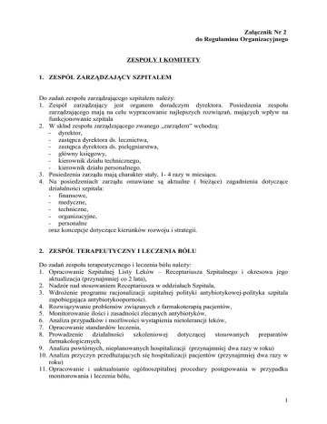 Załącznik Nr 2 do Regulaminu Organizacyjnego ZESPOŁY I KOMITETY 1. ZESPÓŁ ZARZĄDZAJĄCY SZPITALEM Do zadań zespołu zarządzającego szpitalem należy: 1. Zespół zarządzający jest organem doradczym dyrektora. Posiedzenia zespołu zarządzającego mają na celu wypracowanie najlepszych rozwiązań, mających wpływ na funkcjonowanie szpitala 2. W skład zespołu zarządzającego zwanego „zarządem” wchodzą: - dyrektor, - zastępca dyrektora ds. lecznictwa, - zastępca dyrektora ds. pielęgniarstwa, - główny księgowy, - kierownik działu technicznego, - kierownik działu personalnego. 3. Posiedzenia zarządu mają charakter stały, 1- 4 razy w miesiącu. 4. Na posiedzeniach zarządu omawiane są aktualne ( bieżące) zagadnienia dotyczące działalności szpitala: - finansowe, - medyczne, - techniczne, - organizacyjne, - personalne oraz koncepcje dotyczące kierunków rozwoju i strategii. 2. ZESPÓŁ TERAPEUTYCZNY I LECZENIA BÓLU Do zadań zespołu terapeutycznego i leczenia bólu należy: 1. Opracowanie Szpitalnej Listy Leków – Receptariusza Szpitalnego i okresowa jego aktualizacja (przynajmniej co 2 lata), 2. Nadzór nad stosowaniem Receptariusza w oddziałach Szpitala, 3. Wdrożenie programu racjonalizacji szpitalnej polityki antybiotykowej-polityka szpitala zapobiegająca antybiotykooporności. 4. Rozwiązywanie problemów związanych z farmakoterapią pacjentów, 5. Monitorowanie ilości i zasadności zlecanych antybiotyków, 6. Analiza przypadków i możliwości wystąpienia nietolerancji leków, 7. Opracowanie standardów leczenia, 8. Prowadzenie działalności szkoleniowej dotyczącej stosowanych preparatów farmakologicznych, 9. Analiza powtórnych, nieplanowanych hospitalizacji (przynajmniej dwa razy w roku) 10. Analiza przyczyn przedłużających się hospitalizacji pacjentów (przynajmniej dwa razy w roku) 11. Opracowanie i uaktualnianie ogólnoszpitalnej procedury postępowania w przypadku monitorowania i leczenia bólu, 1 12. Wdrażanie wśród personelu Szpitala aktualnych wytycznych Polskiego Towarzystwa Badania Bólu w zakresie monitorowania i leczenia bólu poprzez prowadzenie szkoleń oraz uczestniczenie w szkoleniach zewnętrznych, 13. Nadzorowanie dostępności leków i sprzętu stosowanych w leczeniu bólu, 14. Wdrożenie i monitorowanie standardu profilaktyki choroby zatorowo-zakrzepowej- ocena pacjentów pod kątem ryzyka wystąpienia choroby zatorowo-zakrzepowej, kwalifikacja do grupy ryzyka, profilaktyka zgodnie z wytycznymi. 15. Ustalenie okołozabiegowej profilaktyki antybiotykowej wspólnie z zespołem ds. zakażeń. 16. Procedura wdrożenia i koordynowania prowadzenia Okołozabiegowej Karty Kontrolnej; 17. Zbiorcza analiza wykonywanych znieczuleń (nie rzadziej niż raz w roku); 18. Zbiorcza analiza przebiegu wykonywanych zabiegów i ich skutków w czasie hospitalizacji (nie rzadziej niż raz w roku); 19. Zbiorcza analiza odległych skutków przeprowadzonych zabiegów (dla określonych zabiegów, nie rzadziej niż raz w roku) 20. Analiza reoperacji (raz na pół roku). 21. Wyniki analiz dokumentowane, prezentowane i omawiane na spotkaniach zespołu oraz odprawach kadry medycznej, 22. Spotkania Zespołu terapeutycznego i leczenia bólu odbywają się przynajmniej dwa raz w roku. 3. ZESPÓŁ DS. DOMUNENTACJI MEDYCZNEJ Do zadań zespołu ds. dokumentacji medycznej należy: 1. Opracowanie wzorów jednolitej dokumentacji lekarskiej i pielęgniarskiej do zastosowania w Szpitalu z uwzględnieniem obowiązujących przepisów prawa, 2. Systematyczne monitorowanie prawidłowości prowadzenia wewnętrznej dokumentacji medycznej - lekarskiej i pielęgniarskiej, analiza pod względem zawartości, kompletności oraz autoryzacji. 3. Analiza danych zawartych w dokumentacji medycznej oraz sposobu jej przetwarzania, zabezpieczenia, obiegu, przechowywania oraz udostępniania osobom uprawnionym. 4. Okresowe przeglądy dokumentacji nie rzadziej niż raz na 6-m-cy w zakresie od 0,5-1% całej dokumentacji- wnioski, analiza, przedstawienie wyników zespołowi ds. jakości. 5. Nadzór nad modyfikowaniem, uaktualnianiem zgodnie z przepisami formularzy dokumentacji medycznej - Rejestr formularzy „zgody pacjenta” na procedury (diagnostyczne, zabiegowe) – przyjęty przez kierownictwo, znany personelowi. 6. Szkolenie personelu w zakresie prowadzenia dokumentacji medycznej. 4. ZESPÓŁ DS. OCENY PRZYJĘĆ Do zadań zespołu ds. oceny przyjęć należy: 1. Dokonywanie raz w miesiącu analizy list oczekujących pod względem poprawności prowadzenia dokumentacji, czasu oczekiwania na udzielenie świadczenia oraz zasadności zmian terminów. 2. Sporządzanie raportu w każdym miesiącu z dokonanej oceny liczby oczekujących na poszczególne świadczenia i przedstawianie Dyrektorowi Szpitala, 3. W przypadkach wątpliwych co do poprawności prowadzenia list oczekujących, podejmowanie działań korygujących, które mają na celu wyjaśnienie i wyeliminowanie w przyszłości wszelkich niezgodności. 2 5. ZESPÓŁ DS. ANALIZY REANIMACJI I ZGONÓW Do zadań zespołu ds. analizy reanimacji i zgonów należy: 1. Tworzenie, aktualizacja i nadzór nad wdrażaniem procedur medycznych: Standardowe Procedury Postępowania w stanach nagłego zagrożenia życia - zgodny z zaleceniami Europejskiej Rady Resuscytacji lub AHA (American Heart Association). 2. Szkolenia (udokumentowane) pracowników z zakresu resuscytacji krążeniowooddechowej – szkolenia przynajmniej 1 raz w roku standard BLS dla całego personelu medycznego, pozostały personel szpitala znajomość zasad resuscytacji na podstawowym poziomie. 3. Opracowanie listy leków, sprzętu i materiałów, które muszą być dostępne w stanach nagłego zagrożenia życia(rodzaj i ilość). Aktualizacja listy zgodnie z wytycznymi. 4. Prowadzenie analizy częstości i skuteczności podjętych czynności reanimacyjnych (przynajmniej 1 raz na pół roku z wyłączeniem danych personalnych); 5. Prowadzenie analizy przyczyn zgon