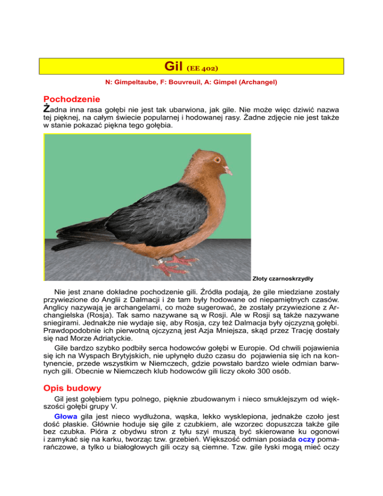 Gil (EE 402) N: Gimpeltaube, F: Bouvreuil, A: Gimpel (Archangel) Pochodzenie śadna inna rasa gołębi nie jest tak ubarwiona, jak gile. Nie moŜe więc dziwić nazwa tej pięknej, na całym świecie popularnej i hodowanej rasy. śadne zdjęcie nie jest takŜe w stanie pokazać piękna tego gołębia. Złoty czarnoskrzydły Nie jest znane dokładne pochodzenie gili. Źródła podają, Ŝe gile miedziane zostały przywiezione do Anglii z Dalmacji i Ŝe tam były hodowane od niepamiętnych czasów. Anglicy nazywają je archangelami, co moŜe sugerować, Ŝe zostały przywiezione z Archangielska (Rosja). Tak samo nazywane są w Rosji. Ale w Rosji są takŜe nazywane sniegirami. JednakŜe nie wydaje się, aby Rosja, czy teŜ Dalmacja były ojczyzną gołębi. Prawdopodobnie ich pierwotną ojczyzną jest Azja Mniejsza, skąd przez Trację dostały się nad Morze Adriatyckie. Gile bardzo szybko podbiły serca hodowców gołębi w Europie. Od chwili pojawienia się ich na Wyspach Brytyjskich, nie upłynęło duŜo czasu do pojawienia się ich na kontynencie, przede wszystkim w Niemczech, gdzie powstało bardzo wiele odmian barwnych gili. Obecnie w Niemczech klub hodowców gili liczy około 300 osób. Opis budowy Gil jest gołębiem typu polnego, pięknie zbudowanym i nieco smuklejszym od większości gołębi grupy V. Głowa gila jest nieco wydłuŜona, wąska, lekko wysklepiona, jednakŜe czoło jest dość płaskie. Głównie hoduje się gile z czubkiem, ale wzorzec dopuszcza takŜe gile bez czubka. Pióra z obydwu stron z tyłu szyi muszą być skierowane ku ogonowi i zamykać się na karku, tworząc tzw. grzebień. Większość odmian posiada oczy pomarańczowe, a tylko u białogłowych gili oczy są ciemne. Tzw. gile łyski mogą mieć oczy Gil ciemne lub pomarańczowe, jednakŜe zawsze takie same z kaŜdej strony. Dziób jest średniej wielkości, od jasnego do rogowego, a to w zaleŜności od ubarwienia. Miedziane gile mają zawsze dziób ciemniejszy. Głowa gili spoczywa na dosyć długiej szyi, która w okolicy piersi jest szeroka. Plecy ich lekko opadają w kierunku ogona, z którym tworzą linię prostą. Nogi gili nie mogą być wysokie i zawsze muszą być gładkie, bez upierzenia skoków. Miedziany czarnoskrzydły Do wad w budowie zaliczamy za słabą budowę korpusu, za szeroki, bardzo krzywy, lub bardzo ubogi w pióra czubek. Kolory i rysunek Upierzenie musi być rozwinięte i dobrze przylegające do korpusu. We wszystkich odmianach barwnych poŜądane są pióra tłuszczowe. Gile pod względem barwy upierzenia dzielimy na dwie grupy: miedziane i złote. Głowa, szyja, pierś, brzuch, uda, boki, łącznie z klinem są barwy miedzianej, lub złotej. Zarówno miedziane, jak i złote dzielimy na czarnoskrzydłe, białoskrzydłe i niebieskoskrzydłe. Gile miedziane: Gile miedziane czarnoskrzydłe mają głowę, szyję, pierś, brzuch, uda, boki łącznie z klinem o barwie miedzianej. Barwa miedziana powinna błyszczeć jak mocno wypolerowana miedź. Im bardziej intensywna i ognista, tym lepsza. Powinna być rozłoŜona równomiernie na wszystkie wyŜej wspomniane części upierzenia. Tarcze skrzydeł, plecy i górne przykrycie ogona muszą mieć intensywną czerń, z zielonym połyskiem. Zewnętrzna część lotek (chorągiewki), jak równieŜ zewnętrzne części sterówek w ogonie muszą być czarne. Do błędów zalicza się: matowy, niejednolity kolor miedziany (np. zakopcony), połyskujący zielonkawo, lub Ŝółtawo, czarne uda, fioletowy albo stalowoniebieski połysk brzegów piór, niebiesko-czerwonawy kolor brzucha, brak połysku na grzbiecie i tarczach skrzydeł, za duŜo barwy purpurowej na tarczach i plecach, takŜe niebieski ogon, siwe albo niebieskie plecy, czarny, lub siwy klin. Gile białoskrzydłe mają kolor miedzi trochę ciemniejszy niŜ u czarnoskrzydłych. TakŜe miedziany połysk nie jest tak intensywny jak u czarnych. Grzbiet, górna pokrywa ogona, skrzydła i ogon musi być barwy kości słoniowej. Gile białoskrzydłe występują z pasami lub bez pasów oraz grochowe. Pasy powinny być wąskie, przechodzące przez całą szerokość skrzydeł, barwy czerwonobrązowej. Grochowatość musi być Gil równomiernie rozłoŜona, w kolorze odpowiadającym barwie pasów. U gołębi z pasami oraz grochowymi wewnętrzne chorągiewki lotek oraz spodnia część piór ogona ma barwną plamę (lusterko), która jest jednak widoczna tylko przy rozłoŜonych skrzydłach lub ogonie. U gołębi bez pasów nie muszą występować plamki. Jeśli występuje, nie są błędem. Złoty niebieskoskrzydły Do błędów zalicza się: zielonkowaty połysk na głowie i zbyt zieloną szyję, czerwono-niebieski lub zielony odcień piersi, białe uda, szary grzbiet. U samiczek trochę szary lub beŜowy grzbiet nie jest duŜym błędem. Nieostre i nie przechodzące przez całą szerokość skrzydeł pasy, lub bardzo nieczyste tarcze skrzydeł są wadą. Gile niebieskoskrzydłe mają głowę, szyję, pierś, brzuch, uda, boki i klin jak u czarnoskrzydłych. Skrzydła, grzbiet, górna pokrywa ogona i ogon musi być czysto niebieski. Występują bez lub z czarnymi pasami oraz grochowe. Pasy powinny być wąskie, nieprzerwane i o intensywnej barwie. Grochowatość na tarczach skrzydeł musi być równomiernie rozłoŜona oraz intensywnie czarna. Końcówki lotek są ciemne, ogon zaś z ciemnym pasem. Lekko nierównomiernie kolor tarcz u samiczek jest dopuszczalny. Do błędów zalicza się: zieloną barwę brzucha i klina, zbyt zieloną szyję, za ciemną głowę, biały grzbiet, zbyt niebieskie uda, niebieski klin, brakujący pas na ogonie, pokazujące się pasy u gołębi bez pasów, pasy nie biegnące przez całą szerokość skrzydeł lub nieostre pasy oraz nierównomiernie rozłoŜoną grochowatość. Gile miedziane występują w następujących rysunkach: – miedziane czarnoskrzydłe oraz niebieskoskrzydłe białolote mają od 6 do 10 białych lotek pierwszego rzędu po obu stronach, j