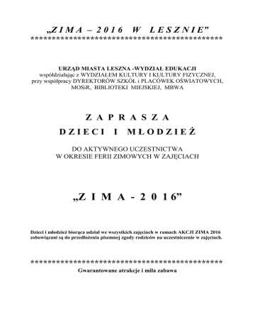 „Z I M A – 2 0 1 6 W L E S Z N I E” ********************************************* URZĄD MIASTA LESZNA -WYDZIAŁ EDUKACJI współdziałając z WYDZIAŁEM KULTURY I KULTURY FIZYCZNEJ, przy współpracy DYREKTORÓW SZKÓŁ i PLACÓWEK OŚWIATOWYCH, MOSiR, BIBLIOTEKI MIEJSKIEJ, MBWA Z A P R A S Z A DZIECI I MŁODZIEŻ DO AKTYWNEGO UCZESTNICTWA W OKRESIE FERII ZIMOWYCH W ZAJĘCIACH „Z I M A - 2 0 1 6” Dzieci i młodzież biorąca udział we wszystkich zajęciach w ramach AKCJI ZIMA 2016 zobowiązani są do przedłożenia pisemnej zgody rodziców na uczestniczenie w zajęciach. ********************************************* Gwarantowane atrakcje i miła zabawa DYŻURNE ŚWIETLICE: I tydzień 18 – 22.01.2016 II tydzień 25 – 29.01.2016 - Szkoła Podstawowa nr 7 - Szkoła Podstawowa nr 2 W zajęciach biorą udział dzieci, które zapisały się w macierzystych szkołach . DYŻURNE STOŁÓWKI – wydawanie obiadów 12.00 – 14.00 od 18 stycznia do 22 stycznia Stołówka przy II Liceum Ogólnokształcącym – ul. B Prusa 33 Stołówka przy Szkole Podstawowej Nr 2 – ul. Narutowicza 57 od 25 stycznia do 29 stycznia Stołówka przy II Liceum Ogólnokształcącym ul. B Prusa 33 Stołówka przy Szkole Podstawowej Nr 1 – Al. Krasińskiego 2 Zgłoszenia na obiady na czas ferii bezpośrednio w dyżurnych stołówkach. Osoby korzystające z dofinansowania MOPR – zgłoszenia z decyzją MOPR. ŚWIETLICE TERAPEUTYCZNE Czynne wszystkie świetlice terapeutyczne w szkołach oraz świetlica w Klubie Młodzieżowym ul. Słowiańska 1 (wejście od Kościelnej) Bezpłatne zajęcia otwarte dla dzieci i młodzieży w wieku szkolnym - od poniedziałku do czwartku w godz. od 10.00 do 13.00 Zajęcia bezpłatne. 2 JEDNODNIOWE ZAJĘCIA REKREACYJNE, SPORTOWE I KOMPUTEROWE. I TYDZIEŃ FERII GODZIN Y 18.01. – 22.01. NAZWA IMPREZY MIEJSCE UWAGI ORGANIZACYJNE I ZASADY UCZESTNICTWA 18 stycznia – poniedziałek SP Nr 2 Narutowicza 57 tel. 529 60 45 SP Nr 4 10.00 -13.00 Sala gimnastyczna tel. 527 00 11 SP Nr 7 9.00 -13.00 10.00 -14.00 Aleje Jana Pawła II 10 9.00 – 12.00 9.00 -11.00 9.00 -11.00 9.00 – 13.00 tel. 520-40-05 SP Nr 9 Wyszyńskiego 57 tel. 520 40 07 SP Nr 10 Jagiellońska 7 tel. 520-40-08 SP Nr 10 Jagiellońska 7 Gimnazjum Nr 9 Szczepanowskiego 14 Tel. 529 98 57 Origami w muzyce Piłka ręczna Warsztaty plastyczne dla dzieci z klas I-III Cieszmy się ruchem i zabawą Warsztaty plastyczne dla dzieci z klas I-III Komputery Zajęcia komputerowe z wykorzystaniem drukarki 3D Technika Origami w połączeniu z piosenką Ilość osób ograniczona – 15 Zajęcia z piłki ręcznej dla klas IV-VI. Lepienie zwierząt z masy solnej. Gry i zabawy integracyjne. Ilość osób ograniczona – 20 Zabawy z szarfą, skakanki, wyścigi rzędów. Obowiązuje obuwie sportowe. Maski karnawałowe. Grafika komputerowa. Prezentacja w Prezi ukazująca wykorzystanie drukarki 3D – pokaz drukarki. 3D. Pokaz programu TinkerCard. Projektowanie figur do wydruku i ich wydruk. Ilość osób ograniczona – 13. Zapisy w sekretariacie. 19 stycznia – wtorek SP Nr 2 Narutowicza 57 tel. 529 60 45 SP Nr 4 10.00 -13.00 Sala gimnastyczna tel. 527 00 11 SP Nr 5 9.00 – 15.00 Łowiecka 50c tel. 527 12 20 9.00 -13.00 Origami w muzyce Wesoło i na sportowo Technika origami w połączeniu z piosenką Ilość osób ograniczona – 15 Gry i zabawy sportowe dla dzieci kas I-III. Wycieczka po mieście. Problematyka Wycieczka do oczyszczania wody poza salą lekcyjną Henrykowa i spacer po Lesznie - Henrykowo. Ilość osób ograniczona – 25 Opłata we własnym zakresie 10,-zł. SP Nr 7 10.00 -14.00 Aleje Jana Pawła II 10 tel. 520-40-05 Warsztaty plastyczne dla dzieci z klas I-III Tworzenie plakatów – wytwarzanie papieru kolorowego. Gry i zabawy integracyjne. Ilość osób ograniczona – 20 3 9.00 – 12.00 SP Nr 9 Komputery Zajęcia muzyczno-taneczne, nauka tańca. Obowiązuje obuwie sportowe. Grafika komputerowa. Sport Siatkówka dla klas V-VI. Zajęcia komputerowe z wykorzystaniem drukarki 3D Projektowanie figur do wydruku. Wydruk figur na drukarce i rozdanie ich uczestnikom zajęć. Gry i zabawy komputerowe. Ilość osób ograniczona – 13. Zapisy w sekretariacie. Taneczne ferie Wyszyńskiego 57 tel. 520 40 07 SP Nr 10 9.00 -11.00 Jagiellońska 7 tel. 520-40-08 SP Nr 10 10.00 -12.00 Jagiellońska 7 9.00 – 13.00 Gimnazjum Nr 9 Szczepanowskiego 14 Tel. 529 98 57 20 stycznia – środa SP Nr 2 Narutowicza 57 9.00 -13.00 tel. 529 60 45 SP Nr 4 Rynek Zaborowski 41 10.00 -13.00 tel. 527 00 11 SP Nr 4 Rynek Zaborowski 41 10.00 -12.00 9.00 – 15.00 SP Nr 5 Łowiecka 50c tel. 527 12 20 Robótki ręczne Szydełkowanie, robienie na drutach. Ilość osób ograniczona – 15 Wesoło i na sportowo Wyjście na łyżwy. Zajęcia komputerowe Zajęcia komputerowe dla młodszych dzieci – Animacja komputerowa. Z wizytą na kręgielni i w Pizza Hut Poznanie tajników robienia pizzy – własnoręcznie robiona pizza. Konkurs wiedzy o Włoszech. Piesza wycieczka na kręgielnię – zawody sportowe. Ilość osób ograniczona – 25 Opłata we własnym zakresie 25,-zł. SP Nr 7 10.00 -14.00 Aleje Jana Pawła II 10 tel. 520-40-05 9.00 – 12.00 SP Nr 9 Wyszyńskiego 57 tel. 520 40 07 SP Nr 10 10.00 -12.00 Jagiellońska 7 tel. 520-40-08 Warsztaty plastyczne dla dzieci z klas I-III Cieszmy się ruchem i zabawą Sport Papier czerpany. Gry i zabawy integracyjne. Ilość osób ograniczona – 20 Zabawy z kółkiem ringo i hulahopem. Ćwiczenia na ławeczkach. Obowiązuje obuwie sportowe. Siatkówka dla klas III-IV.. 21 stycznia – czwartek SP Nr 2 9.00 -13.00 Narutowicza 57 tel. 529 60 45 SP Nr 4 10.00 -13.00 Sala gimnastyczna tel. 527 00 11 SP Nr 7 10.00 -14.00 Aleje Jana Pawła II 10 tel. 520-40-05 Robótki ręczne Szydełkowanie, robienie na drutach. Ilość osób ograniczona – 15 Piłka ręczna Zajęcia z piłki ręcznej dla klas IV-VI. Warsztaty plastyczne dla dzieci z klas I-III Płaskie origami. Gry i zabawy integracyjne. Ilość osób ogranic