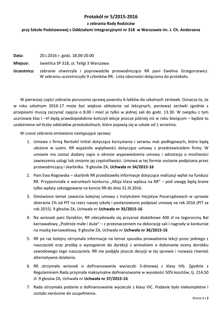 Protokół nr 5/2015-2016 z zebrania Rady Rodziców przy Szkole Podstawowej z Oddziałami Integracyjnymi nr 318 w Warszawie im. J. Ch. Andersena Data: 20.I.2016 r. godz. 18.00-20.00 Miejsce: świetlica SP 318, ul. Teligi 3 Warszawa Uczestnicy: zebranie otworzyła i poprowadziła przewodnicząca RR pani Ewelina Grzegorzewicz. W zebraniu uczestniczyło 9 członków RR. Lista obecności dołączona do protokołu. W pierwszej części zebrania poruszono sprawę powrotu 6-latków do szkolnych zerówek. Oznacza to, że w roku szkolnym 2016-17 może być większe obłożenie sal lekcyjnych, ponieważ zerówki zgodnie z przepisami muszą zaczynać zajęcia o 8.00 i mieć je tylko w jednej sali do godz. 13.30. W związku z tym uczniowie klas I –VI będą prawdopodobnie kończyli lekcje jeszcze później niż w roku bieżącym – będzie to uzależnione od liczby oddziałów przedszkolnych, które pojawią się w szkole od 1 września. W czasie zebrania omówiono następujące sprawy: 1. Umowa z firmą Rentokil Initial dotycząca korzystania i serwisu mat podłogowych, które będą ułożone w szatni. RR wyjaśniła wątpliwości dotyczące umowy z przedstawicielem firmy. W umowie ma zostać dodany zapis o okresie wypowiedzenia umowy i adnotacja o możliwości zawieszenia usługi lub zmianie jej częstotliwości. Umowa w tej formie zostanie podpisana przez przewodniczącą i skarbnika. 9 głosów ZA, Uchwała nr 34/2015-16 2. Pani Ewa Rogowska – skarbnik RR przedstawiła informacje dotyczące realizacji wpłat na fundusz RR. Przypomniała o warunkach konkursu „Moja klasa wpłaca na RR” – pod uwagę będą brane tylko wpłaty zaksięgowane na koncie RR do dnia 31.III.2016. 3. Omówiono temat zawarcia kolejnej umowy z Instytutem Inicjatyw Pozarządowych w sprawie zbierania 1% od PIT na rzecz naszej szkoły i postanowiono podpisać umowę na rok 2016 (PIT za rok 2015). 9 głosów ZA, Uchwała nr Uchwała nr 35/2015-16 4. Na wniosek pani Dyrektor, RR zdecydowała się przyznać dodatkowe 400 zł na tegoroczny Bal karnawałowy „Podróże małe i duże” – z przeznaczeniem na dekorację sali i nagrody w konkursie na maskę karnawałową. 9 głosów ZA, Uchwała nr Uchwała nr 36/2015-16 5. RR po raz kolejny otrzymała informacje na temat sposobu prowadzenia lekcji przez jednego z nauczycieli oraz prośbę o wystąpienie do dyrekcji z wnioskiem o dokonanie oceny dorobku zawodowego tego nauczyciela. RR nie podjęła jeszcze decyzji w tej sprawie i rozważa również alternatywne działania. 6. RR otrzymała wniosek o dofinansowanie wycieczki 3-dniowej z klasy IVb. Zgodnie z Regulaminem Rada przyznała maksymalne dofinansowanie w wysokości 50% kosztów, tj. 214,50 zł. 9 głosów ZA, Uchwała nr Uchwała nr 37/2015-16 7. Rada otrzymała podanie o dofinansowanie wycieczki z klasy VIC. Podanie było niekompletne i zostało zwrócone do uzupełnienia. Strona 1 z 2 8. RR otrzymała ofertę od fotografa na wykonanie reportaży z różnych uroczystości i imprez szkolnych. Oferta jest dołączona do protokołu. 9. RR postanowiła złożyć do Burmistrza Ursynowa pismo z zapytaniem o termin montażu źródełka w SP 318. 9 głosów ZA, Uchwała nr Uchwała nr 38/2015-16 10. Rodzice zgłaszają potrzebę możliwości wyboru przez dziecko napoju do obiadu, by oprócz napoju z menu (kompotu czy soku) dostępna była woda. RR przekaże prośbę Dyrekcji. 11. Termin wykonania zdjęć klasowych został ustalony z fotografem na wtorek, środę i czwartek po feriach (16-18.II.2016 r.). Jednocześnie Rada zwróci się z prośbą do pani Dyrektor o wskazanie i udostępnienie w poniedziałek 15.II.2016 r. miejsca do przygotowania scenografii oraz o przygotowanie grafiku wykonywania zdjęć poszczególnym klasom i wszystkim nauczycielom. Przewidywany czas sesji – około 1 godziny na klasę. Zdjęcia rodzinne będą wykonywane prawdopodobnie w dn. 17 lub 18.II. w godz. 16.30-19.00. Osoby chętne do zamówienia takiego zdjęcia (np. z rodzicami, z rodzeństwem itp.) proszone będą o przychodzenie w wyznaczonych terminach. Szczegółowe informacje zostaną przesłane przez Librusa oraz podane na tablicy ogłoszeń. 12. RR jest w trakcie testowania swojej strony internetowej: www.rrsp318.pl Bardzo serdecznie dziękujemy za jej przygotowanie jednemu z rodziców, który prosił o zachowanie anonimowości. Dzięki tej pomocy strona powstała ekspresowo. RR własnymi siłami próbowała zmierzyć się z tym problemem od września ale pomoc specjalisty okazała się niezbędna. 13. Rada otrzymała informację od pani Pedagog, że w dniu zebrań klasowych (27 stycznia 2016 r.) wolontariusze z naszej szkoły będą sprzedawali kalendarze-cegiełki na 2016 r. na rzecz hospicjum onkologicznego. Cena 20 zł. Zachęcamy do wsparcia akcji „Pola nadziei”. Kolejne zebranie RR odbędzie się 24.II.2016 r. Przewodnicząca Sekretarz Strona 2 z 2