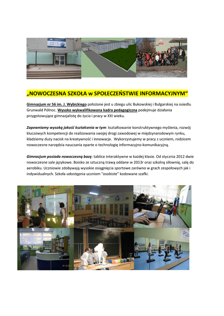 „NOWOCZESNA SZKOŁA w SPOŁECZEŃSTWIE INFORMACYJNYM“ Gimnazjum nr 56 im. J. Wybickiego położone jest u zbiegu ulic Bukowskiej i Bułgarskiej na osiedlu Grunwald Północ. Wysoko wykwalifikowana kadra pedagogiczna podejmuje działania przygotowujące gimnazjalistę do życia i pracy w XXI wieku. Zapewniamy wysoką jakość kształcenia w tym: kształtowanie konstruktywnego myślenia, rozwój kluczowych kompetencji do realizowania swojej drogi zawodowej w międzynarodowym rynku, kładziemy duży nacisk na kreatywność i innowacje. Wykorzystujemy w pracy z uczniem, rodzicem nowoczesne narzędzia nauczania oparte o technologię informacyjno-komunikacyjną. Gimnazjum posiada nowoczesną bazę: tablice interaktywne w każdej klasie. Od stycznia 2012 dwie nowoczesne sale językowe. Boisko ze sztuczną trawą oddane w 2013r oraz szkolną siłownię, salę do aerobiku. Uczniowie zdobywają wysokie osiągnięcia sportowe zarówno w grach zespołowych jak i indywidualnych. Szkoła udostępnia uczniom "osobiste" kodowane szafki. Każda klasa posiada łącze internetowe i komputer dla nauczyciela a szkoła pokryta zasięgiem WiFi, uczniowie mogą korzystać z udostępnionego hot-spotu. Pracujemy jednozmianowo, lekcje kończą się o godzinie 15:05 po czym rozpoczynają się różnorodne zajęcia dodatkowe: wspomagające i rozwijające i doskonalące różnorodne umiejętności. Od kilku lat prowadzimy dzienniczek internetowy: –jako formę bezpośredniej informacji o postępach uczniów dla rodziców oraz comiesięczne konferencje wspomagające proces wychowawczo-edukacyjny. Zapewniamy uczniom opiekę medyczną stomatologa i szkolnej pielęgniarki, dla łasuchów szkolny barek „Smaczek” oferuje smaczne i zdrowe produkty. Budynek szkolny jest monitorowany. Współpracujemy z Wydziałem Prewencji Policji Poznań –Grunwald, odbywają się spotkania w ramach programu „Bezpieczna szkoła”, oraz „Szkoła wolna od przemocy i narkotyków –uzyskując kolejne certyfikaty. "SZOK !" to, - Szkolny Ośrodek Kariery" – pozwalający na planowanie i wybór dalszego kształcenia lub nauki zawodu, przygotowując ucznia do życia i pracy w XXI wieku. Każdy uczeń zna swój styl uczenia co zwiększa jego efektywność i wyniki w nauce. Łatwo zauważysz, że zależy mam byś rozwijał swoje kluczowe kompetencje, które pomogą osiągnąć Tobie sukces edukacyjny, będziesz umiał radzić sobie w zmieniającej się rzeczywistości. We wszystkich proponowanych klasach uczniowie uczyć się będą 2 języków obcych: języka angielskiego, języka niemieckiego. Dla zainteresowanych uczniów zajęcia językowe odbywać się będą w systemie rozszerzonym. Potrzeby nauki innych języków obcych będą rozpoznawane z możliwością ich realizacji w grupach między oddziałowych, w nowoczesnej sali językowej, uczestnicząc w projekcie „e-Twinning”. NASZE ATUTY: - stymulowanie indywidualnego rozwoju ucznia, - edukacja i doradztwo zawodowe, - stosowanie nowoczesnych, aktywnych metod nauczania, - realizacja edukacji przygotowującej do życia i pracy w XXI wieku. Realizowane poprzez: - e-klasy, - klasy językowe, - klasy TECHNET –informatyczne, -klasy sportowo-taneczne, -klasy artystyczne, -klasy biologiczno-chemiczne, - zajęcia plastyczne, artystyczne, sportowe, - debaty, projekty, -zajęcia pozalekcyjne Gimnazjum uzyskało certyfikaty: -certyfikat „Szkoły z klasą” I i II edycji - „LEGO, COGITO, AGO” - Czytam, myślę, działam, -certyfikat – „Raban”, - certyfikat „Wolnego i Otwartego Oprogramowania w Szkole”, - certyfikat Jakości "Szkoła Przedsiębiorczości" –jako jedyne Gimnazjum w Poznaniu, - certyfikat „Szkoła wolna od narkotyków i przemocy”, -certyfikat „Echa Poznańskiego Czerwca 56”, - certyfikat „Szkoła bez przemocy” – 2009/2010; 2010/2011, 2011/2012; 2012/2013, 2013/2014, - certyfikat „Reba” – zbierając baterie – chronimy środowisko, -certyfikat „Otwarta szkoła”, -certyfikat „Szkoła 2,0" – I edycja, „Szkoła ekspercka” 2013/2014, -certyfikat „WF z klasą”. Uczestnictwo w corocznym Ogólnopolskim Dniu Kariery umożliwia naszym uczniom promowanie swoich zainteresowań poprzez uczestnictwo w warsztatach przygotowanych przez CDZ. Sprzyja to, rozwijaniu twórczego myślenia, samokształcenia i doskonalenia pracy nauczycieli w tym zakresie, wspomaga rodziców w wiedzy i tworzeniu partnerstwa wychowawczo-edukacyjnego wpisując się w całoroczną ideę organizowania „Forum Osiągnięć Twórczych” -promując innowacyjność i twórcze myślenie każdego ucznia. Realizowane projekty: - „Szkolny Ośrodek Kariery” – kontynuacja, - „E-learning” – nauczanie na odległość, - „Forum Osiągnięć Twórczych”, -„Ogólnopolski Tydzień Kariery”, - „Szkoła Wolna od Przemocy i Narkotyków”, - „Szkoła bez przemocy” – projekt społeczny, - „Cyberprzestrzeń w innowacyjnym nauczaniu gimnazjalisty”, - „Szkoła 2,0 - II edycja. Uczniowie biorą również udział w realizacji różnych projektów, warsztatach, konferencjach i debatach. DOJAZD: Budynek Gimnazjum znajduje się przy ulicy Promyk 4 na pograniczu dwóch dzielnic Poznania Grunwaldu i Jeżyc. Teren Gimnazjum wyznaczają ulice: Bukowska, Swoboda, Marcelińska i Bułgarska. Dojazd do szkoły możliwy jest autobusami: - nr 59,77,78 - przystanek ul. Piękna- Swoboda - nr 63, 82 i 91 - przystanek ul. Brzask. Historia szkoły: Gimnazjum nr 56 im. J. Wybickiego w Poznaniu powołane zostało Uchwałą Rady Miasta Poznania 1 września 1999 roku. Patronem Szkoły od 2002r. jest Józef Wybicki - wybitny człowiek, patriota, twórca hymnu narodowego. Szkoła posiada sztandar ufundowany przez Radę Rodziców w 2004r. Koła zainteresowań: Oferta zajęć dodatkowych wynika z potrzeb uczniów. Udział w zajęciach umożliwia samorealizację oraz przygotowanie do uczestnictwa w konkursach przedmiotowych. Młodzież jest motywowana do udziału w licznych akc