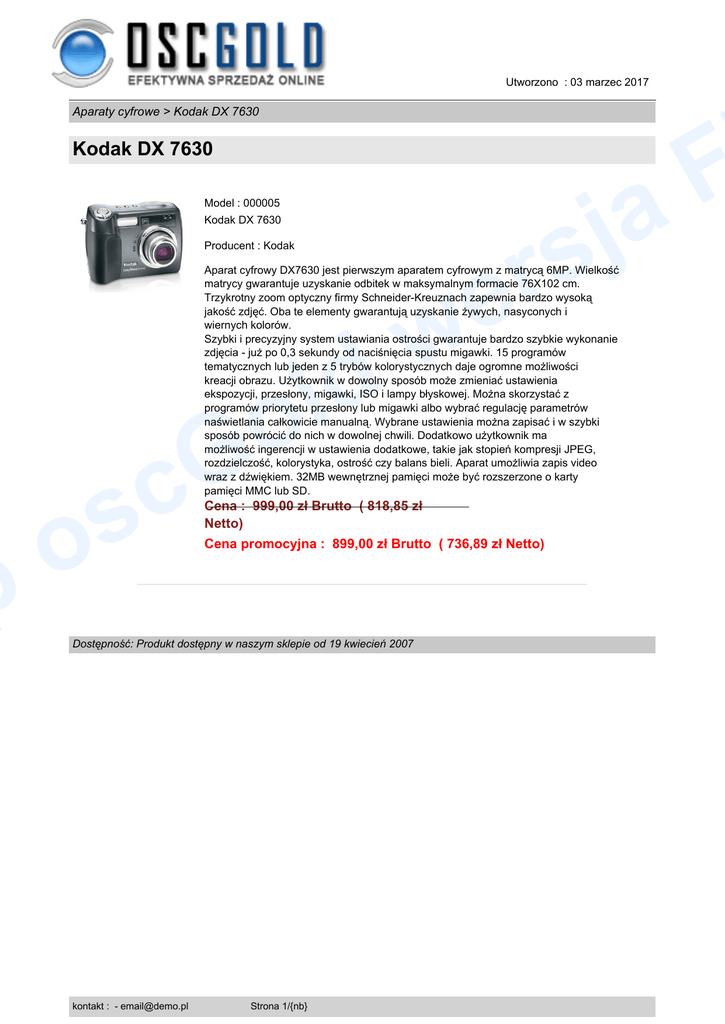 p Utworzono : 03 marzec 2017 Aparaty cyfrowe > Kodak DX 7630 F a Kodak DX 7630 Model : 000005 Kodak DX 7630 Producent : Kodak s o j s r e w Aparat cyfrowy DX7630 jest pierwszym aparatem cyfrowym z matrycą 6MP. Wielkość matrycy gwarantuje uzyskanie odbitek w maksymalnym formacie 76X102 cm. Trzykrotny zoom optyczny firmy Schneider-Kreuznach zapewnia bardzo wysoką jakość zdjęć. Oba te elementy gwarantują uzyskanie żywych, nasyconych i wiernych kolorów. Szybki i precyzyjny system ustawiania ostrości gwarantuje bardzo szybkie wykonanie zdjęcia - już po 0,3 sekundy od naciśnięcia spustu migawki. 15 programów tematycznych lub jeden z 5 trybów kolorystycznych daje ogromne możliwości kreacji obrazu. Użytkownik w dowolny sposób może zmieniać ustawienia ekspozycji, przesłony, migawki, ISO i lampy błyskowej. Można skorzystać z programów priorytetu przesłony lub migawki albo wybrać regulację parametrów naświetlania całkowicie manualną. Wybrane ustawienia można zapisać i w szybki sposób powrócić do nich w dowolnej chwili. Dodatkowo użytkownik ma możliwość ingerencji w ustawienia dodatkowe, takie jak stopień kompresji JPEG, rozdzielczość, kolorystyka, ostrość czy balans bieli. Aparat umożliwia zapis video wraz z dźwiękiem. 32MB wewnętrznej pamięci może być rozszerzone o karty pamięci MMC lub SD. G c d l o Cena : 999,00 zł Brutto ( 818,85 zł Netto) Cena promocyjna : 899,00 zł Brutto ( 736,89 zł Netto) Dostępność: Produkt dostępny w naszym sklepie od 19 kwiecień 2007 kontakt : - [email protected] Strona 1/{nb}