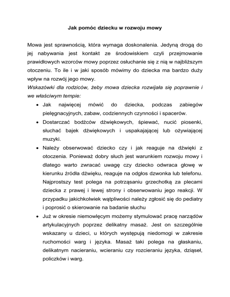 Jak pomóc dziecku w rozwoju mowy Mowa jest sprawnością, która wymaga doskonalenia. Jedyną drogą do jej nabywania jest kontakt ze środowiskiem czyli przejmowanie prawidłowych wzorców mowy poprzez osłuchanie się z nią w najbliższym otoczeniu. To ile i w jaki sposób mówimy do dziecka ma bardzo duży wpływ na rozwój jego mowy. Wskazówki dla rodziców, żeby mowa dziecka rozwijała się poprawnie i we właściwym tempie: Jak najwięcej mówić do dziecka, podczas zabiegów pielęgnacyjnych, zabaw, codziennych czynności i spacerów. Dostarczać bodźców dźwiękowych, śpiewać, nucić piosenki, słuchać bajek dźwiękowych i uspakajającej lub ożywiającej muzyki. Należy obserwować dziecko czy i jak reaguje na dźwięki z otoczenia. Ponieważ dobry słuch jest warunkiem rozwoju mowy i dlatego warto zwracać uwagę czy dziecko odwraca głowę w kierunku źródła dźwięku, reaguje na odgłos dzwonka lub telefonu. Najprostszy test polega na potrząsaniu grzechotką za plecami dziecka z prawej i lewej strony i obserwowaniu jego reakcji. W przypadku jakichkolwiek wątpliwości należy zgłosić się do pediatry i poprosić o skierowanie na badanie słuchu Już w okresie niemowlęcym możemy stymulować pracę narządów artykulacyjnych poprzez delikatny masaż. Jest on szczególnie wskazany u dzieci, u których występują niedomogi w zakresie ruchomości warg i języka. Masaż taki polega na głaskaniu, delikatnym nacieraniu, wcieraniu czy rozcieraniu języka, dziąseł, policzków i warg.