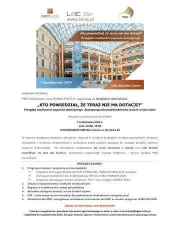 Szanowni Państwo, PNO Consultants oraz KGHM LETIA S.A. zapraszają na bezpłatne seminarium: „KTO POWIEDZIAŁ, ŻE TERAZ NIE MA DOTACJI?” Przegląd możliwości wsparcia dotacyjnego dostępnego dla przedsiębiorstw jeszcze w tym roku! Sprawdź czy dotacja jest dla Ciebie! 7 PAŹDZIERNIKA 2014 R. GODZ. 10:00- 13:00 LETIA BUSINESS CENTER, LEGNICA, UL. RYCERSKA 24 W obecnie dostępnej układance dotacyjnej, złożonej ze środków krajowych, środków brukselskich, funduszy norweskich i funduszy strukturalnych z pewnością każdy znajdzie pasujący do swojego projektu element wsparcia finansowego. Na seminarium podpowiemy jak teraz skorzystać z dotacji oraz jaki projekt kwalifikuje się pod jaki konkurs. Seminarium poprowadzi Tomasz Hoffmann – prezes Zarządu PNO Consultants. PRZEDSTAWIMY: 1. 2. 3. 4. 5. 6. Programy ramowe i programy unii europejskiej  programy promujące działalność B+R: EUROSTARS, HORIZON 2020, EcoInnovation  promujące działalności pro-środowiskową: LIFE oraz także HORIZON 2020  programy stymulujące rozwój transportu: TEN-T oraz następca MARCO POLO Zmiany w dysponowaniu środkami strukturalnymi Regiony w kształtowaniu nowej perspektywy Aktualnie dostępne dotacje, w tym środki krajowe OZE – jakie wsparcie na inwestycje dla podniesienia efektywności energetycznej? Ułatwienia dla MŚP; szczegółowe omówienie instrumentu dla MŚP w ramach programu HORIZON 2020. UDZIAŁ W SPOTKANIU JEST BEZPŁATNY! Prosimy o wypełnienie i przesłanie formularza zgłoszeniowego na adres e-mail: [email protected] - najpóźniej do 3 października 2014. Decyduje kolejność zgłoszeń. Potwierdzenia uczestnictwa dokonywane będą drogą mailową.
