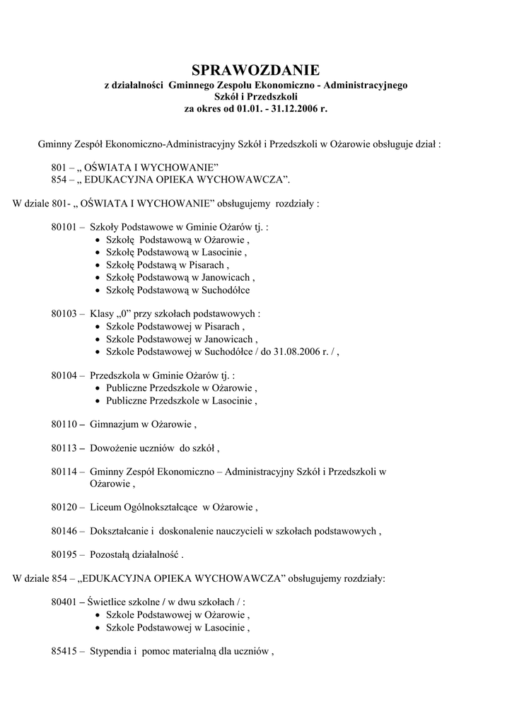 SPRAWOZDANIE z działalności Gminnego Zespołu Ekonomiczno - Administracyjnego Szkół i Przedszkoli za okres od 01.01. - 31.12.2006 r. Gminny Zespół Ekonomiczno-Administracyjny Szkół i Przedszkoli w Ożarowie obsługuje dział : 801 – „ OŚWIATA I WYCHOWANIE” 854 – „ EDUKACYJNA OPIEKA WYCHOWAWCZA”. W dziale 801- „ OŚWIATA I WYCHOWANIE” obsługujemy rozdziały : 80101 – Szkoły Podstawowe w Gminie Ożarów tj. : • Szkołę Podstawową w Ożarowie , • Szkołę Podstawową w Lasocinie , • Szkołę Podstawą w Pisarach , • Szkołę Podstawową w Janowicach , • Szkołę Podstawową w Suchodółce 80103 – Klasy „0” przy szkołach podstawowych : • Szkole Podstawowej w Pisarach , • Szkole Podstawowej w Janowicach , • Szkole Podstawowej w Suchodółce / do 31.08.2006 r. / , 80104 – Przedszkola w Gminie Ożarów tj. : • Publiczne Przedszkole w Ożarowie , • Publiczne Przedszkole w Lasocinie , 80110 – Gimnazjum w Ożarowie , 80113 – Dowożenie uczniów do szkół , 80114 – Gminny Zespół Ekonomiczno – Administracyjny Szkół i Przedszkoli w Ożarowie , 80120 – Liceum Ogólnokształcące w Ożarowie , 80146 – Dokształcanie i doskonalenie nauczycieli w szkołach podstawowych , 80195 – Pozostałą działalność . W dziale 854 – „EDUKACYJNA OPIEKA WYCHOWAWCZA” obsługujemy rozdziały: 80401 – Świetlice szkolne / w dwu szkołach / : • Szkole Podstawowej w Ożarowie , • Szkole Podstawowej w Lasocinie , 85415 – Stypendia i pomoc materialną dla uczniów , 85446 – Dokształcanie i doskonalenie nauczycieli w placówkach przedszkolnych. 85495 – Pozostałą działalność. Łącznie obsługujemy: • • • • 1 1 5 2 liceum Ogólnokształcące , gimnazjum , szkół podstawowych , publiczne przedszkola . W placówkach oświatowo – wychowawczych Gminy Ożarów zatrudnionych jest 238 pracowników w tym 15 sezonowych. Pracownicy sezonowi to palacze centralnego ogrzewania zatrudnieni w okresie sezonu grzewczego. W grupie 238 pracowników zatrudnionych jest 192 kobiet i 46 mężczyzn. Stan zatrudnienia na dzień 31.12.2006 r. (w osobach) Lp. 1. Nazwa Placówki Liceum Ogólnokształcące w Ożarowie Gimnazjum w Ożarowie Szkoła Podstawowa 3. w Ożarowie Szkoła Podstawowa 4. w Lasocinie Szkoła Podstawowa 5. w Pisarach Szkoła Podstawowa 6. w Janowicach Szkoła Podstawowa 7. w Suchodółce Publiczne Przedszkole w 8. Ożarowie Publiczne Przedszkole 9. w Lasocinie 10. GZEASiP w Ożarowie 2. x Razem: Liczba nauczycieli Liczba pracowników obsługowych Liczba pracowników administracyjnych Razem 8 3 0 11 40 7 0 47 40 19 4 63 15 7 1 23 13 5 0 18 13 6 0 19 11 5 0 16 17 15 1 33 2 1 0 3 0 0 5 5 159 68 11 238 Średnie zatrudnienie na dzień 31.12.2006 r. 2 ( w przeliczeniu na etaty ) Lp. 1. Nazwa Placówki Liczba nauczycieli Liczba pracowników obsługowych Liczba pracowników administracyjnych Razem 6,89 3,00 0 9,89 39,32 7,00 0 46,32 41,45 16,50 4,00 61,95 13,29 5,11 1,00 19,40 13,19 3,24 0 16,43 12,30 4,40 0 16,70 11,17 2,97 0 14,14 16,06 12,78 1,00 29,84 1,98 1,00 0 2,98 0 0 4,50 4,50 155,65 56,00 10,50 222,15 Liceum Ogólnokształcące w Ożarowie Gimnazjum w Ożarowie Szkoła Podstawowa 3. w Ożarowie Szkoła Podstawowa 4. w Lasocinie Szkoła Podstawowa 5. w Pisarach Szkoła Podstawowa 6. w Janowicach Szkoła Podstawowa 7. w Suchodółce Publiczne Przedszkole w 8. Ożarowie Publiczne Przedszkole 9. w Lasocinie 10. GZEASiP w Ożarowie 2. Razem: x Liczba dzieci w placówkach wychowania przedszkolnego w roku szkolnym 2006/2007 Lp. Nazwa placówki Liczba dzieci Liczba oddziałów 1. Publiczne Przedszkole w Ożarowie 190 8 2. Publiczne Przedszkole w Lasocinie 25 1 x Razem: 215 9 Liczba uczniów w placówkach szkolnych w roku szkolnym 2006/2007 3 Lp. Nazwa placówki Liczba uczniów Liczba oddziałów 1. 72 3 2. Liceum Ogólnokształcące w Ożarowie Gimnazjum w Ożarowie 429 18 3. Szkoła Podstawowa w Ożarowie 478 21 4. Szkoła Podstawowa w Lasocinie 86 6 5. Szkoła Podstawowa w Pisarach 60 7 6. Szkoła Podstawowa w Janowicach 98 7 7. Szkoła Podstawowa w Suchodółce 49 6 x Razem: 1272 68 Plan wydatków budżetowych na rok 2005 w dziale 801 – „OŚWIATA WYCHOWANIE” oraz w dziale 854 – „EDUKACYJNA OPIEKA WYCHOWAWCZA” i jego wykonanie na dzień 31.12.2006 r. przedstawia się następująco: Lp. Dział Plan w zł Wykonanie w zł Wykonanie w % 1. 801 9 413 829,00 9 384 090,05 99,68 2. 854 240 387,50 239 237,96 99,52 x Ogółem: 9 654 216,50 9 623 328,01 99,68 Wydatki w poszczególnych rozdziałach przedstawiają się według załączników nr 1 i finansowe /. nr 2 / sprawozdania W budżecie 2006 „ OŚWIATA I WYCHOWANIE „ , „ EDUKACYJNA OPIEKA WYCHOWAWCZA” fundusz płac i pochodne stanowią 79,67 % , wydatki pozapłacowe 20,33 % . Płace nauczycieli na rok 2006 określa Uchwała nr XXXVI/239/2005 Rady Miejskiej w Ożarowie z dnia 06 grudnia 2005 r. Płace pracowników nie będących nauczycielami określa uchwała nr XXIX/197/2005 Rady Miejskiej w Ożarowie z dnia 11 kwietnia 2005 r. Wydatki pozapłacowe w obydwu działach tj. w 801 i 854 dotyczą przede wszystkim kosztów związanych z podstawowym funkcjonowaniem placówek oświatowo – wychowaw- czych . Są to koszty związane z zakupem: gazu 4 / ZSO im. E.Szylki w Ożarowie /, energii cieplnej / Publiczne Przedszkole w Ożarowie / , węgla / ZS i P w Lasocinie , SP w Suchodółce , SP w Pisarach, SP w Janowicach / , zakupu energii elektrycznej , wody, usług komunalnych , środków czystości itd. Wydatki pozapłacowe obejmują również koszty związane z remontami przeprowadzonymi w roku 2006. W okresie od 1.01 – 31.12.2006 r. dokonano n/w robót remontowych w następujących placówkach: Placówki Szkolne • Zespół Szkół Ogólnokształcących im. E Szylki w Ożarowie 1/. Kapitalny remont łazienek i stołówki / segment 4.4.1 / / wraz z nadzorem inwestorskim /. - 96 420,80 zł 2/. Wykonanie naprawy kotłowni / wymiana łożysk w silniku i dostawa zabezp