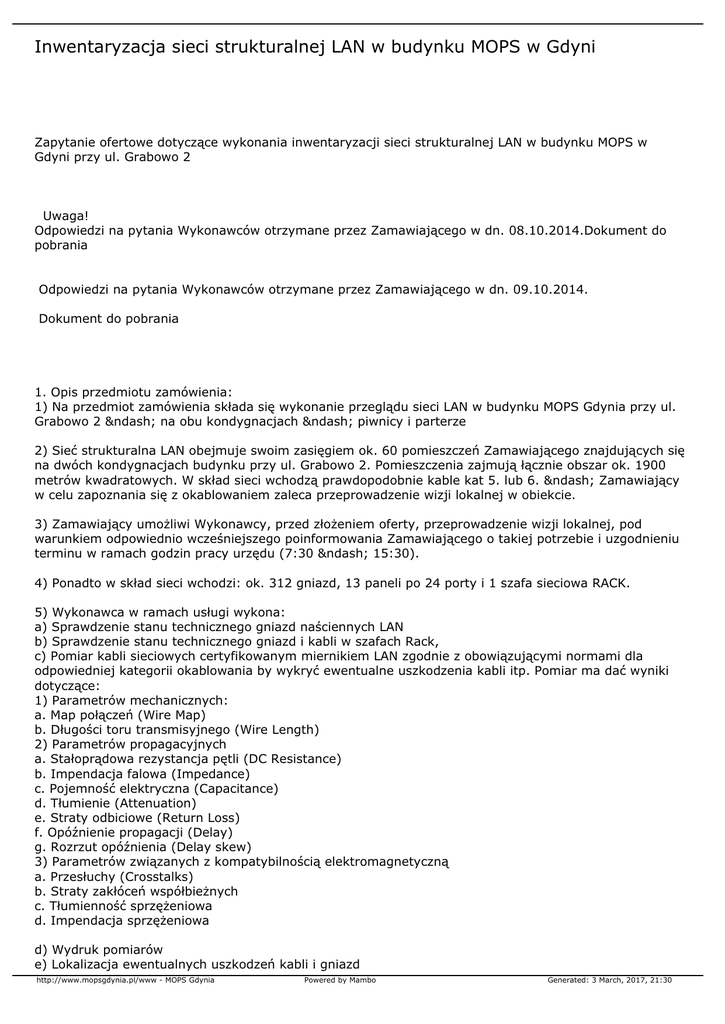 Inwentaryzacja sieci strukturalnej LAN w budynku MOPS w Gdyni Zapytanie ofertowe dotyczące wykonania inwentaryzacji sieci strukturalnej LAN w budynku MOPS w Gdyni przy ul. Grabowo 2 Uwaga! Odpowiedzi na pytania Wykonawców otrzymane przez Zamawiającego w dn. 08.10.2014.Dokument do pobrania Odpowiedzi na pytania Wykonawców otrzymane przez Zamawiającego w dn. 09.10.2014. Dokument do pobrania 1. Opis przedmiotu zamówienia: 1) Na przedmiot zamówienia składa się wykonanie przeglądu sieci LAN w budynku MOPS Gdynia przy ul. Grabowo 2 – na obu kondygnacjach – piwnicy i parterze 2) Sieć strukturalna LAN obejmuje swoim zasięgiem ok. 60 pomieszczeń Zamawiającego znajdujących się na dwóch kondygnacjach budynku przy ul. Grabowo 2. Pomieszczenia zajmują łącznie obszar ok. 1900 metrów kwadratowych. W skład sieci wchodzą prawdopodobnie kable kat 5. lub 6. – Zamawiający w celu zapoznania się z okablowaniem zaleca przeprowadzenie wizji lokalnej w obiekcie. 3) Zamawiający umożliwi Wykonawcy, przed złożeniem oferty, przeprowadzenie wizji lokalnej, pod warunkiem odpowiednio wcześniejszego poinformowania Zamawiającego o takiej potrzebie i uzgodnieniu terminu w ramach godzin pracy urzędu (7:30 – 15:30). 4) Ponadto w skład sieci wchodzi: ok. 312 gniazd, 13 paneli po 24 porty i 1 szafa sieciowa RACK. 5) Wykonawca w ramach usługi wykona: a) Sprawdzenie stanu technicznego gniazd naściennych LAN b) Sprawdzenie stanu technicznego gniazd i kabli w szafach Rack, c) Pomiar kabli sieciowych certyfikowanym miernikiem LAN zgodnie z obowiązującymi normami dla odpowiedniej kategorii okablowania by wykryć ewentualne uszkodzenia kabli itp. Pomiar ma dać wyniki dotyczące: 1) Parametrów mechanicznych: a. Map połączeń (Wire Map) b. Długości toru transmisyjnego (Wire Length) 2) Parametrów propagacyjnych a. Stałoprądowa rezystancja pętli (DC Resistance) b. Impendacja falowa (Impedance) c. Pojemność elektryczna (Capacitance) d. Tłumienie (Attenuation) e. Straty odbiciowe (Return Loss) f. Opóźnienie propagacji (Delay) g. Rozrzut opóźnienia (Delay skew) 3) Parametrów związanych z kompatybilnością elektromagnetyczną a. Przesłuchy (Crosstalks) b. Straty zakłóceń współbieżnych c. Tłumienność sprzężeniowa d. Impendacja sprzężeniowa d) Wydruk pomiarów e) Lokalizacja ewentualnych uszkodzeń kabli i gniazd http://www.mopsgdynia.pl/www - MOPS Gdynia Powered by Mambo Generated: 3 March, 2017, 21:30 f) Wykonanie dokumentacji zawierającej aktualny schemat strukturalny sieci ze szczególnym uwzględnieniem wykonania rysunku technicznego uwzględniającego lokalizacje gniazd w pomieszczeniach. 6) Wykonawca wykona i przekaże Zamawiającemu 3 komplety dokumentacji inwentaryzacyjno – pomiarowej zawierającej między innymi rzuty rzutu budynku oraz schemat blokowy umożliwiający jednoznacznie lokalizację gniazd oraz pokoi bez gniazd. Ponad to dokumentacja powinna obejmować: a. Schemat sprawnej sieci (po wykonaniu napraw opisanych w punkcie g) poniżej) b. Schemat sprawnych (po wykonaniu napraw opisanych w punkcie g) poniżej) i niedziałających elementów sieci (z wyraźnym rozróżnieniem na sprawne i niesprawne elementy) c. Obejmujących schemat niedziałających elementów sieci (po wykonaniu napraw opisanych w punkcie g) poniżej) W opisie należy zawrzeć informacje o ewentualnych uszkodzeniach kabli z podaniem dokładnej lokalizacji i typu uszkodzenia. Dokumentacja ma być przygotowana i przekazana Zamawiającemu w 3 egzemplarzach papierowych oraz jednej edytowalnej wersji elektronicznej zgodnie ze standardem formatu plików .dwg lub .dxf oraz w wyeksportowanej do formatu .pdf wersji. Bieżące usuwanie awarii wynikającej z mechanicznej eksploatacji gniazd lub wynikających z nieprawidłowego podłączenia kabli w gnieździe lub panelu Naprawy powinny obejmować usunięcie awarii wynikających z mechanicznej eksploatacji gniazd lub wynikających z nieprawidłowego podłączenia kabli w gnieździe lub panelu. Naprawy nie mają obejmować wymiany wmurowanych w ściany kabli transmisyjnych. 7) Zamawiający zapewni do współpracy osobę posiadającą niezbędną wiedzę w zakresie oferowanych czynności oraz posiadającą klucze do wszystkich pomieszczeń, w których dokonywane będą czynności kontrolne i naprawcze. 8) Inwentaryzacja ma być przeprowadzana w godzinach pracy urzędu (7:30-15:30) 9) Wykonawca składając ofertę zapewni do wglądu proponowany harmonogram wstępny przeprowadzanych prac. Po podpisaniu umowy Wykonawca przedstawi Zamawiającemu dokładny harmonogram prac (z uwzględnieniem konieczności odłączenia komputerów i sprzętu w poszczególnych pomieszczeniach) aby Zamawiający mógł zorganizować pracę w budynku. 2. Termin realizacji usługi: ostateczny termin zakończenia realizacji usługi to nie później niż 10.11.2014 3. Termin i sposób składania ofert: 1) Wykonawca może złożyć tylko jedną ofertę. 2) Oferty należy przesłać do dnia 10.10.2014 r., do godz. 10:00, na adres e-mail: [email protected] 3) Oferta powinna zawierać ceną netto i brutto za wykonanie całego zakresu przedmiotu zamówienia. 4) Po upływie ww. terminu osoby odpowiedzialne za przeprowadzenie postępowania zweryfikują treść złożonych ofert i dokonają wyboru oferty najkorzystniejszej. 4. Warunki rozeznania rynku 1) O wyborze i uznaniu oferty za najkorzystniejszą zadecyduje całkowita cena oferty brutto przy uwzględnieniu ww. wymagań. Za najkorzystniejszą zostanie uznana oferta z najniższą całkowitą ceną oferty brutto. 2) O wynikach przeprowadzonego rozeznania rynku MOPS Gdynia poinformuje w drodze elektronicznej Wykonawców, którzy złożyli oferty. 3) MOPS Gdynia zastrzega sobie możliwość unieważnienia niniejszego postępowania, w szczególności, gdy ceny zaproponowane przez wykonawców będą wyższe od kwoty, jaka została przeznaczona na sfinansowanie niniejszego zamówienia. Osoby do kontaktu: Magdalena Wawrzyniak – 